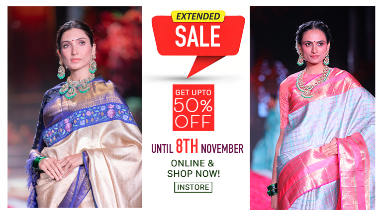 Light Gold Vanki, Rani Pink Chakram, Lilac Vairaoosi, Emerald Kattam, Aqua Kodi Jaal, and Pale Gold Butta Tissue Kanjivaram Sarees.