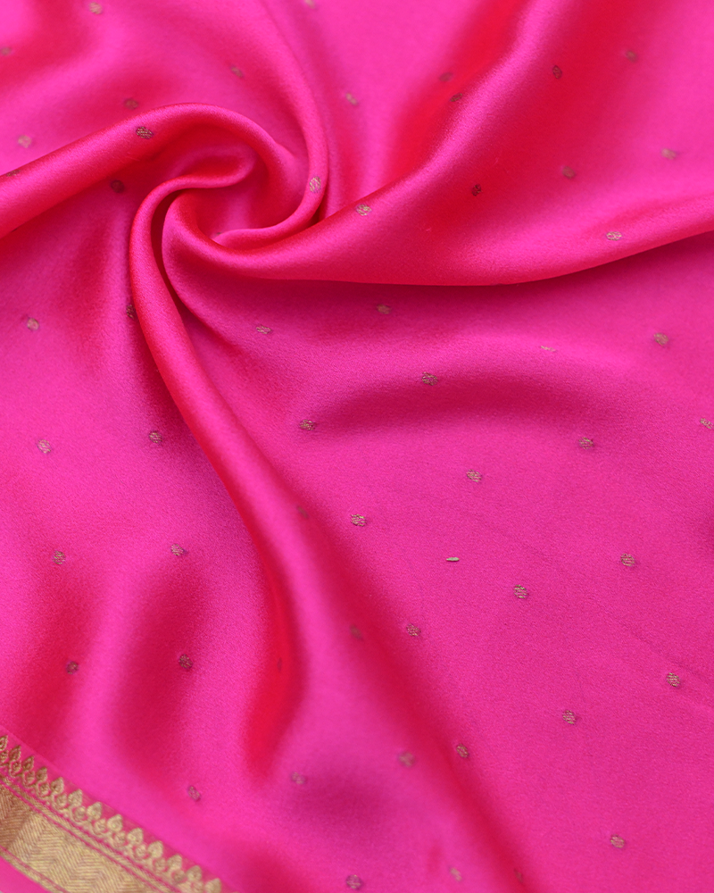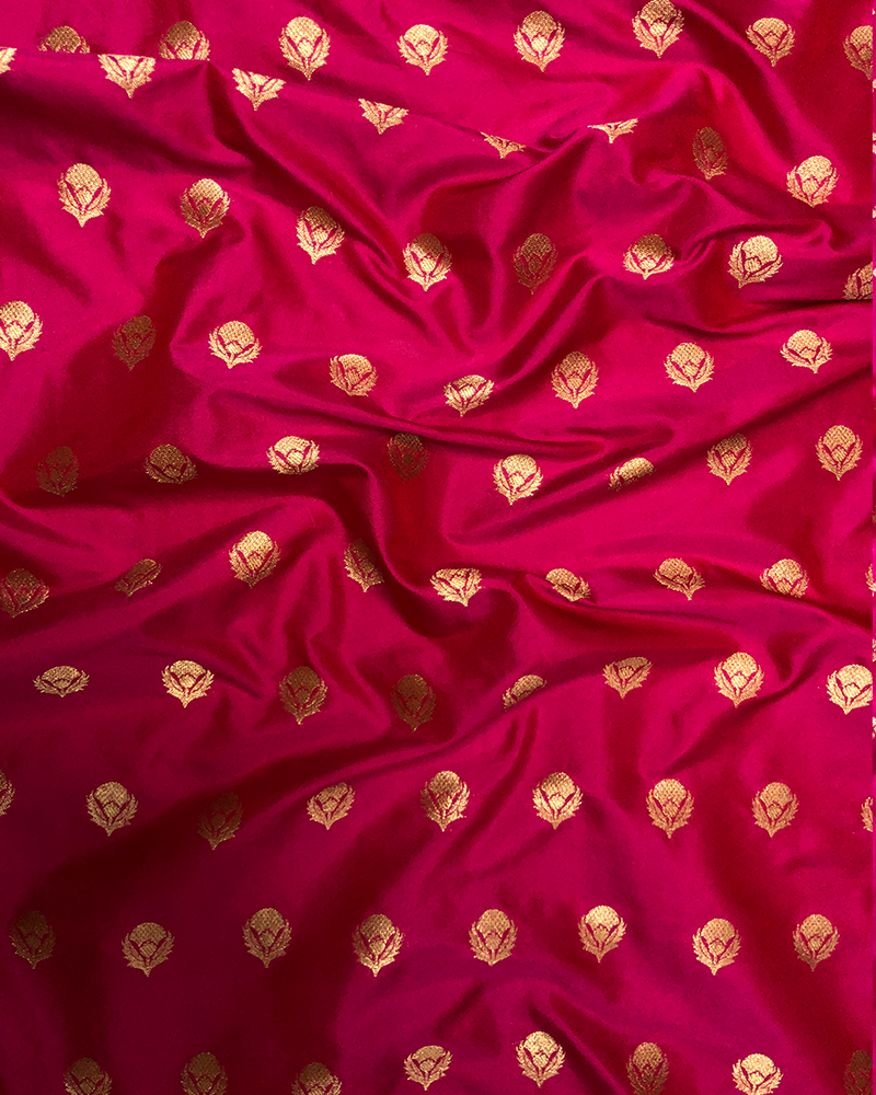 Hot Pink Kanchipattu Fabric with all over Gold & Silver Zari Buttas
