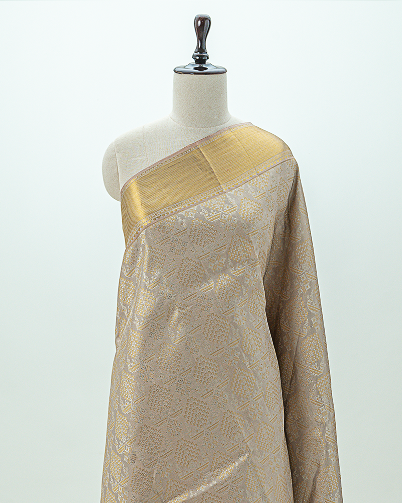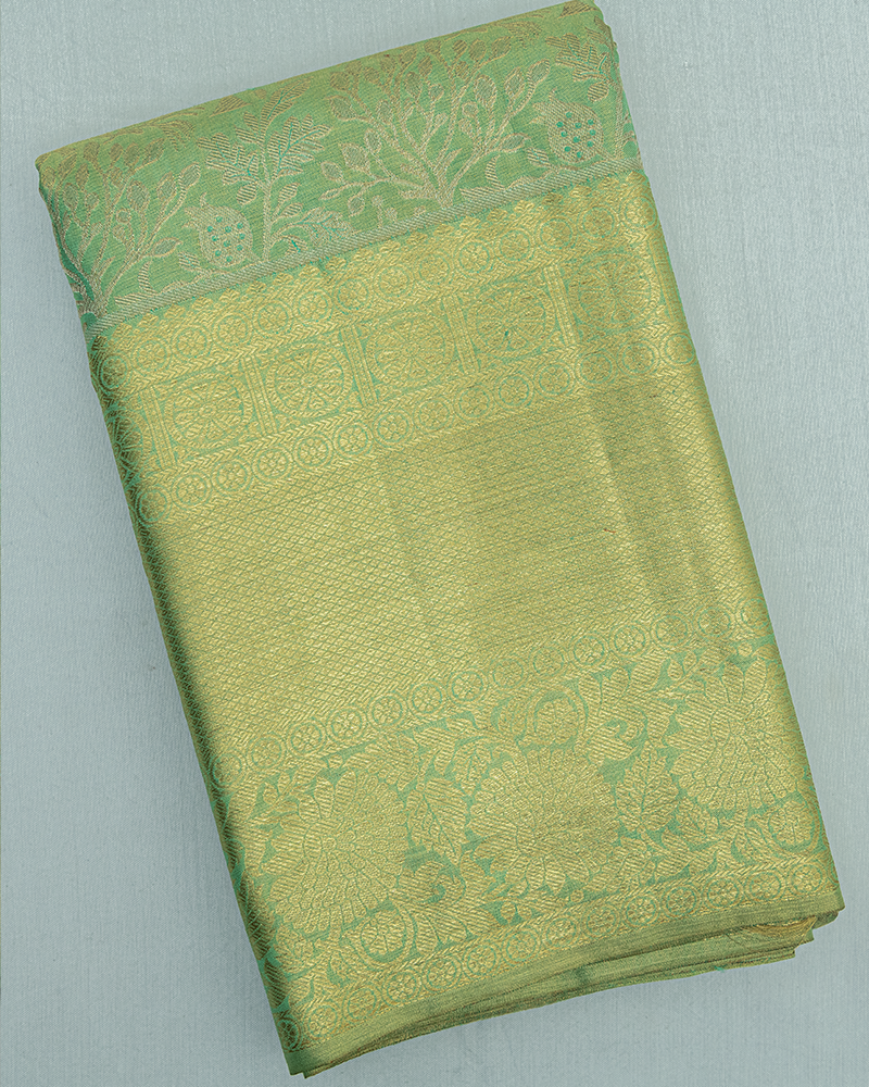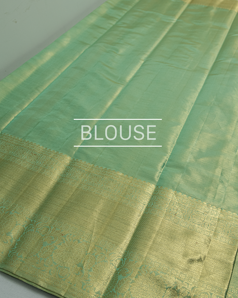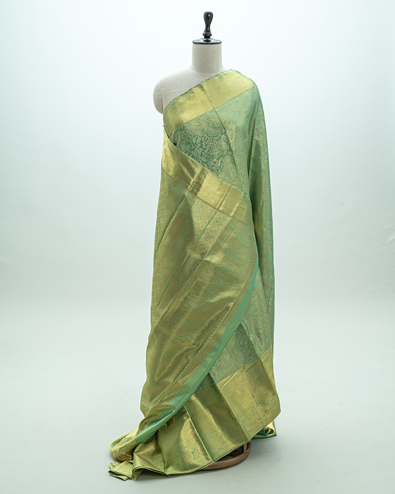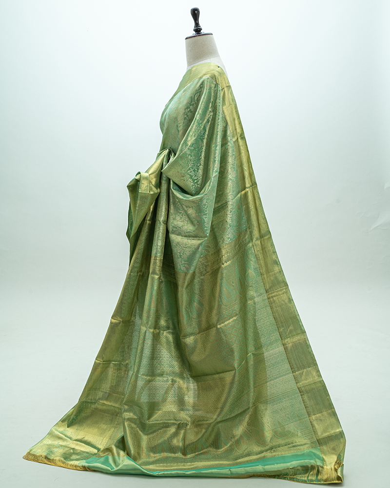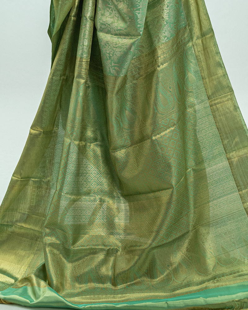 Luminous Aqua Tissue silk with dense floral Velli Buttas, featuring a solid Zari border and rich Pallu for ultimate festive appeal.