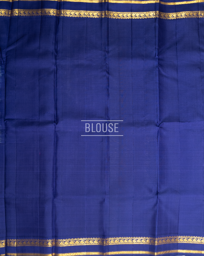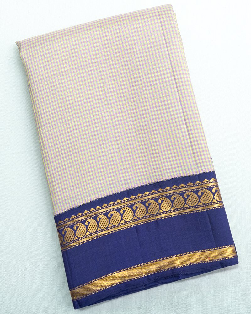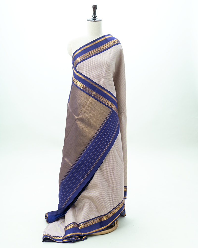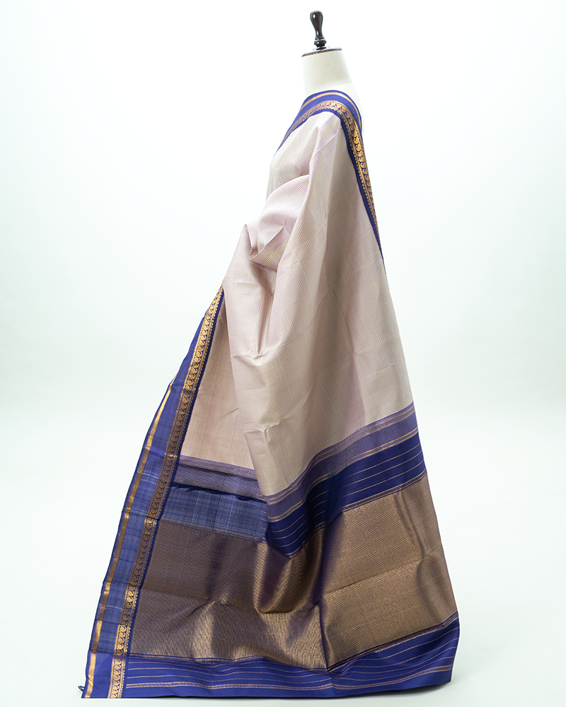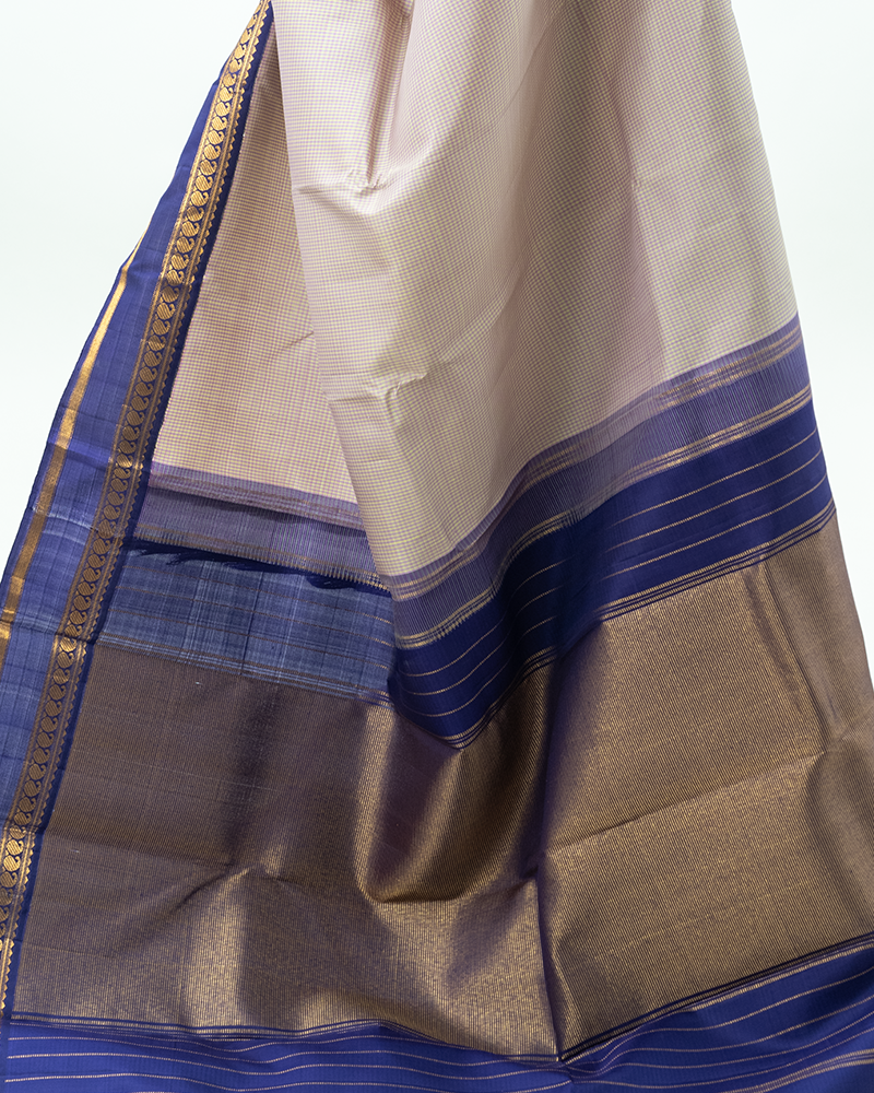 This Kora Maavu (beige) Kanjivaram with Kattam (checks) features a stunning Neelam (blue) Korvai border in rich gold Zari.