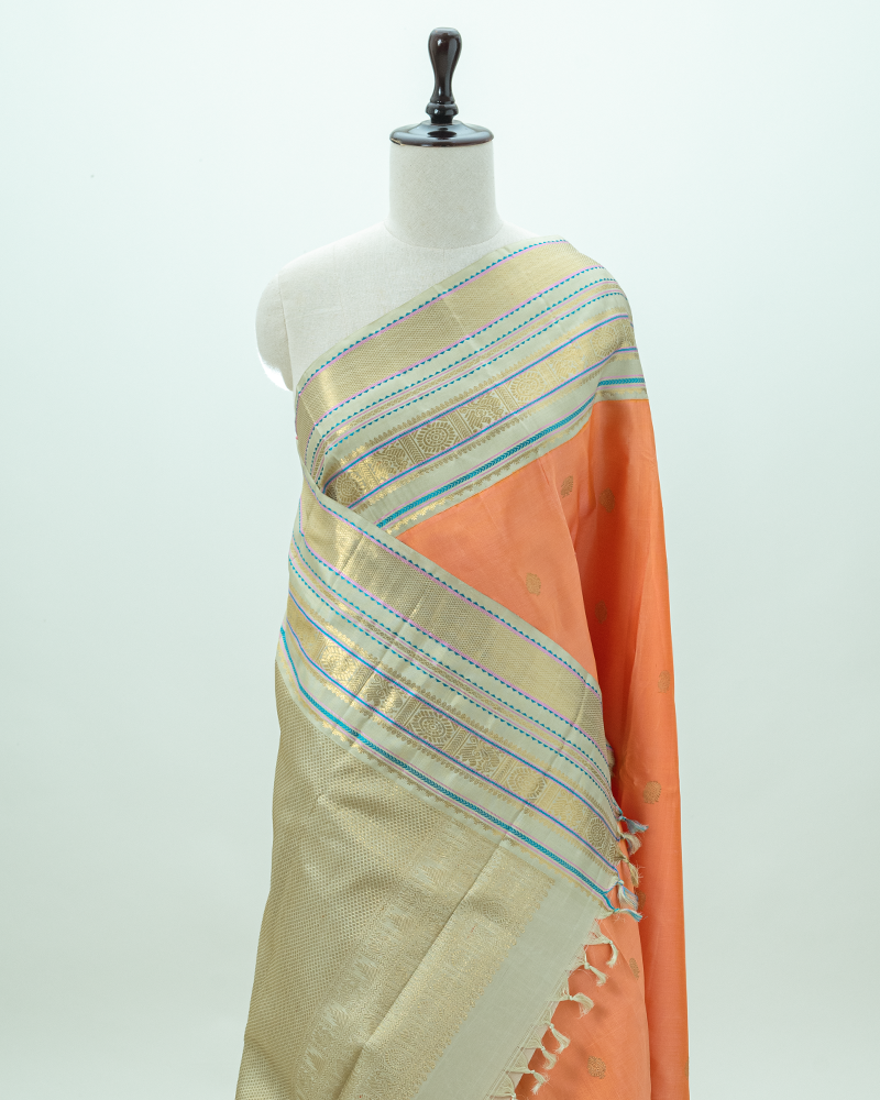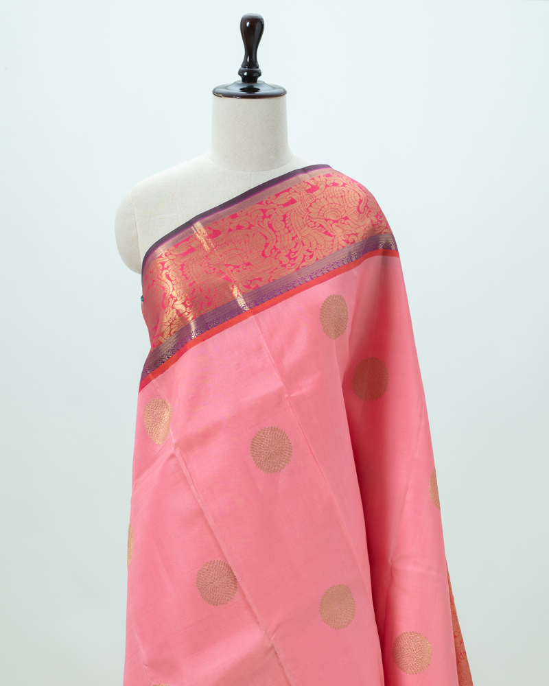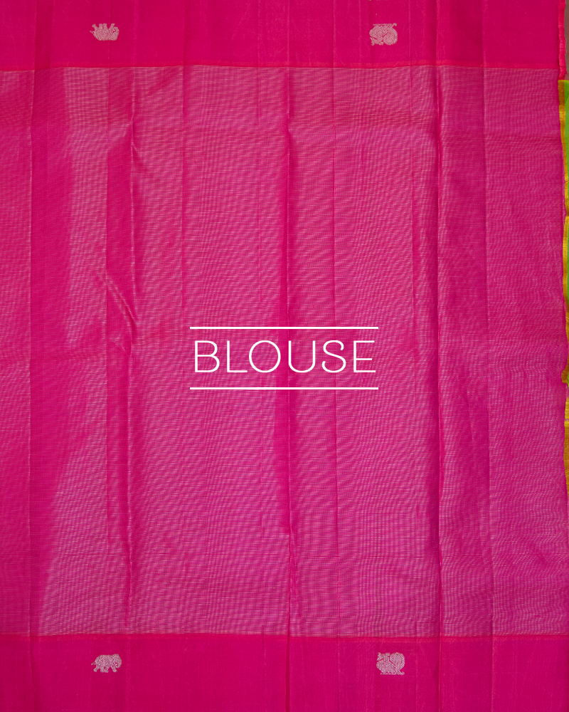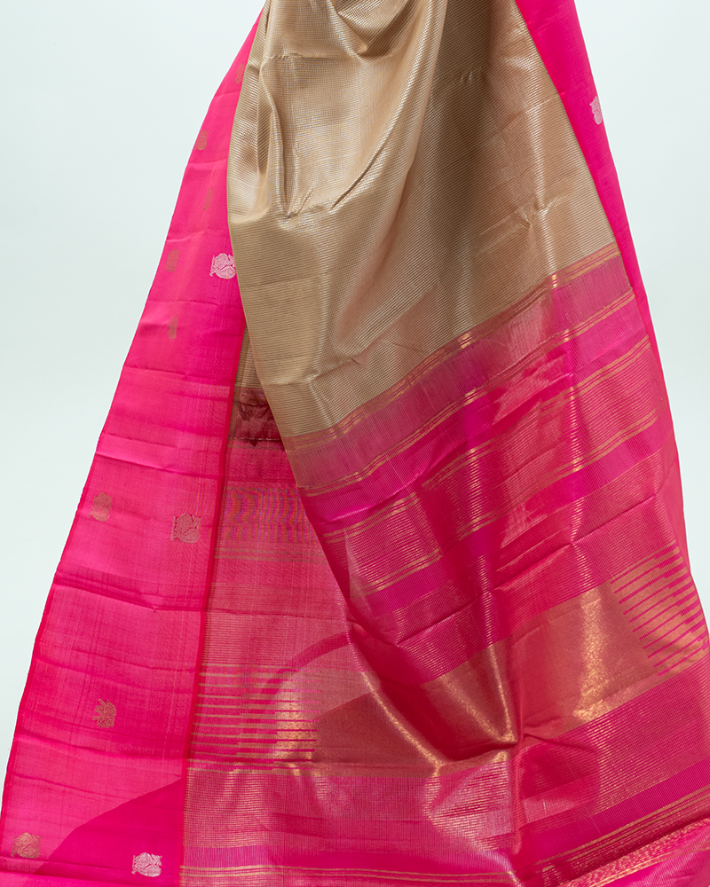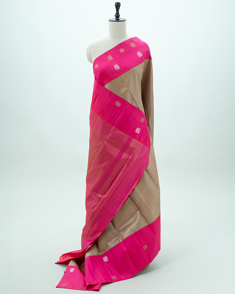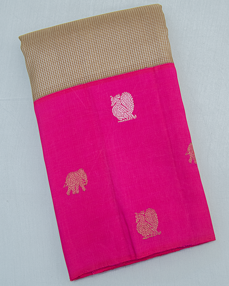 Code:AS1211HSElegant beige Kanjivaram silk saree adorned with silver and gold zari woven elephant and peacock buttas, complemented by a vibrant hot pink border and pallu for timeless grace.