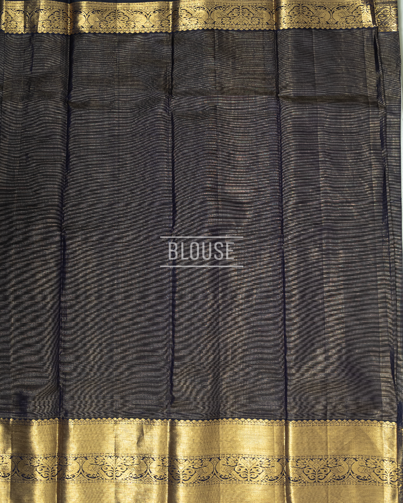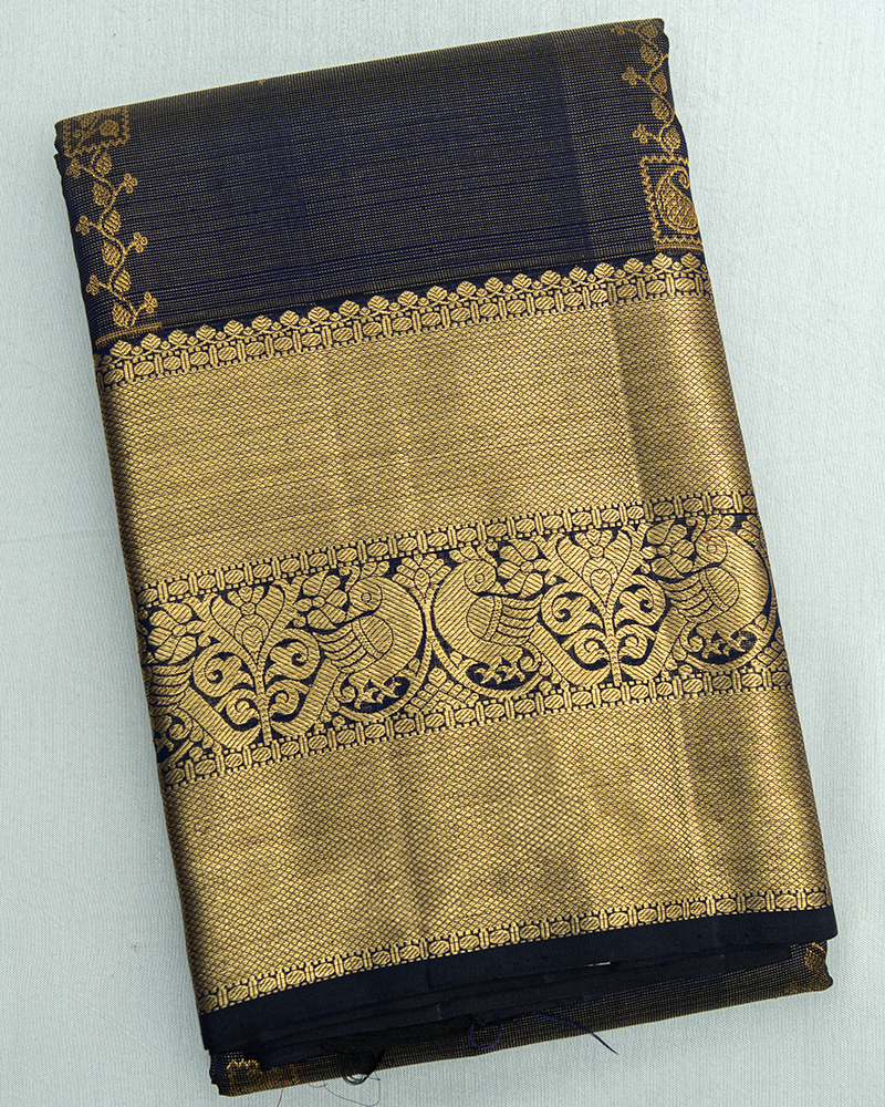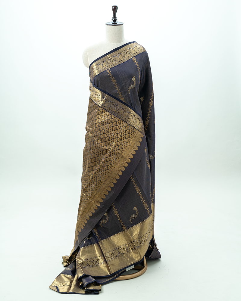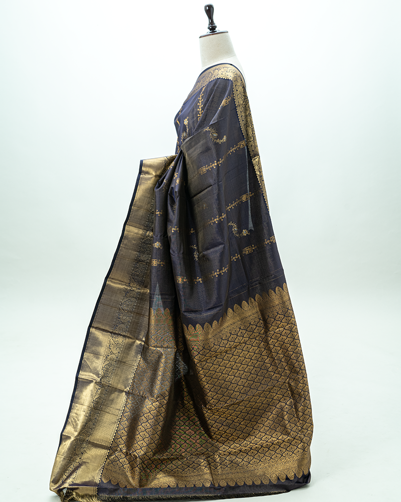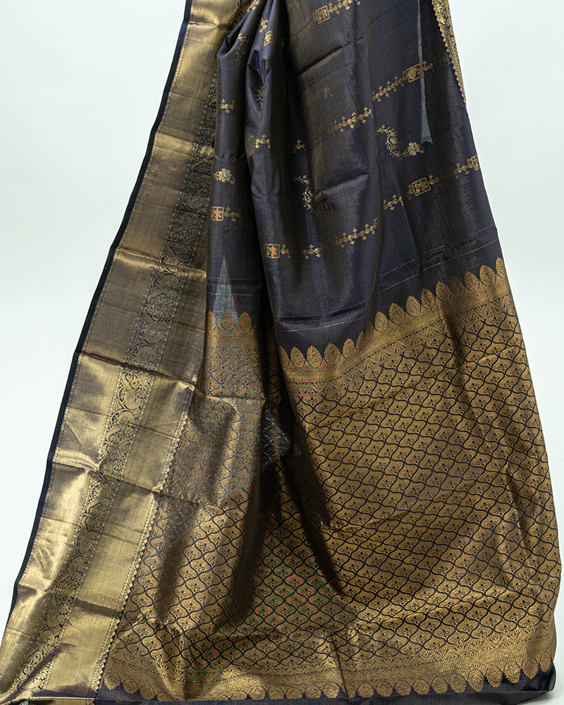 Karuppu (black) silk with Kodi Vizhangal buttas and a heavy gold Zari Korvai border featuring Pillayar Moggu motifs.