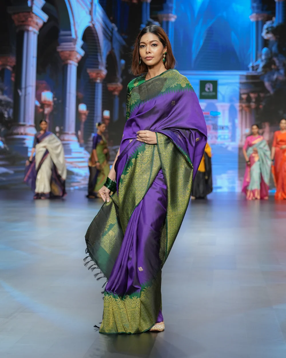This beautiful Kanjivaram silk saree features a blue shaded body adorned with chakram and peacock golden motifs all over, complemented by an elephant gold motifs border.