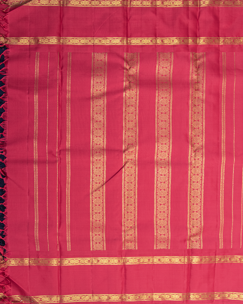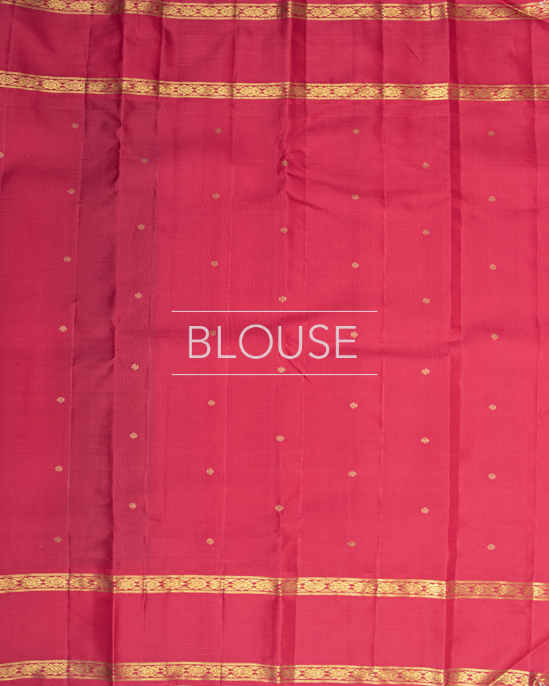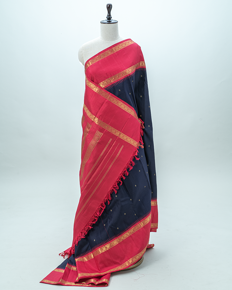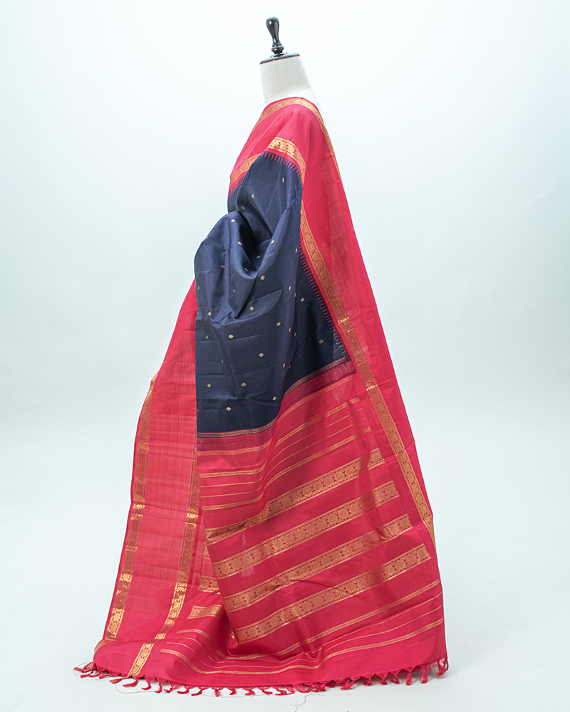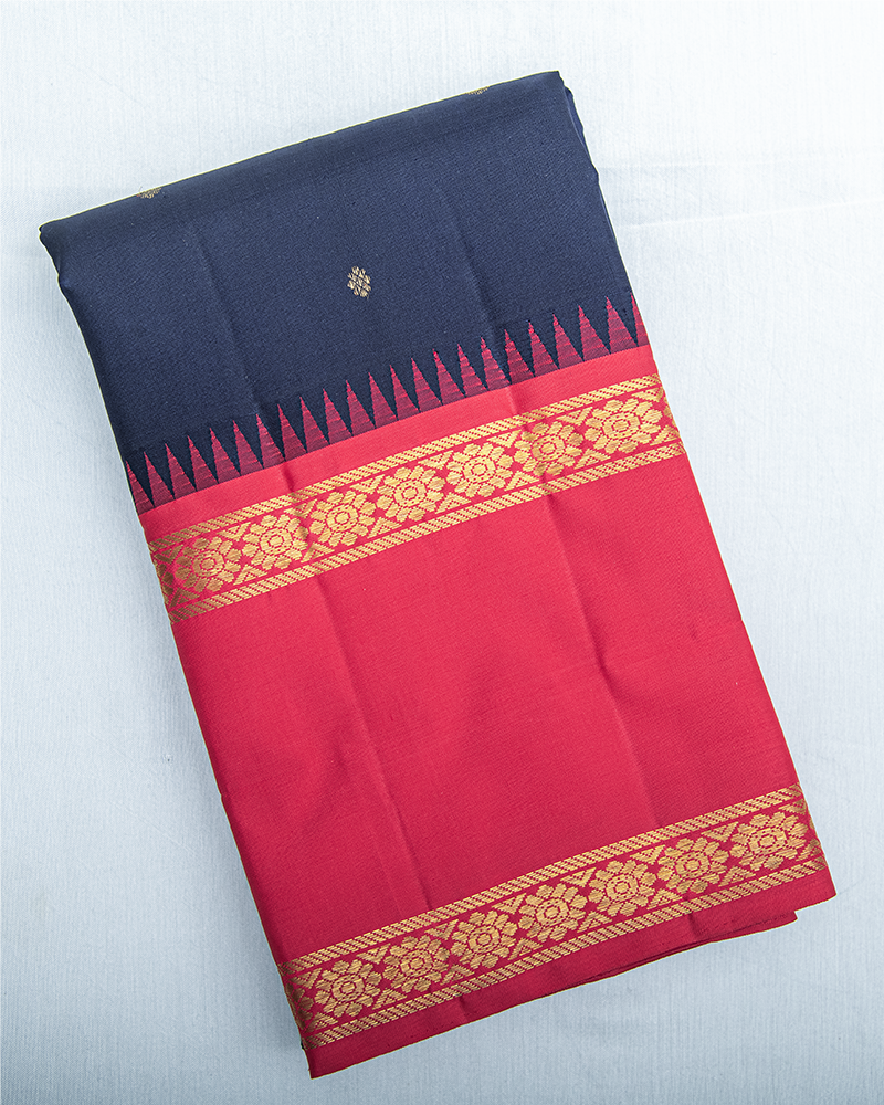 This beautiful Kanjivaram silk saree features a Blue body with golden motifs all over and a vibrant red gold gap zari border.