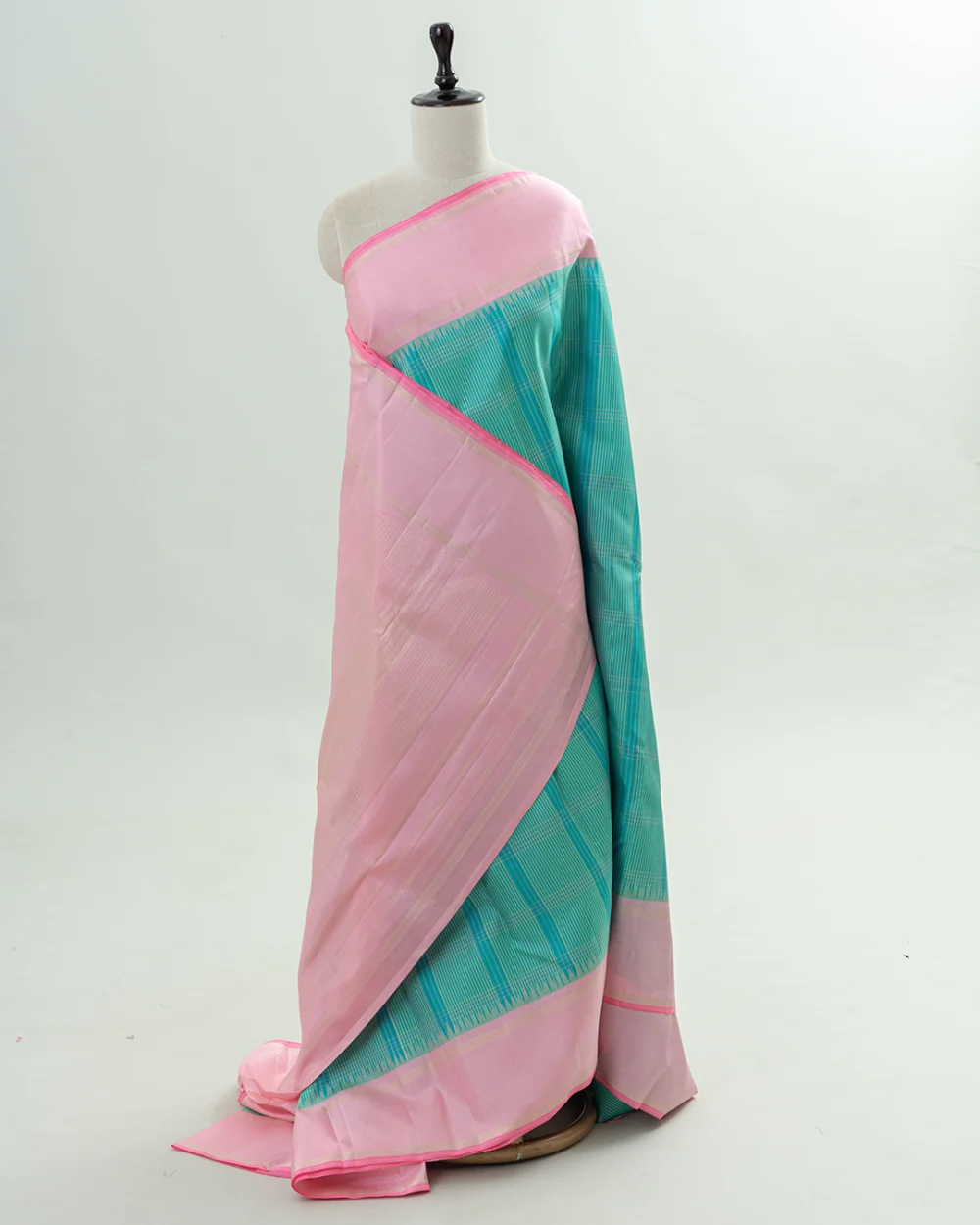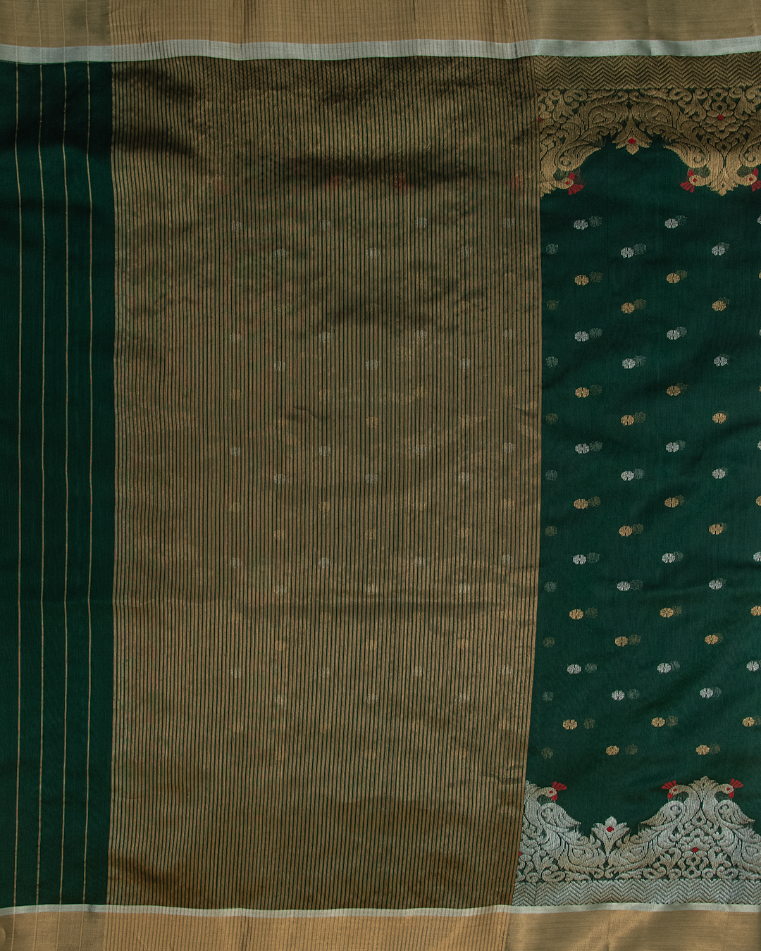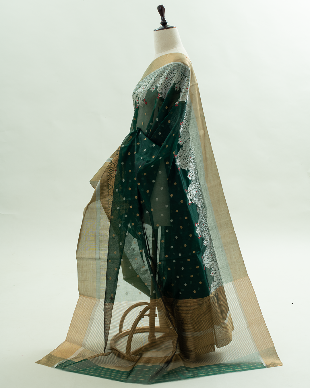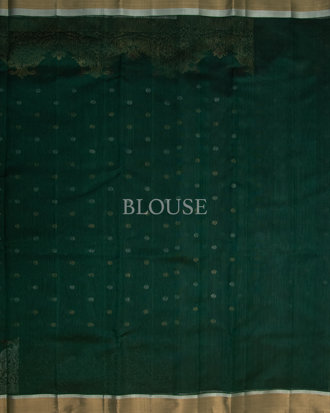 This Chanderi silk saree features a deep bottle green base adorned with delicate silver and gold butis and an ornate peacock motif border.