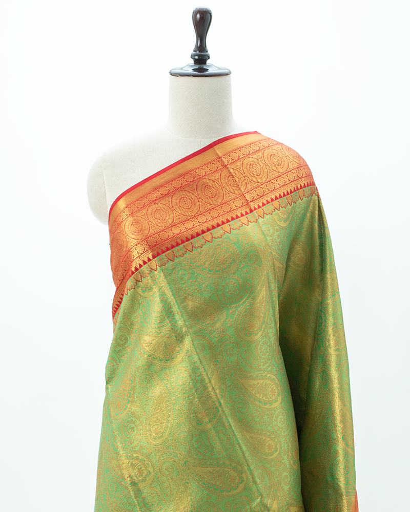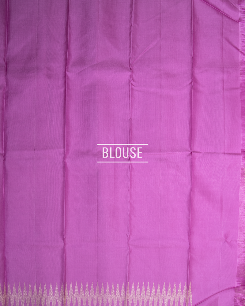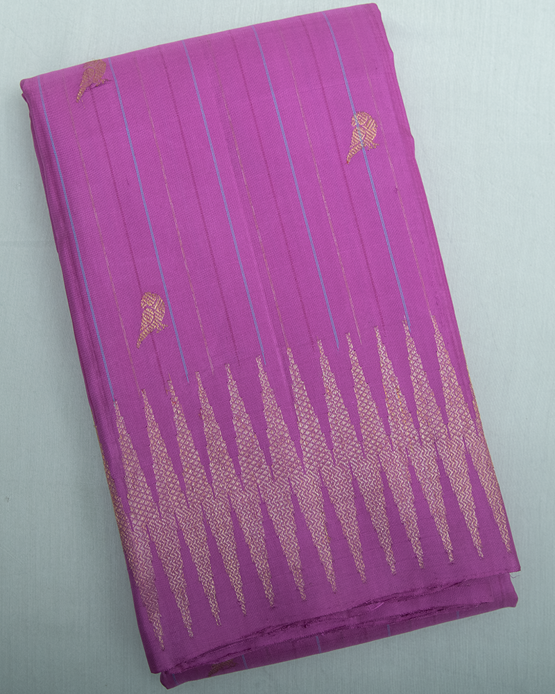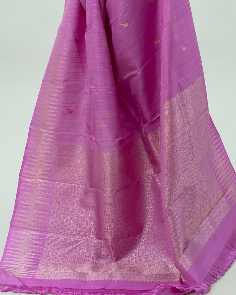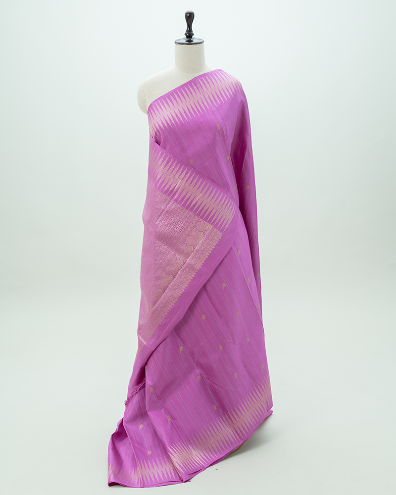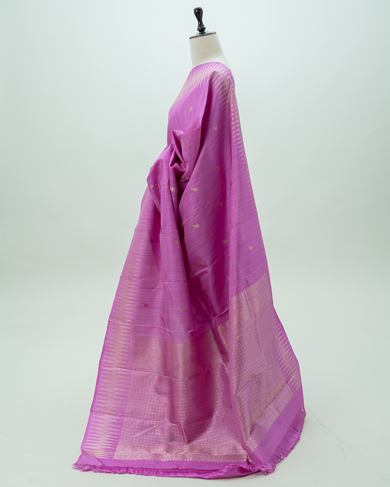 Bright magenta Kanjivaram silk with subtle stripes and gold buttas. It features an intensely woven pallu with a chevron design