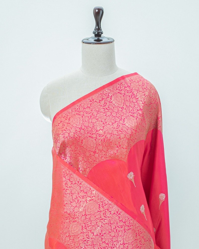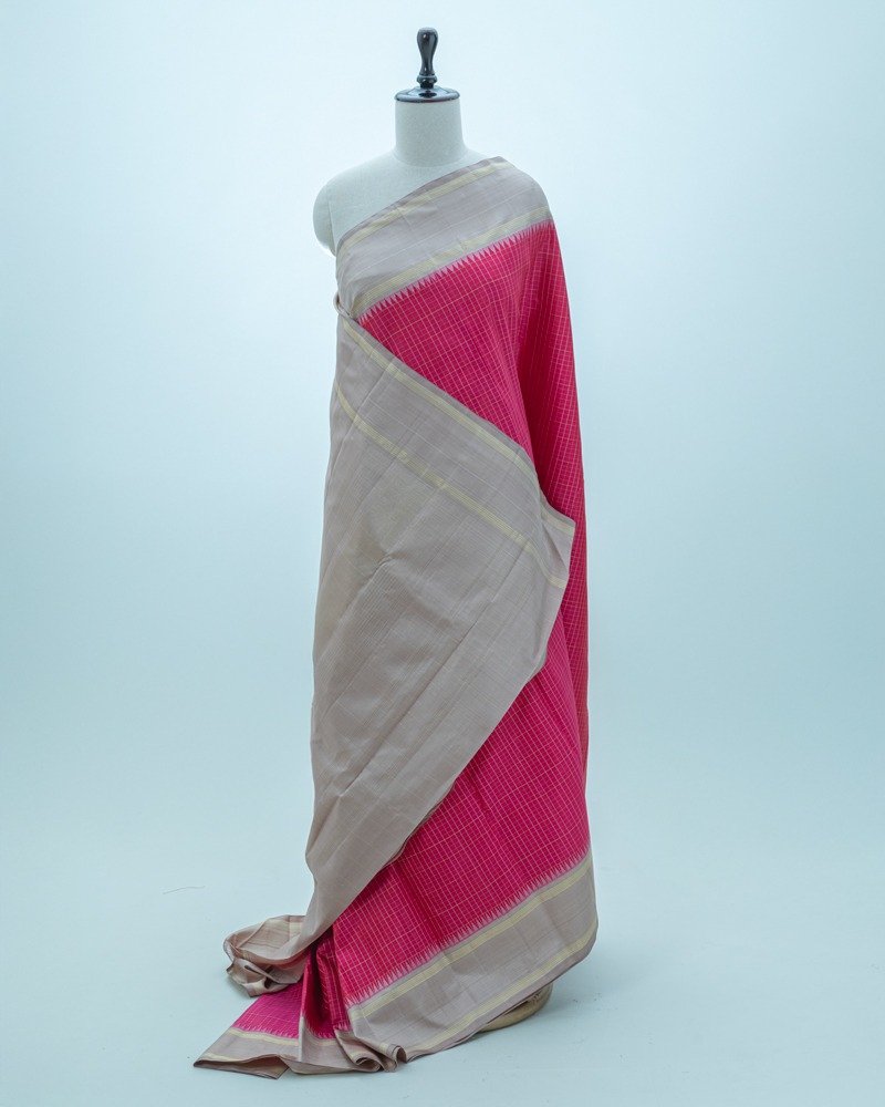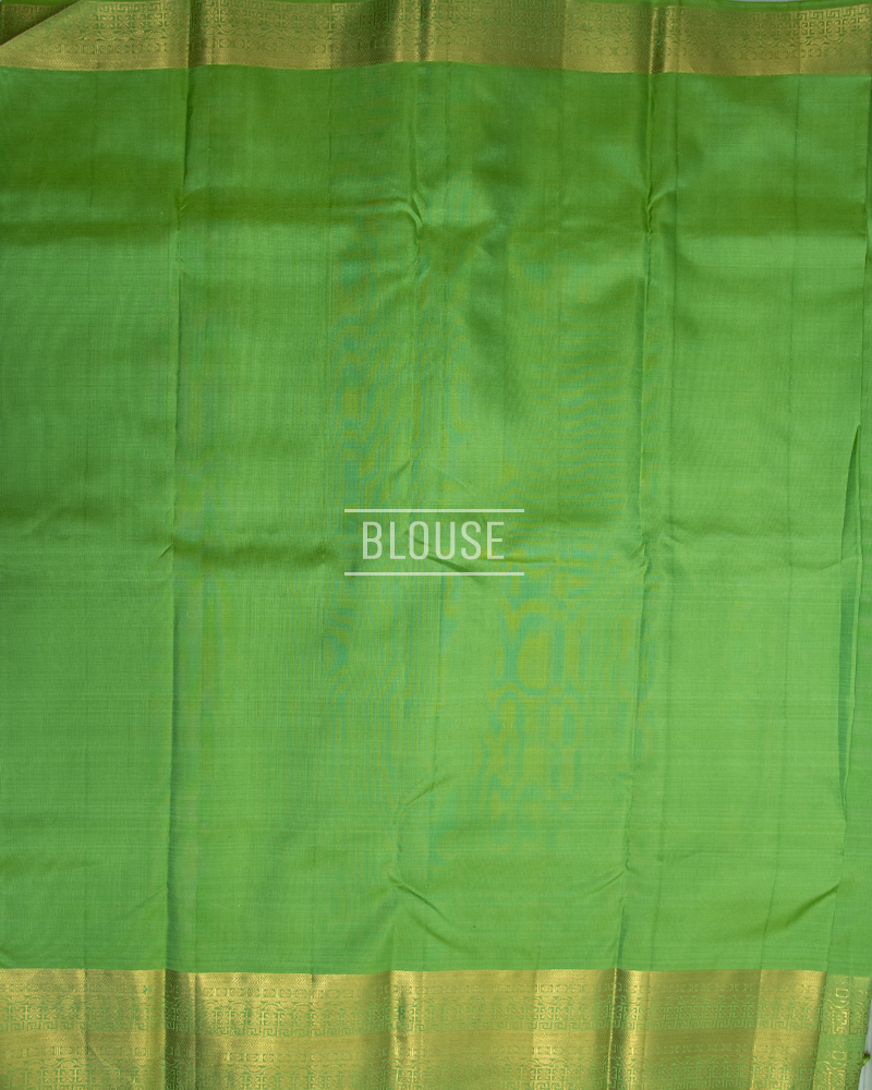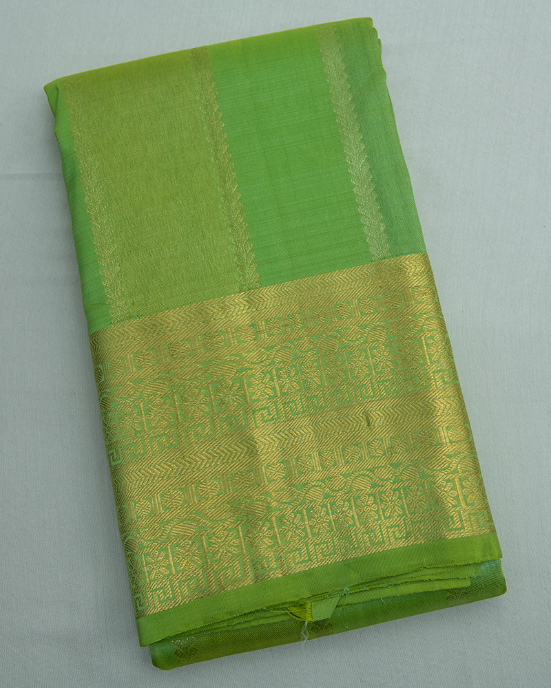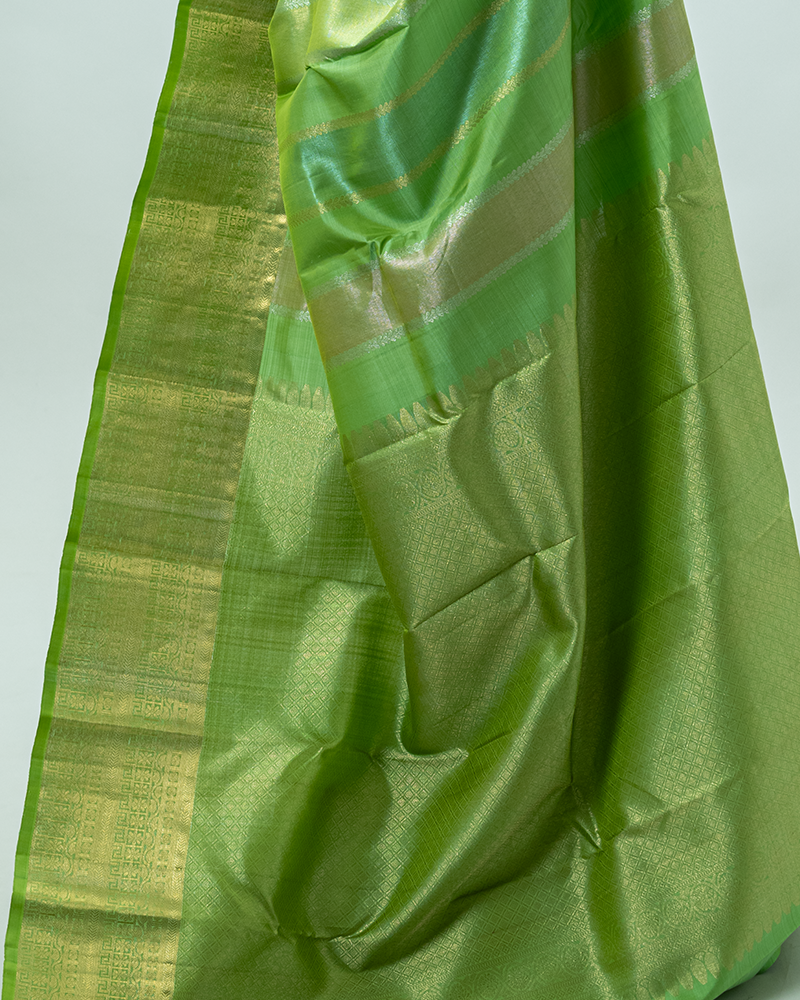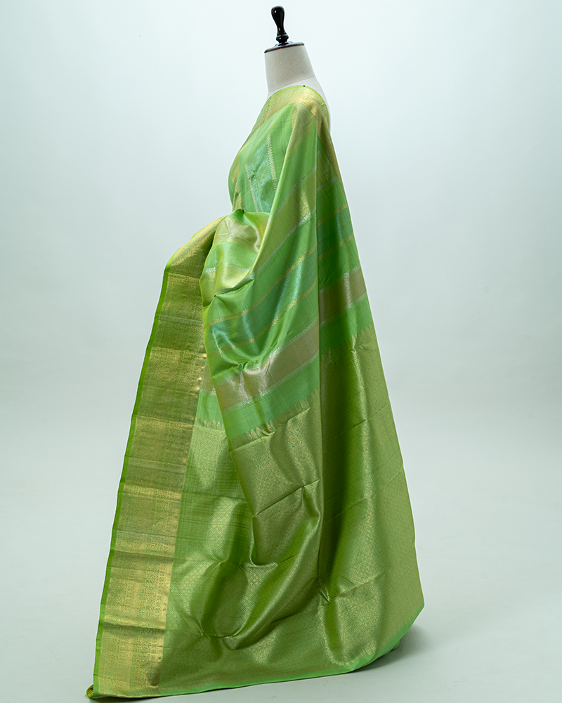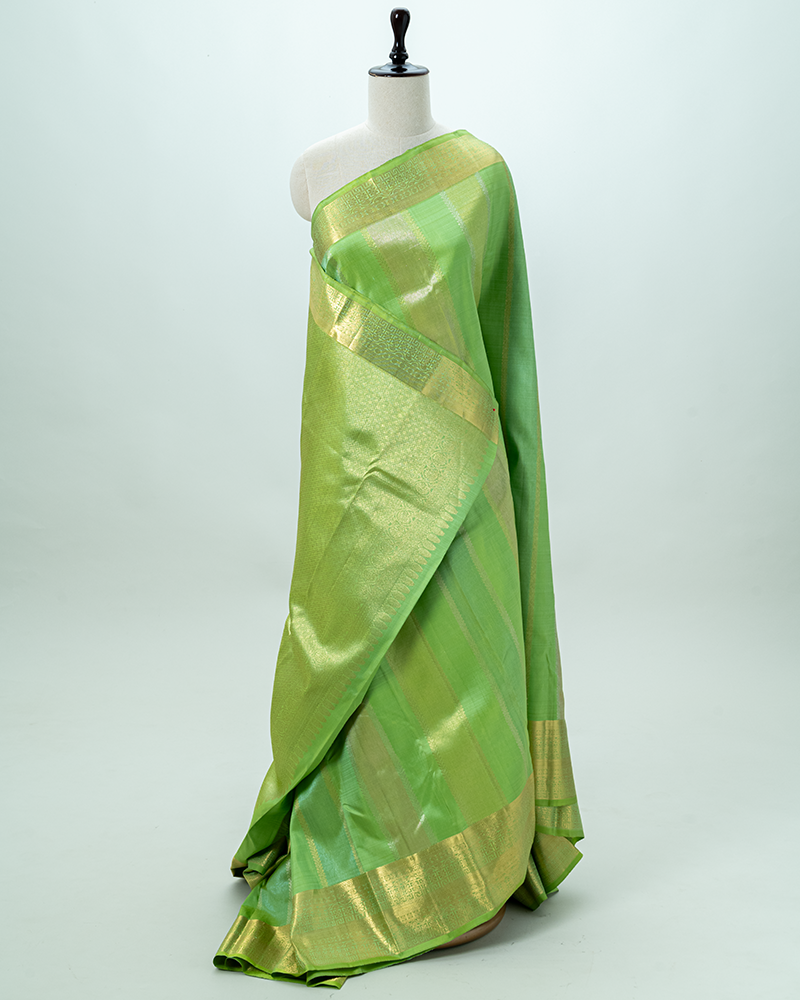 Vibrant parrot green silk with tonal stripes; features a magnificent rich gold zari border and grand pallu design.
