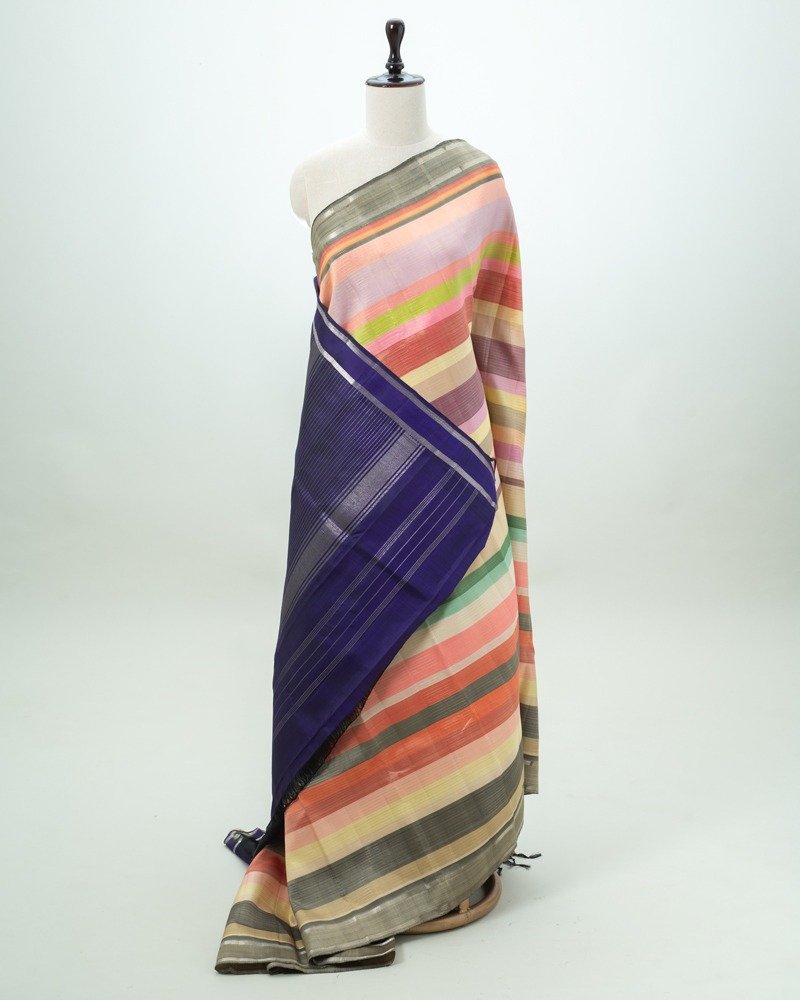 Vibrant parrot green silk with tonal stripes; features a magnificent rich gold zari border and grand pallu design.