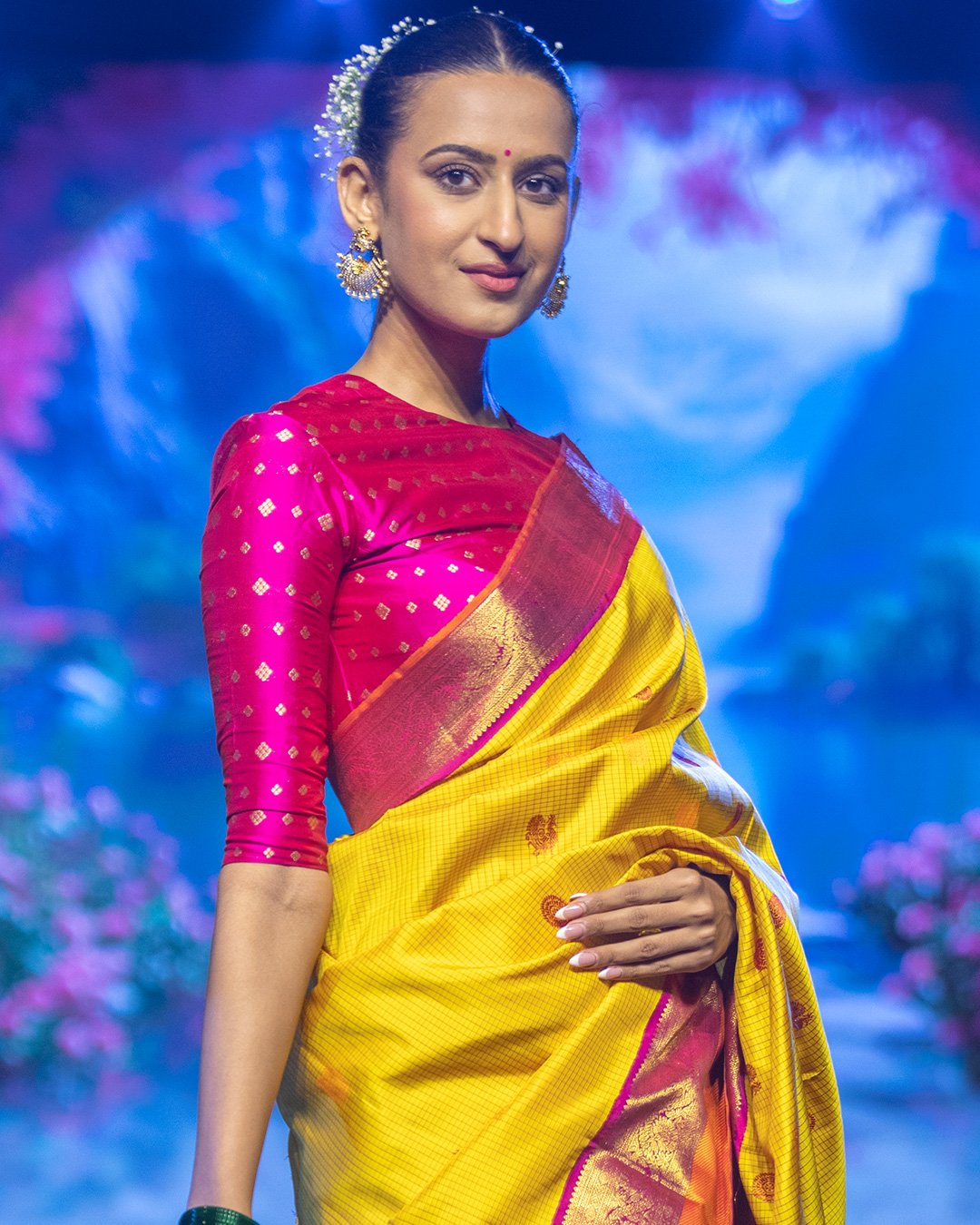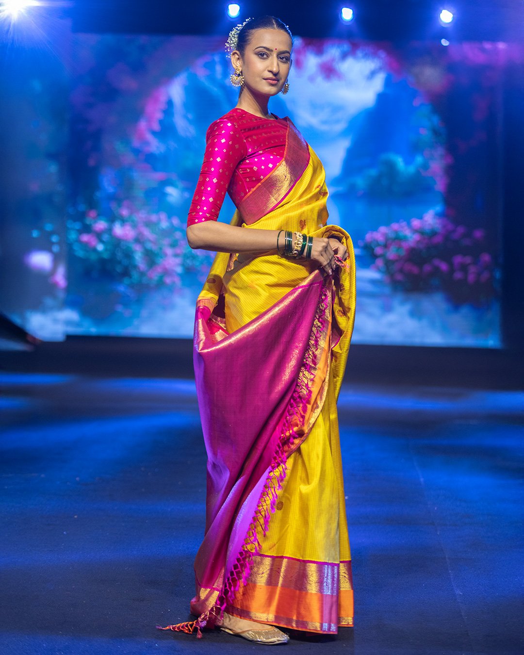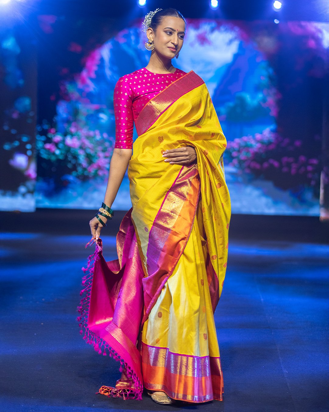 Bright yellow body with delicate pin-stripe checks, contrasted by a deep magenta pink interlocked Korvai border and a luxurious pallu.