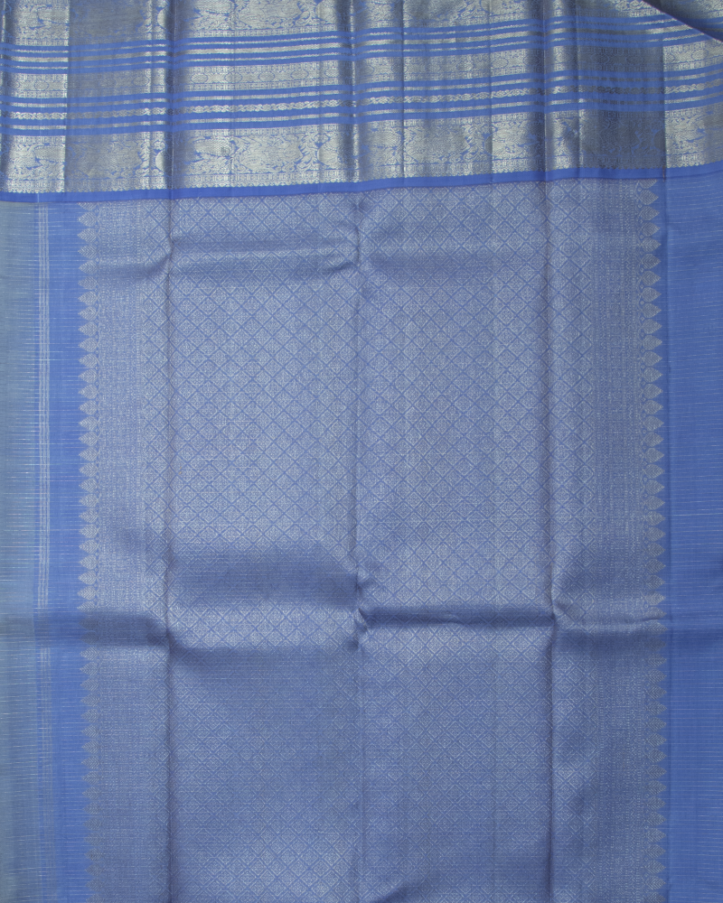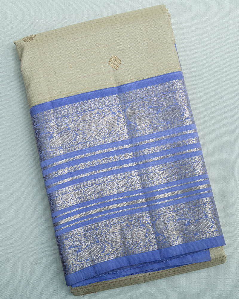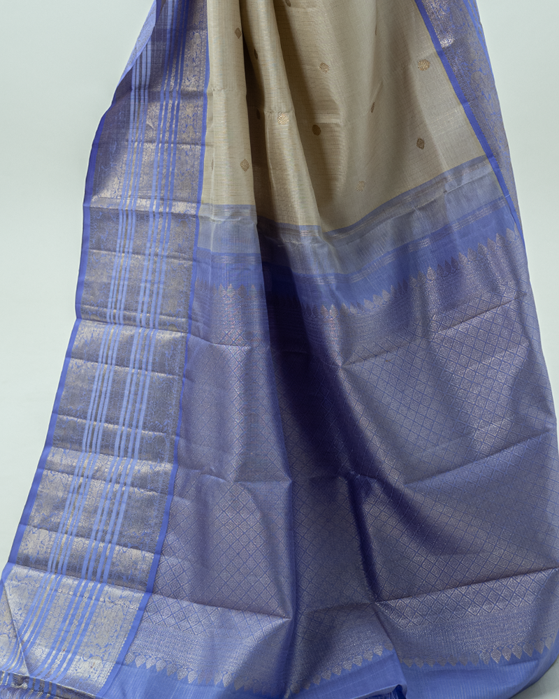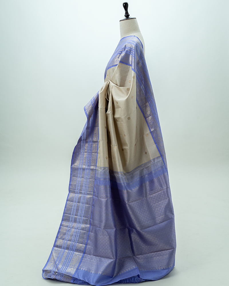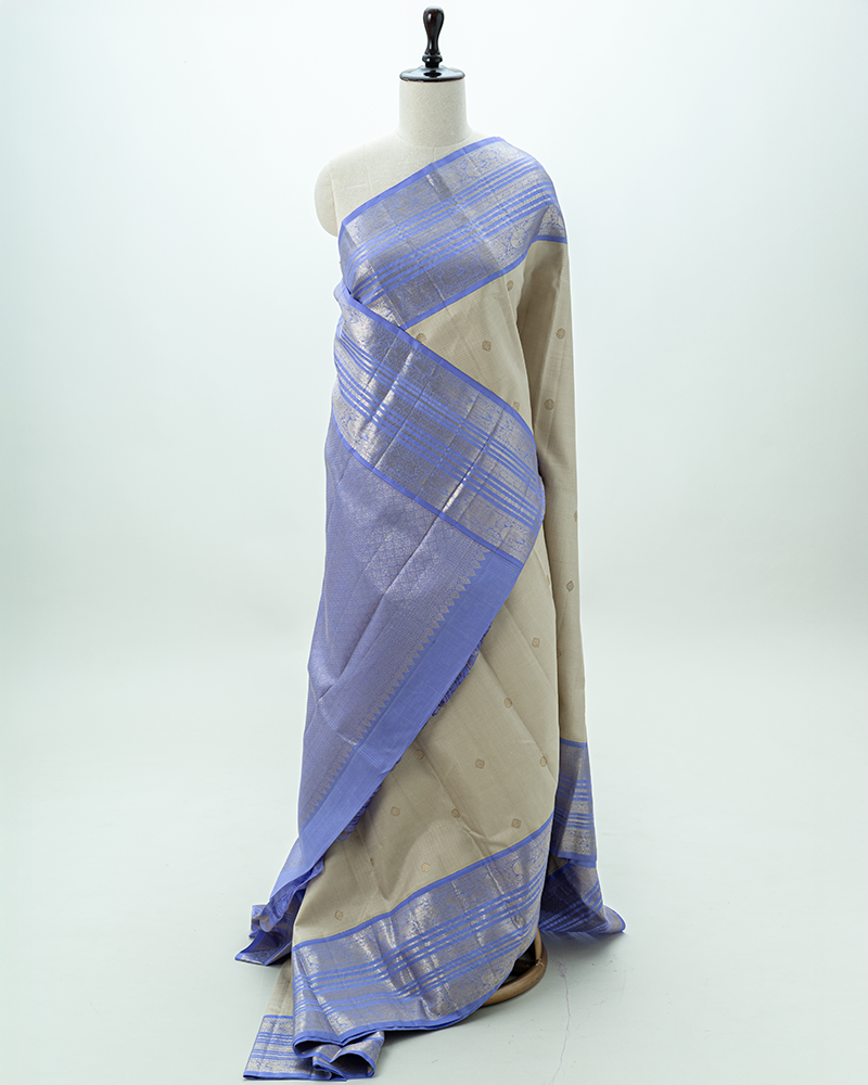 A stunning cream body with gold Maanga buttas meets a rich Mayil Kazhuthu border. This Korvai Kanjivaram embodies the heritage of the Kanchi loom.