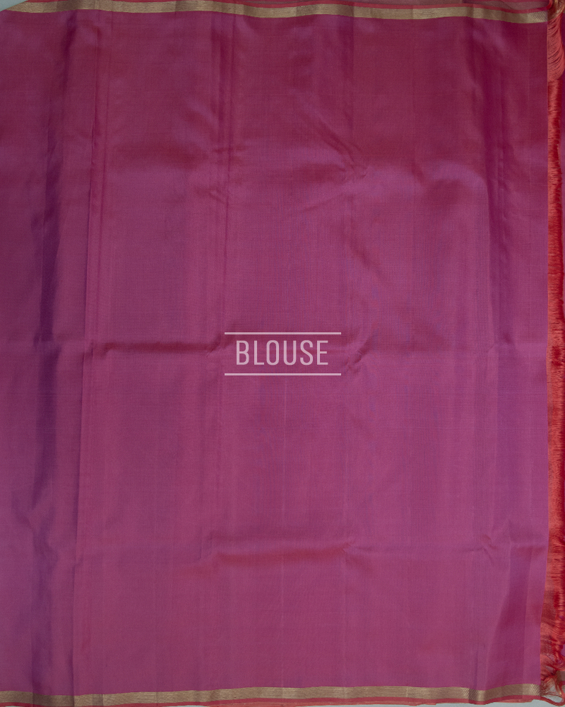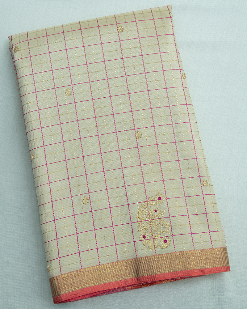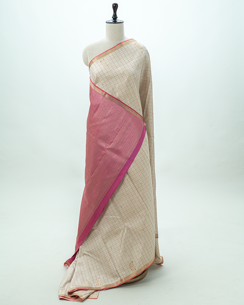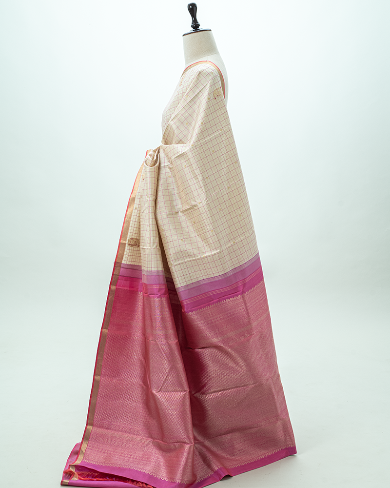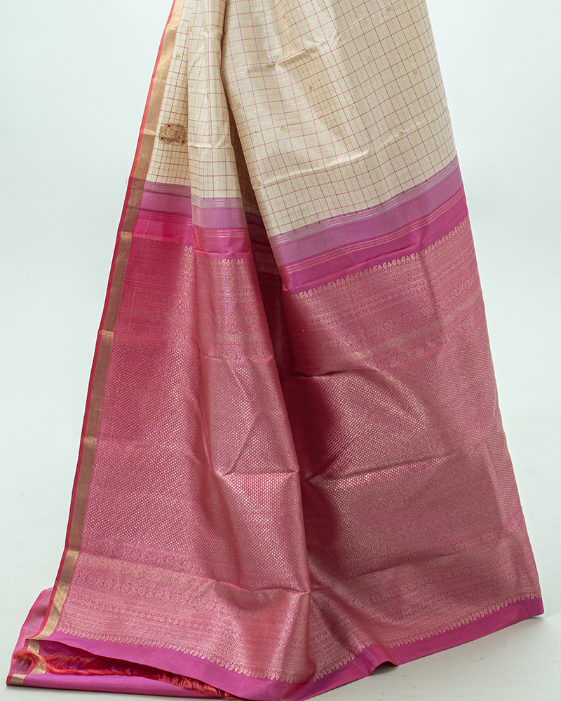 Elegant Creamy biege kattam kanjivaram silk saree has a creamy beige body, contrasted by a rich, elaborate magenta pink pallu and border.