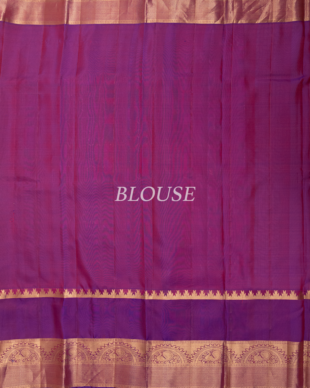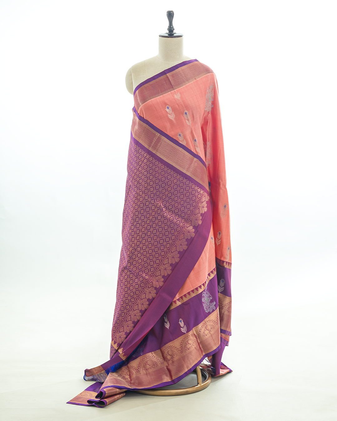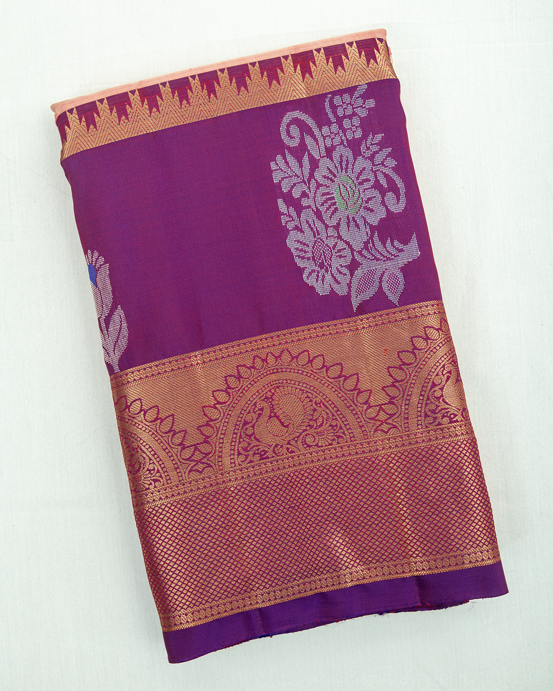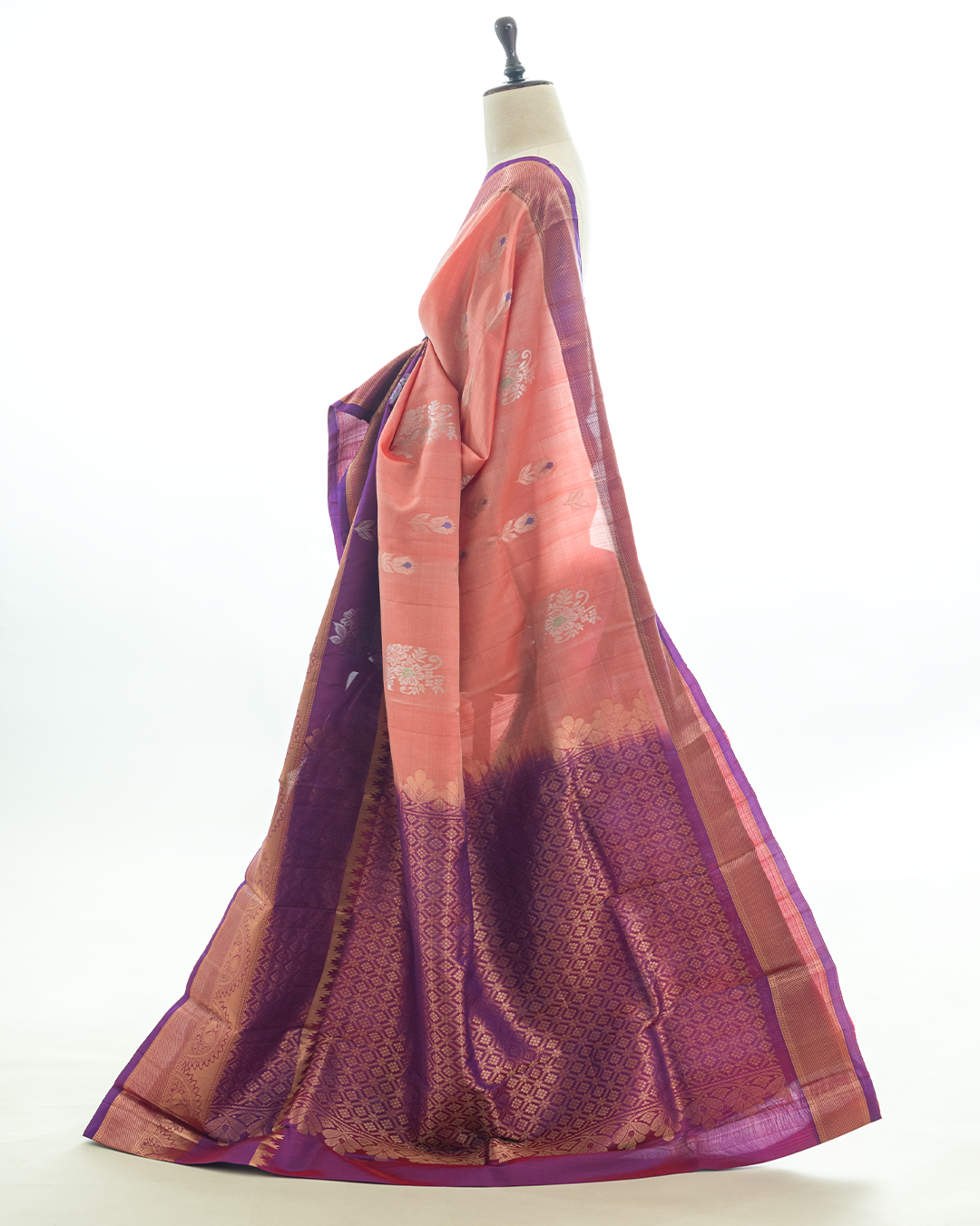 Dark peach Kanjivaram features silver floral Buttas and a contrast purple Rekku temple border with traditional Mayil and Chakram Zari motifs.