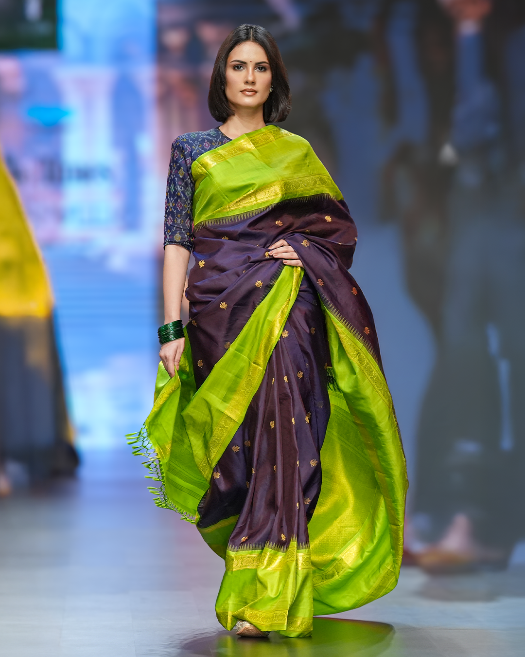 A deep aubergine body adorned with traditional zari kili (parrot) buttis, paired with a vibrant killi pachai (parrot green) Retha korvai border featuring classic temple motifs and rich zari floral buttis, lending a striking festive contrast.