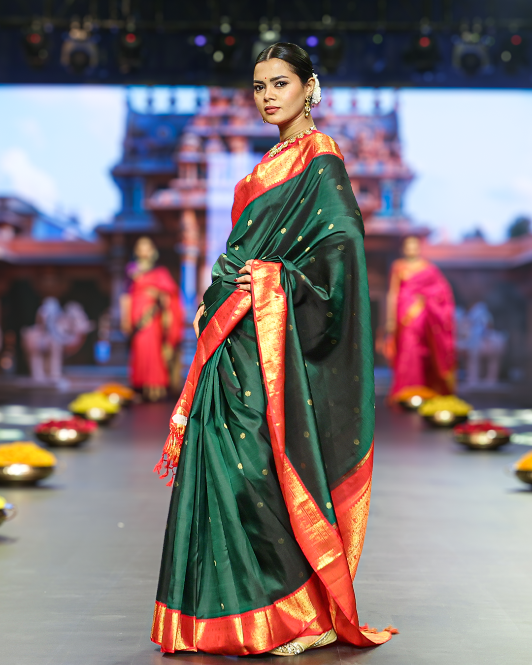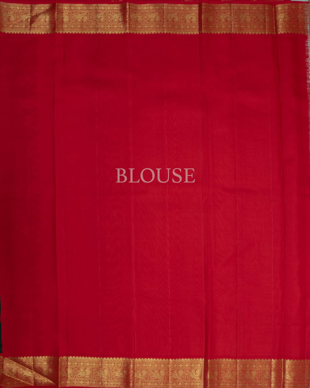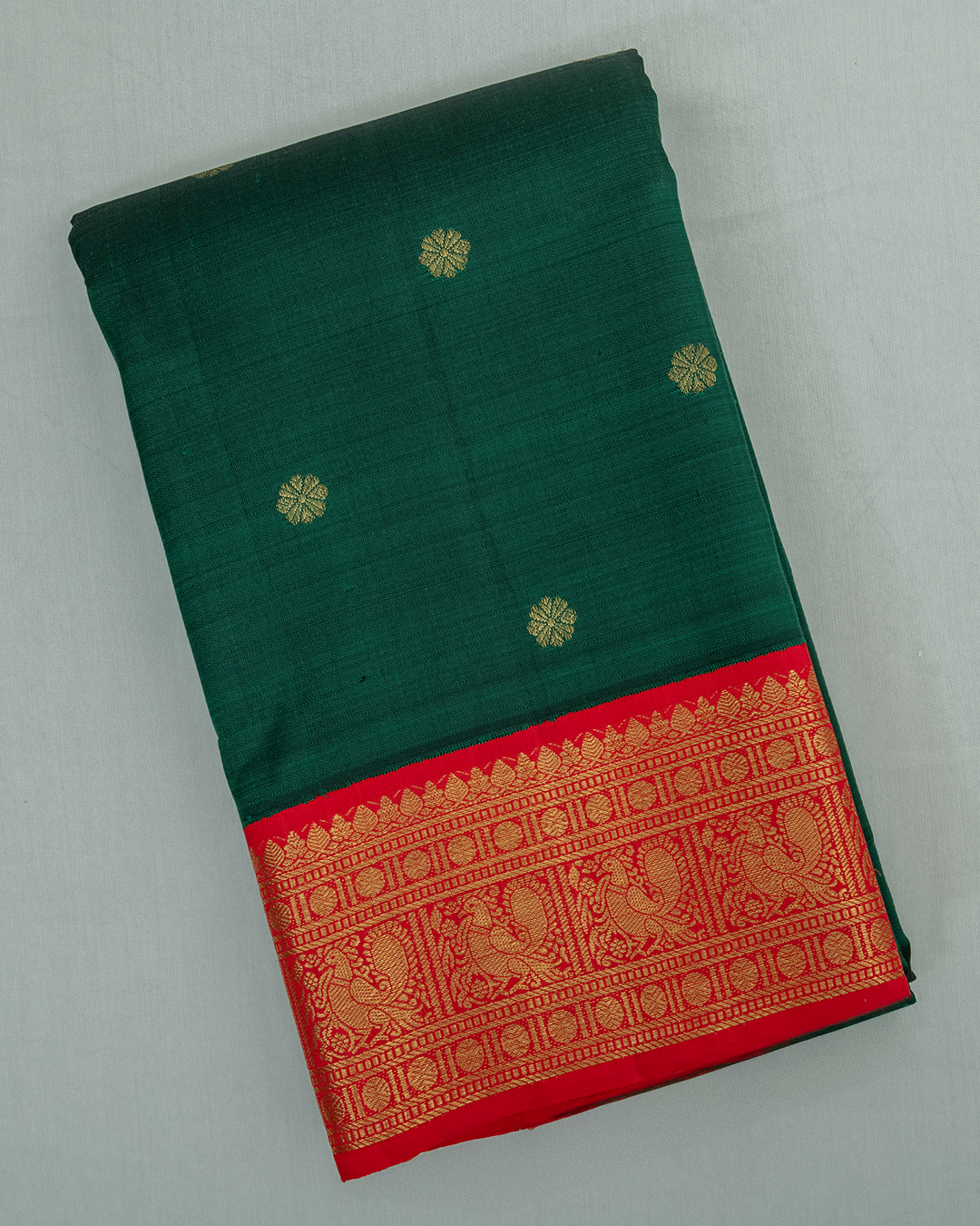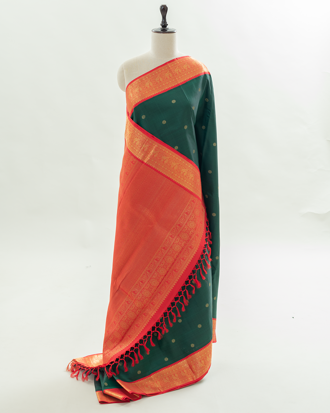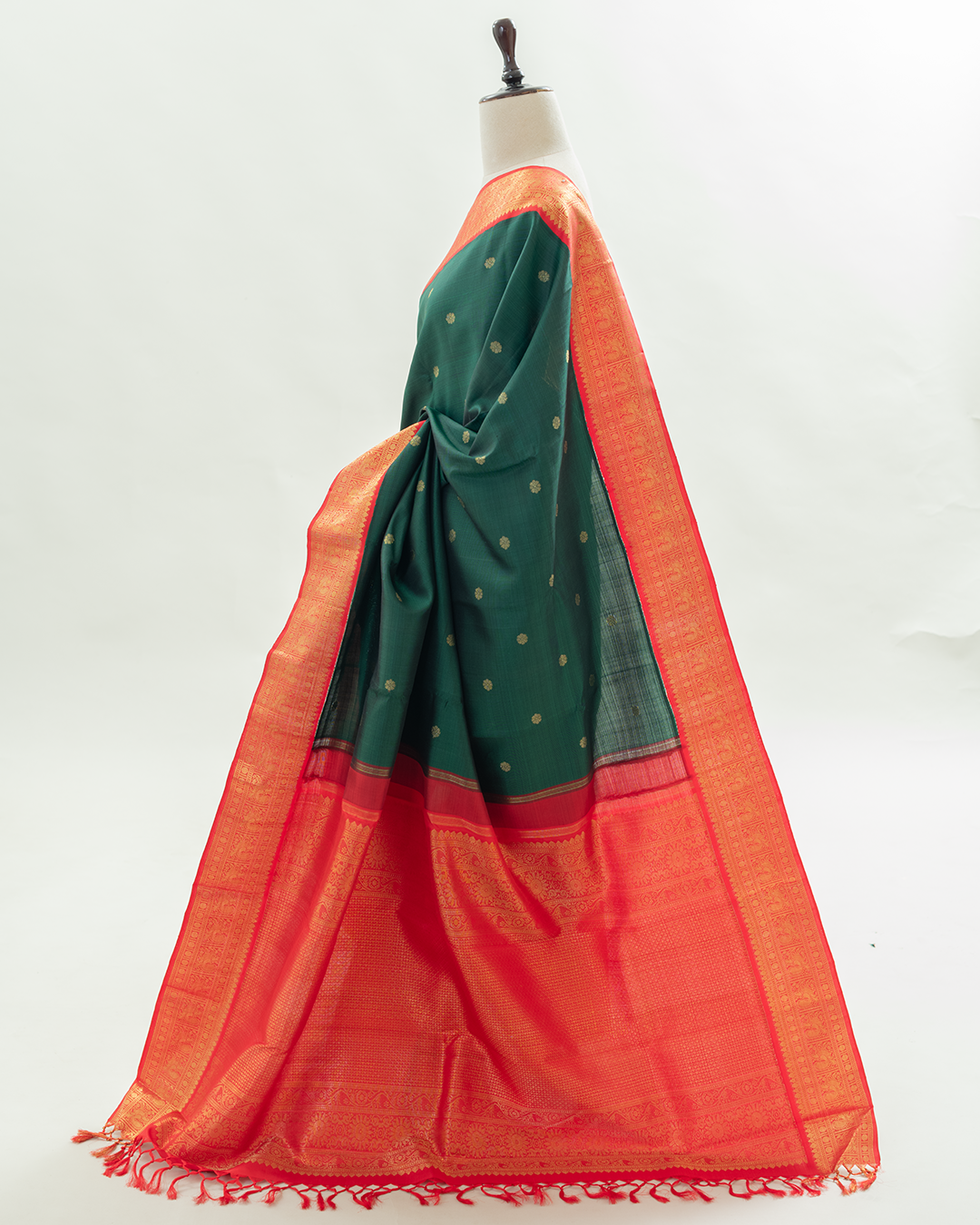 Deep emerald green Kanjivaram handloom silk saree with contrasting crimson red border, intricately woven gold zari motifs and traditional peacock-inspired temple weave.