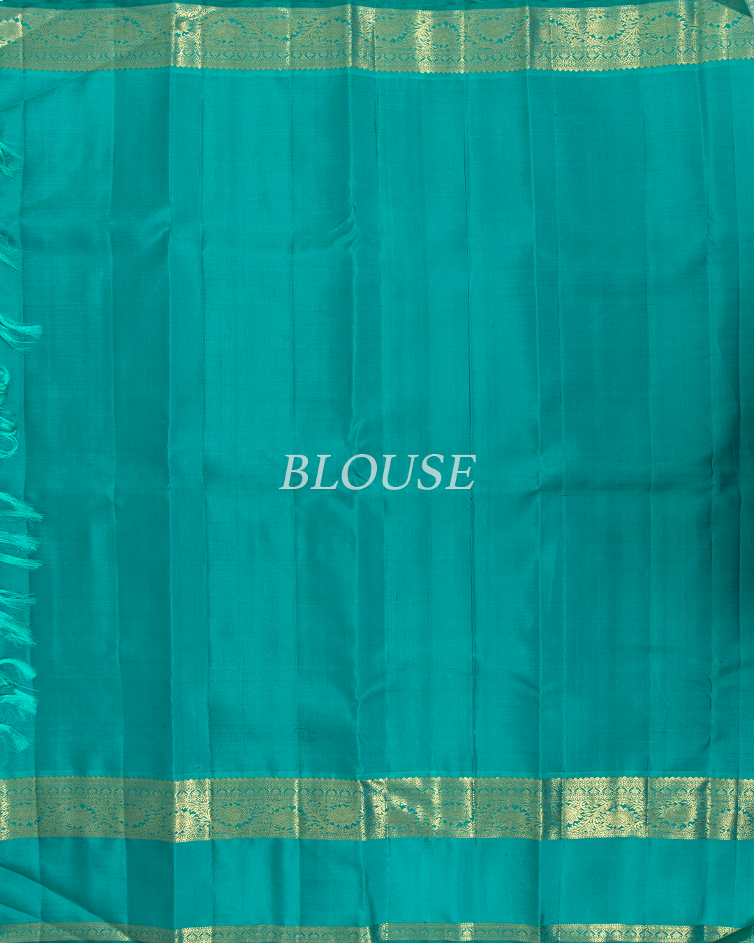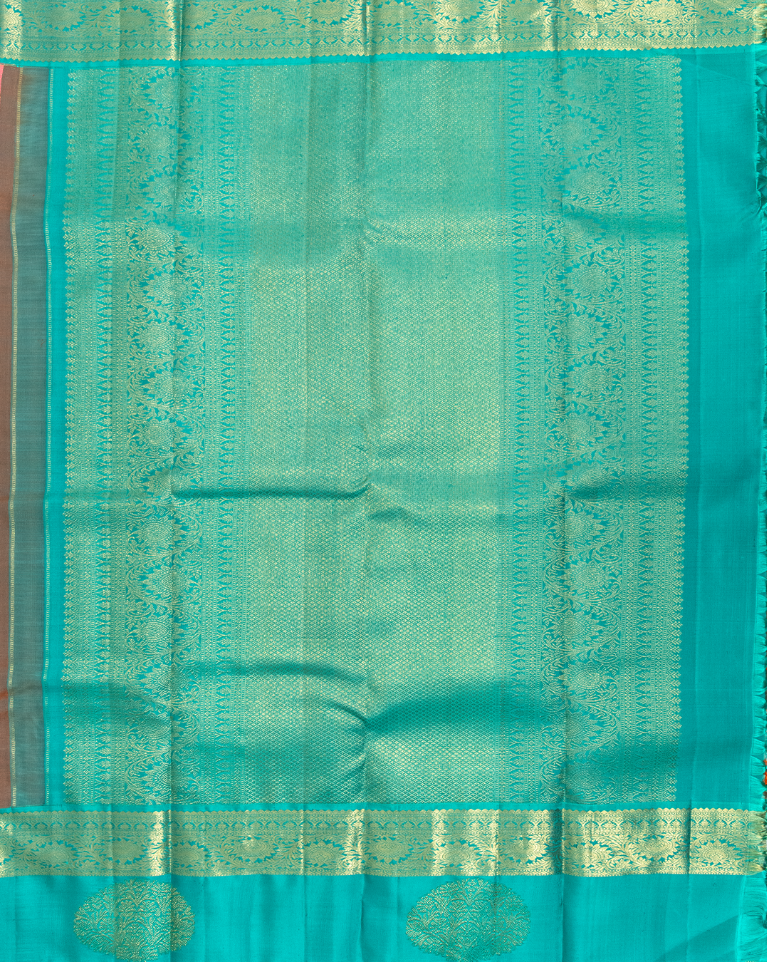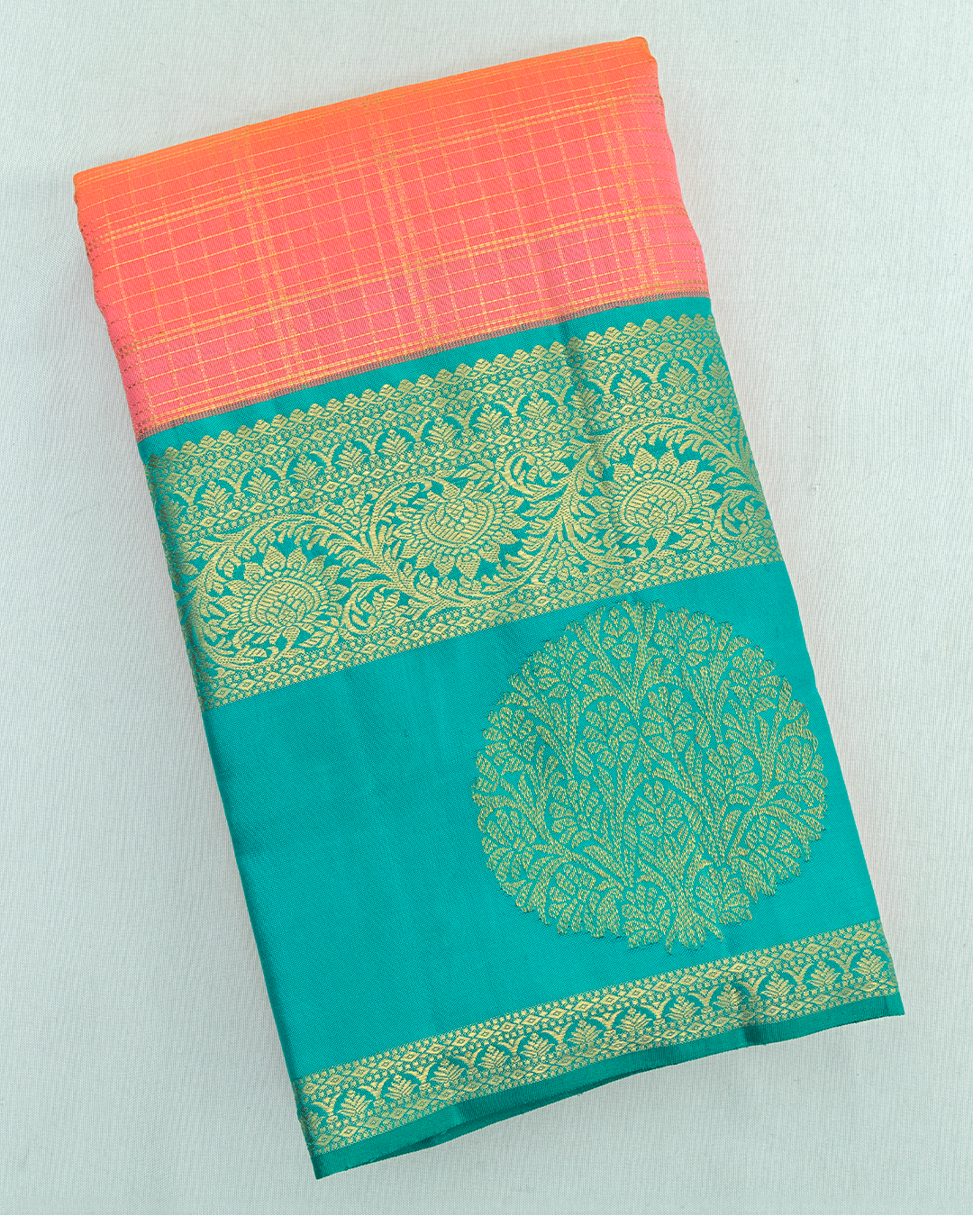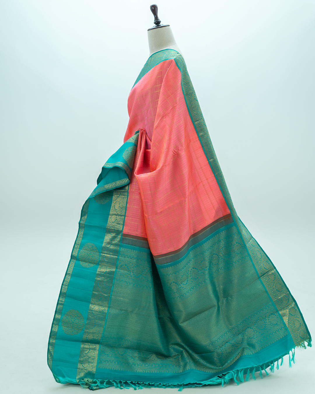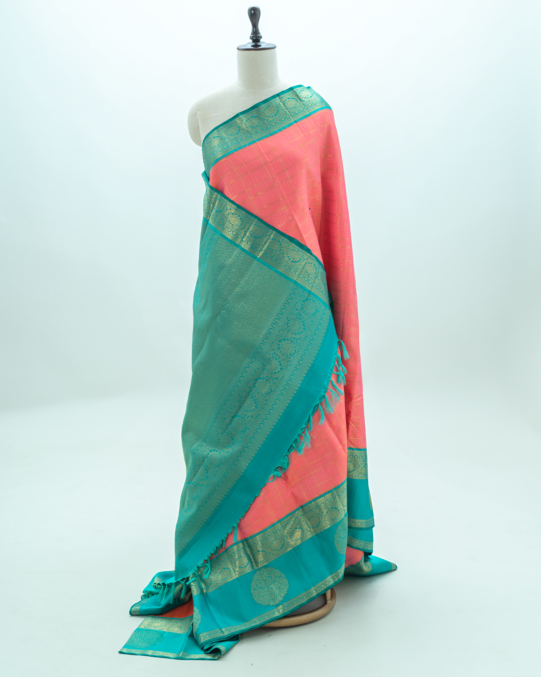 A coral pink handloom Kanjivaram silk saree with gold checks and round motifs, featuring a contrasting teal border with floral vines.