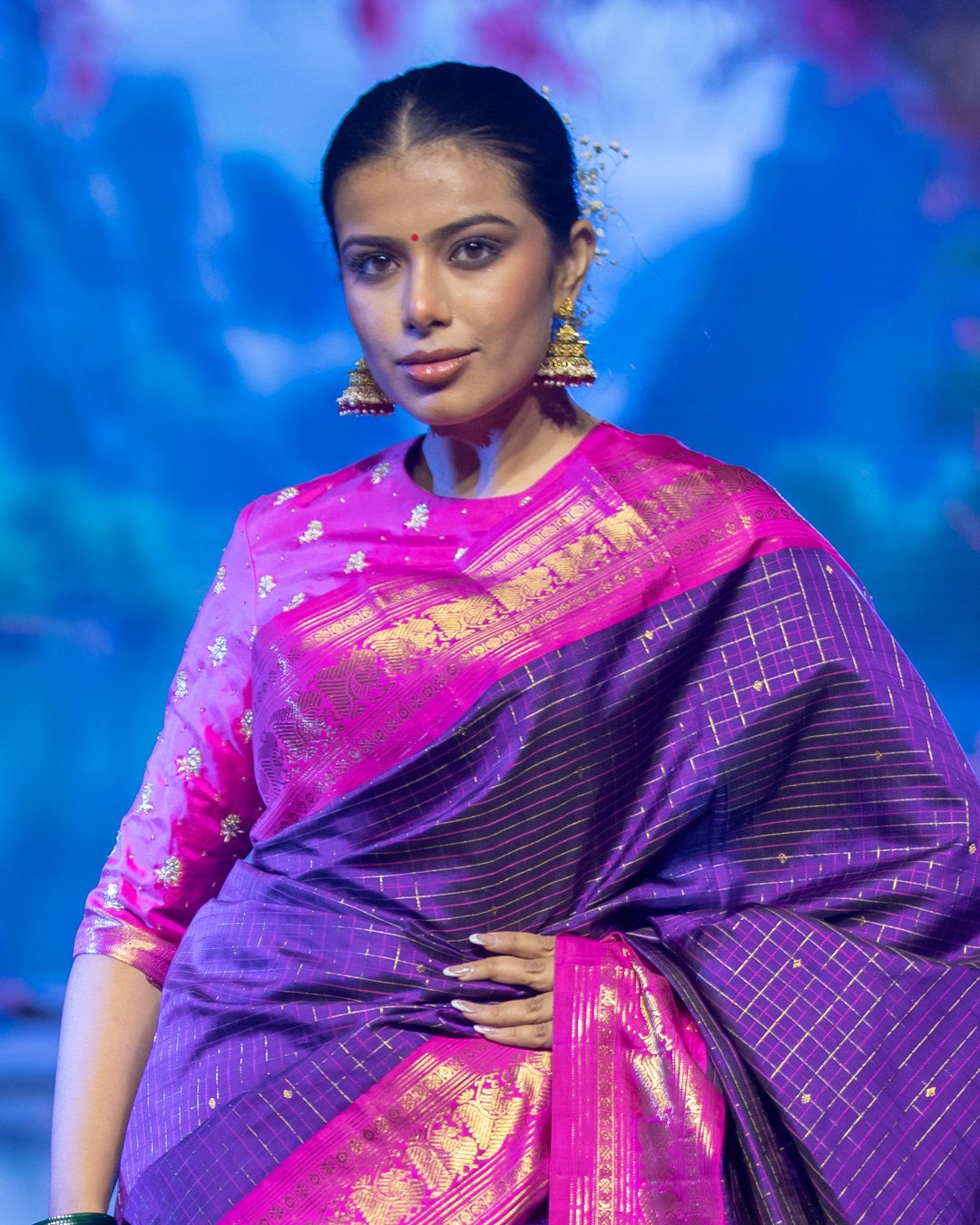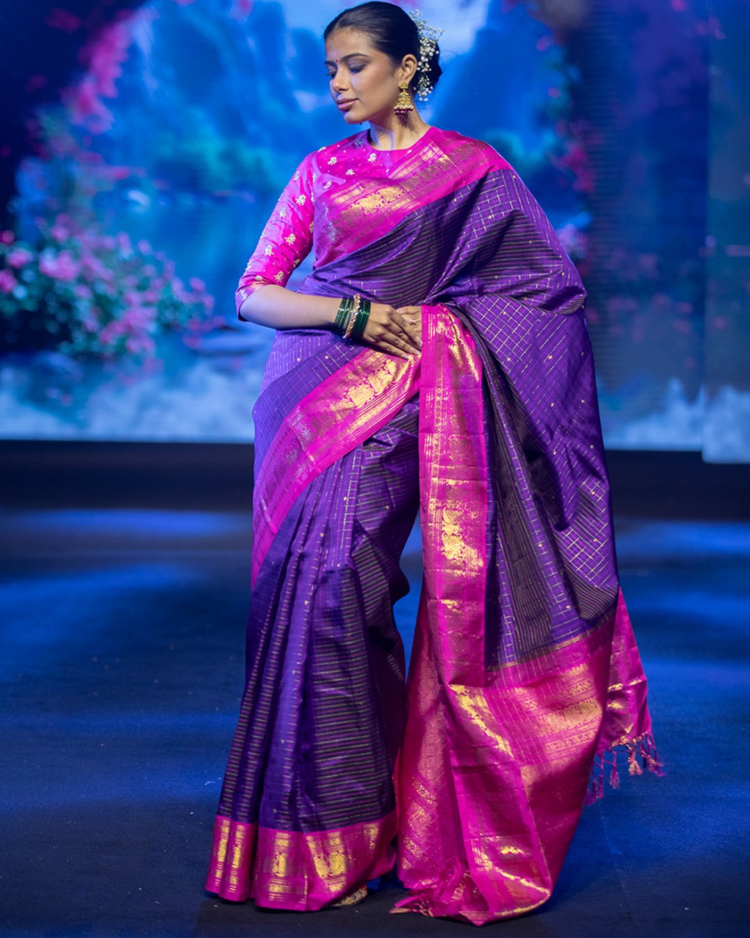 Deep violet Kanchipattu saree featuring classic kattam checks with subtle gold buttas, paired with a vibrant rani-pink korvai border richly woven in traditional gold zari. The border showcases annapakshi and floral motifs in intricate zari technique, giving the saree an authentic Kanchipuram grandeur—perfect for weddings.