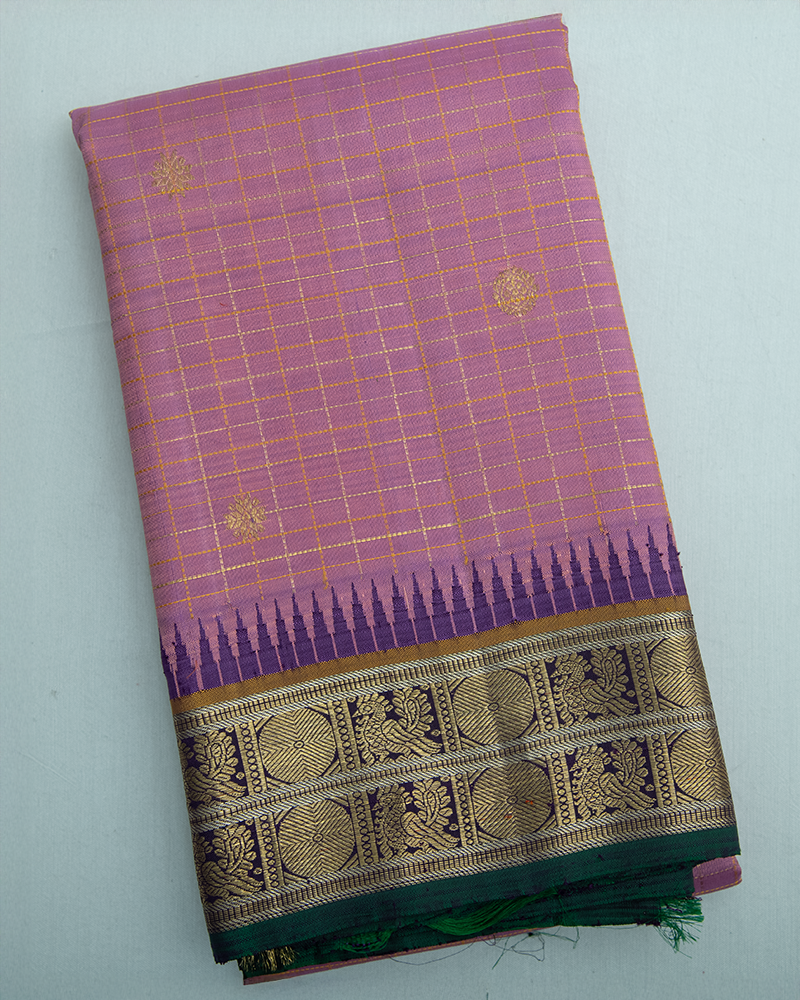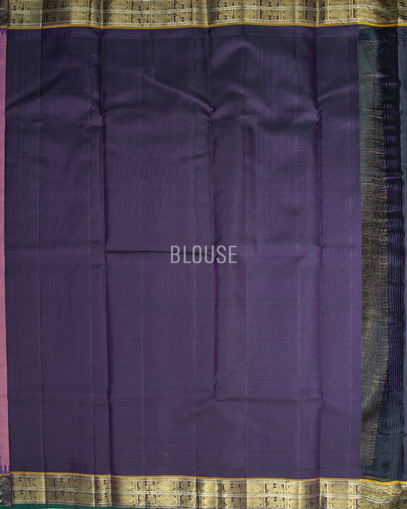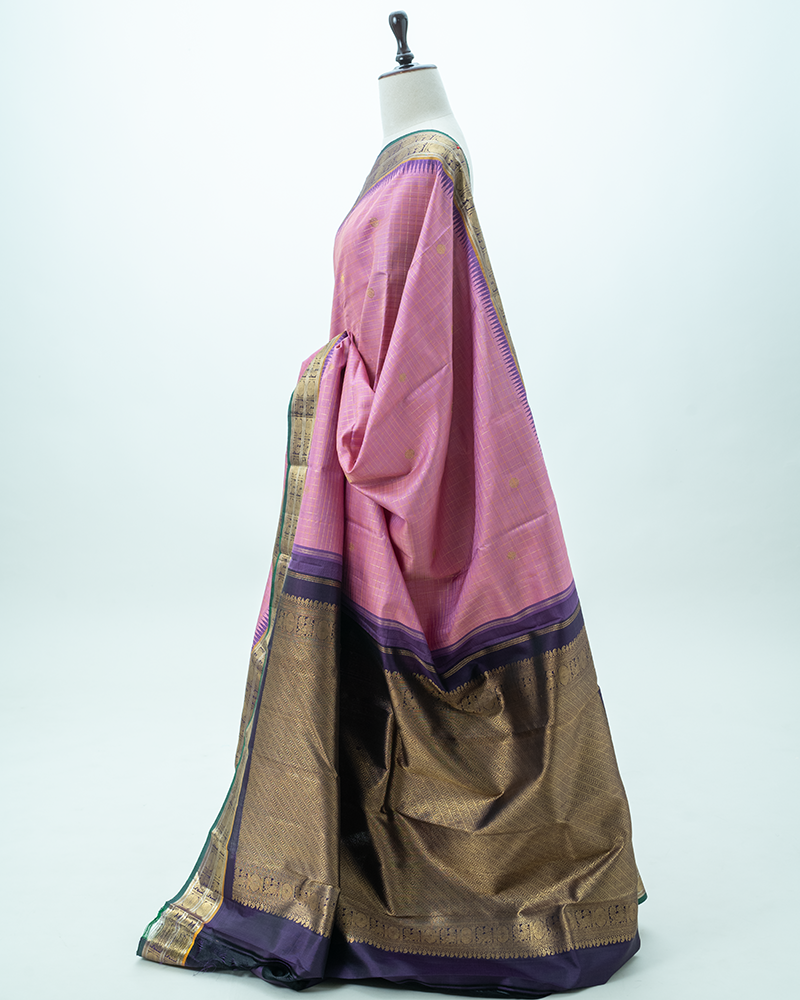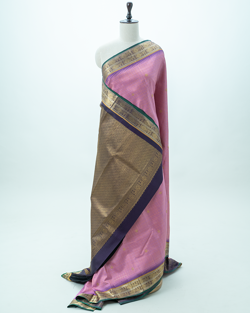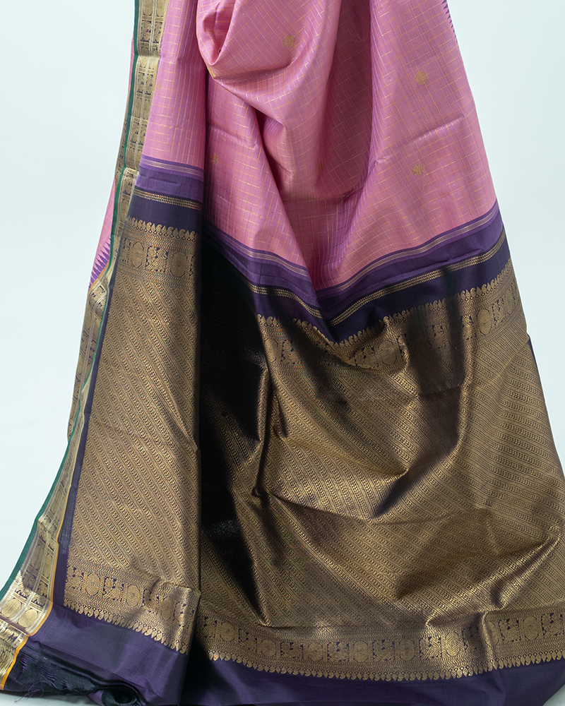 A dusky rose pink Kanjivaram silk saree with a gold kattam and a bold black/dark purple border with intricate gold zari work.