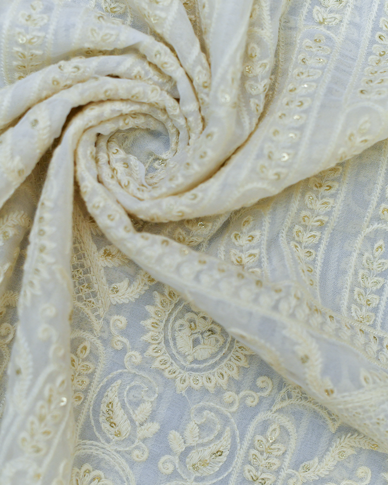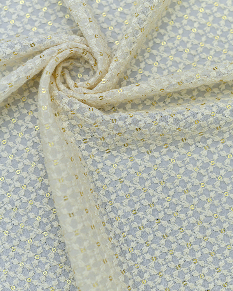 Dusty Rose Georgette adorned with intricate floral thread embroidery in gold and tonal hues, offering a fluid drape with rich surface detailing and refined festive charm.