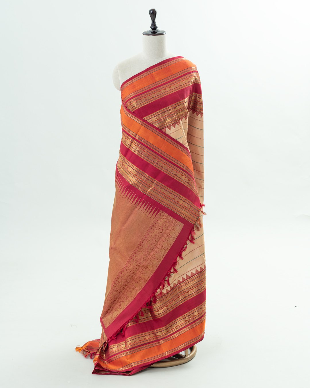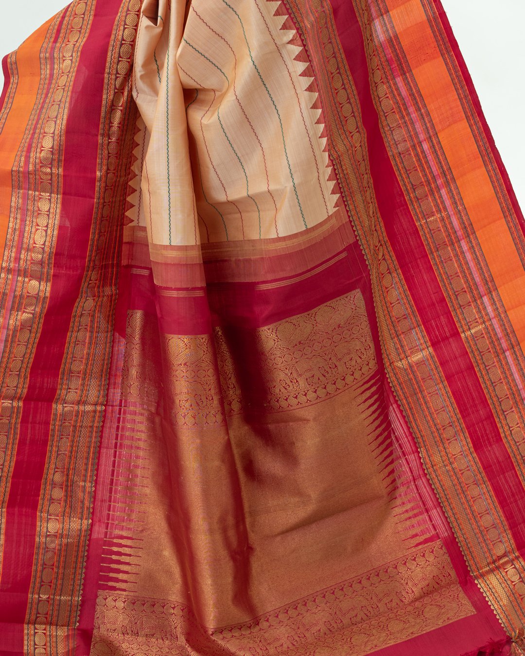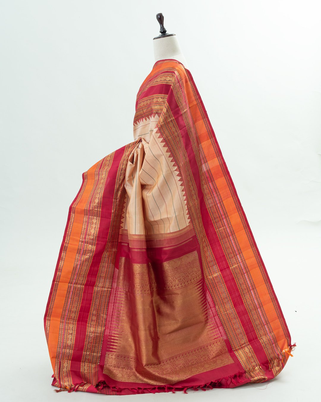 Elegant beige striped Kanjivaram silk featuring a broad red-orange temple border, intricate gold zari, heavy pallu, and matching contrast blouse.