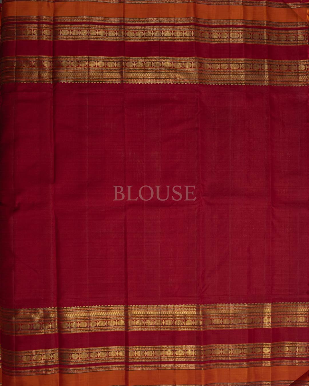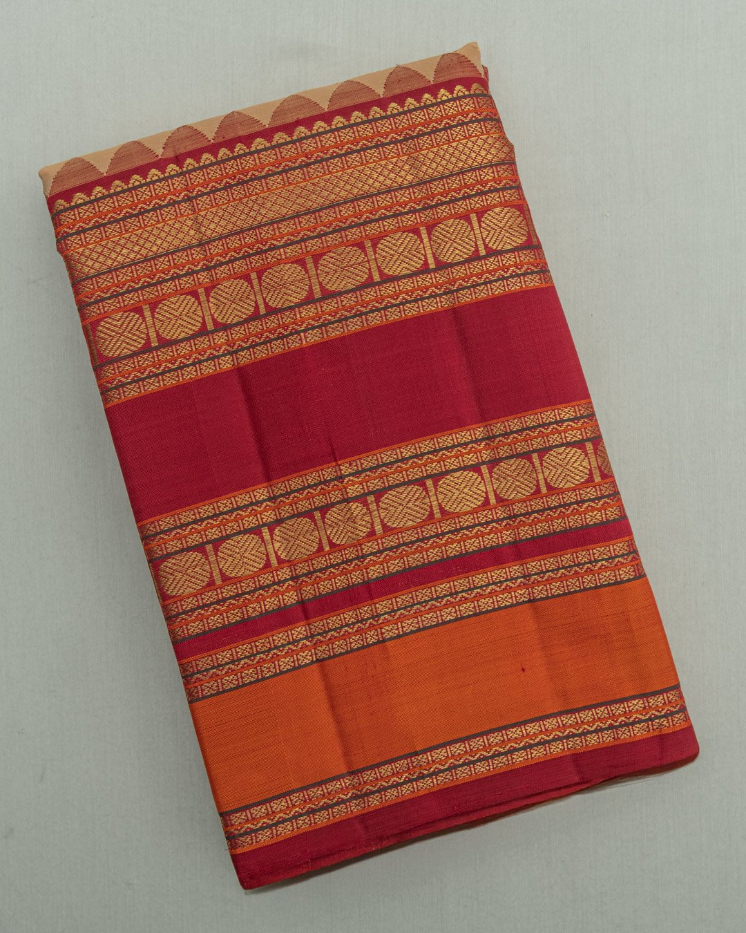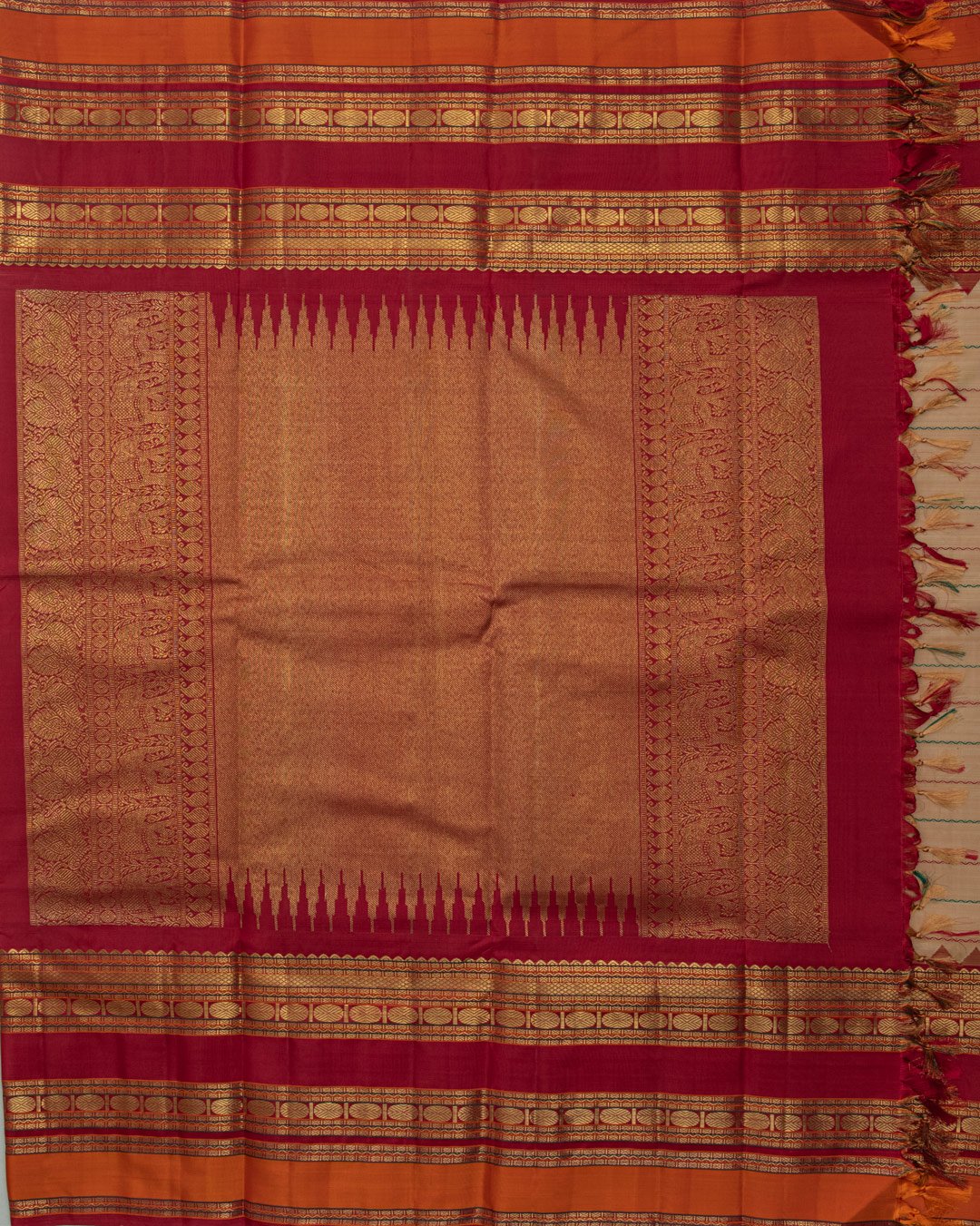 Elegant beige striped Kanjivaram silk featuring a broad red-orange temple border, intricate gold zari, heavy pallu, and matching contrast blouse.