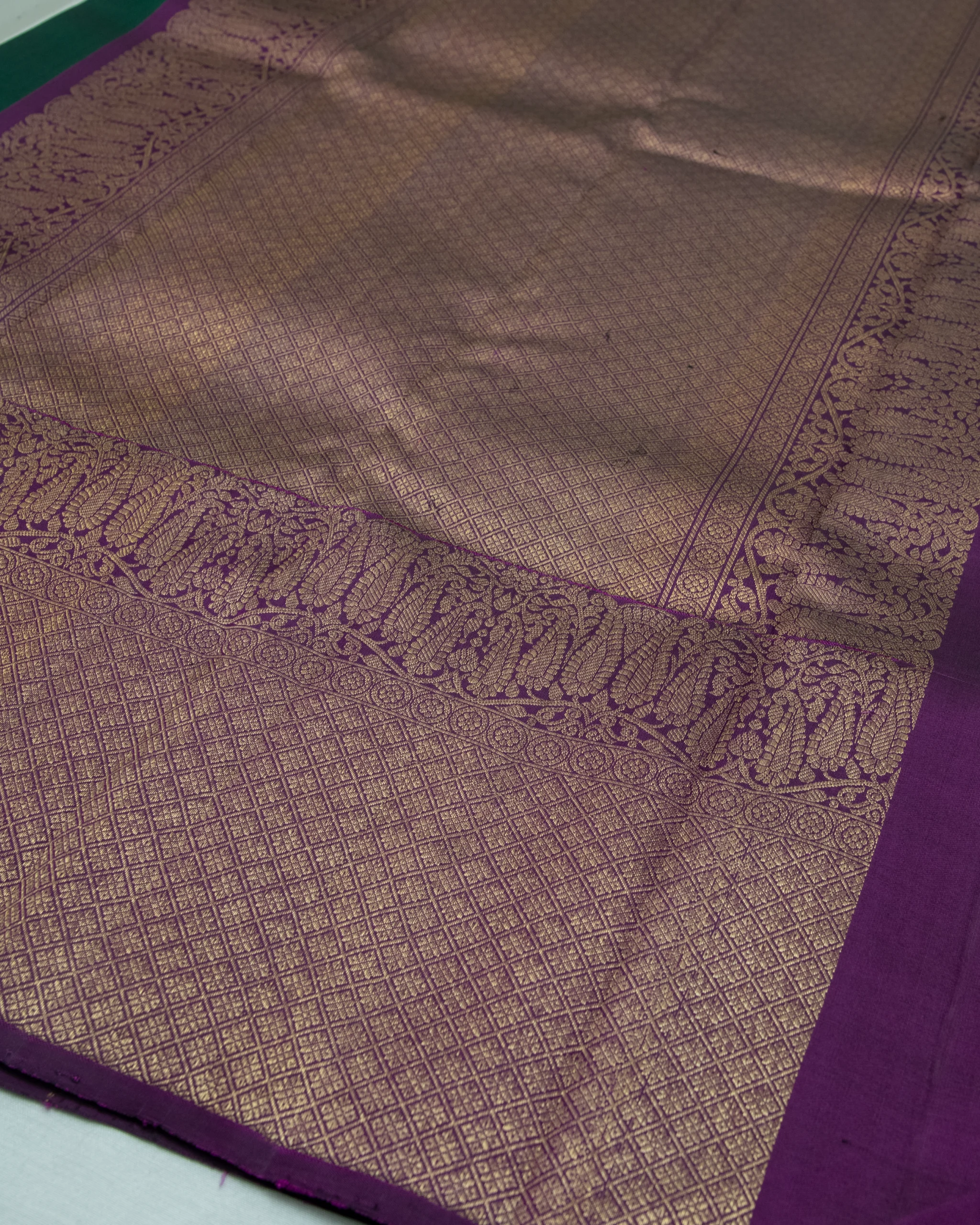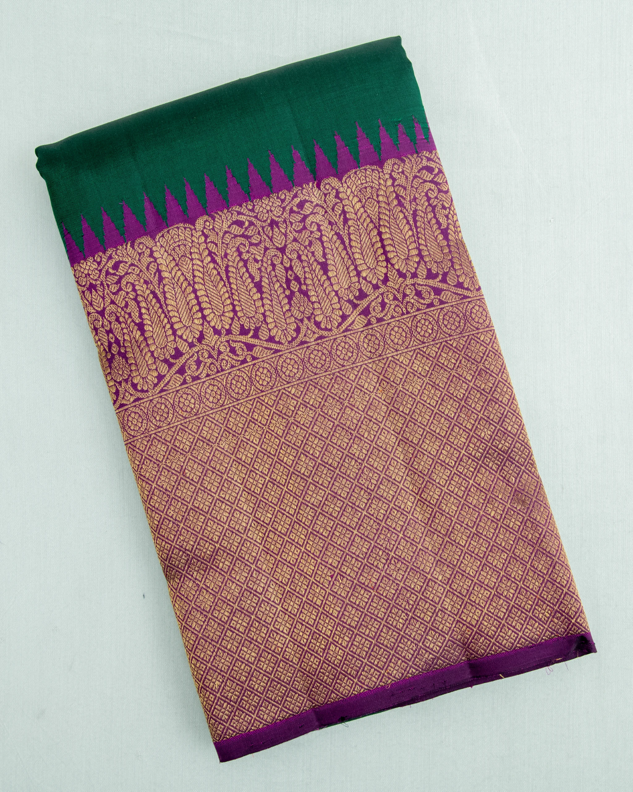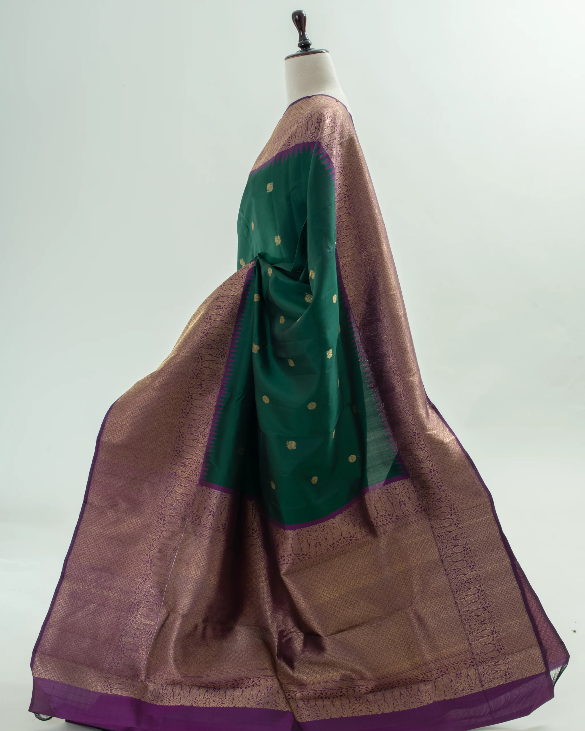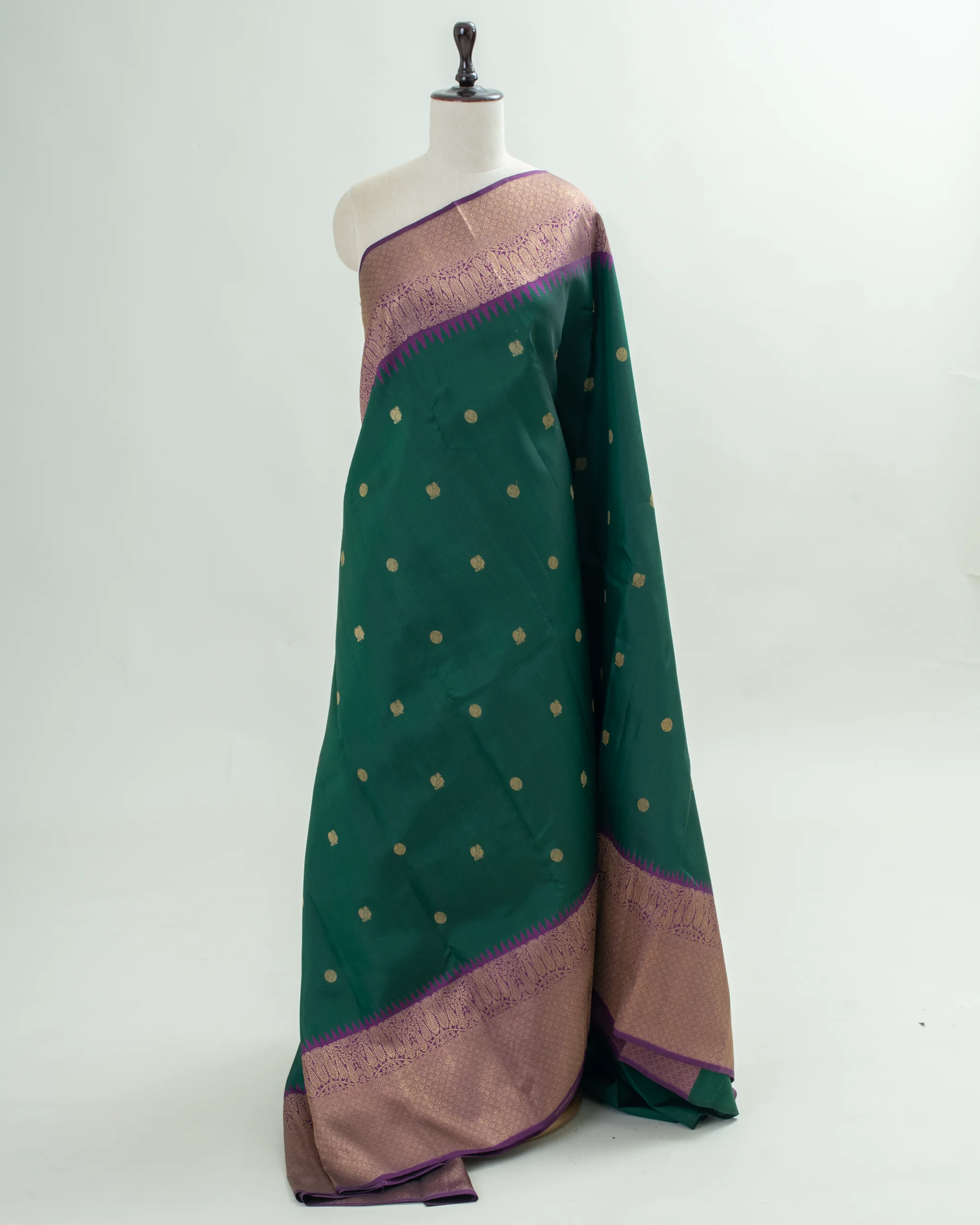 This elegant forest green Kanjivaram silk saree features traditional gold zari buttas, a rich purple temple border, and ornate pallu.
