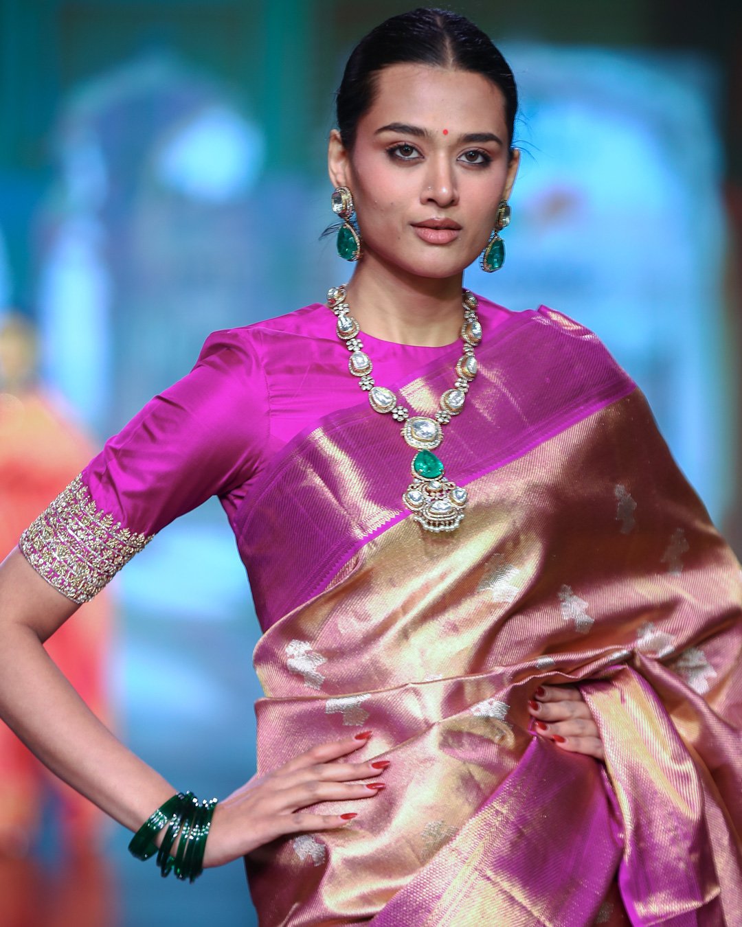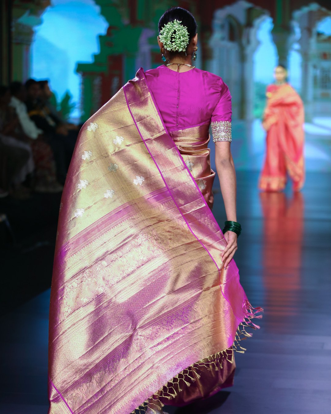 Gold Kanchipattu silk with Iruthalai Pakshi zari buttis, contrast purple korvai border, refined weave, understated bridal charm.