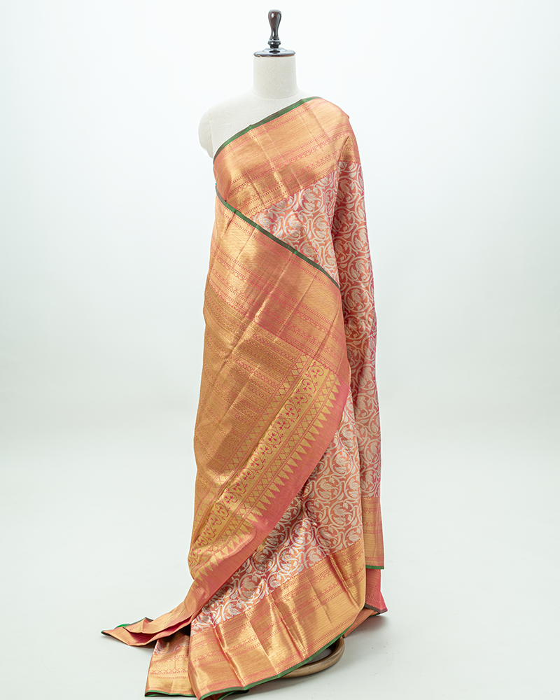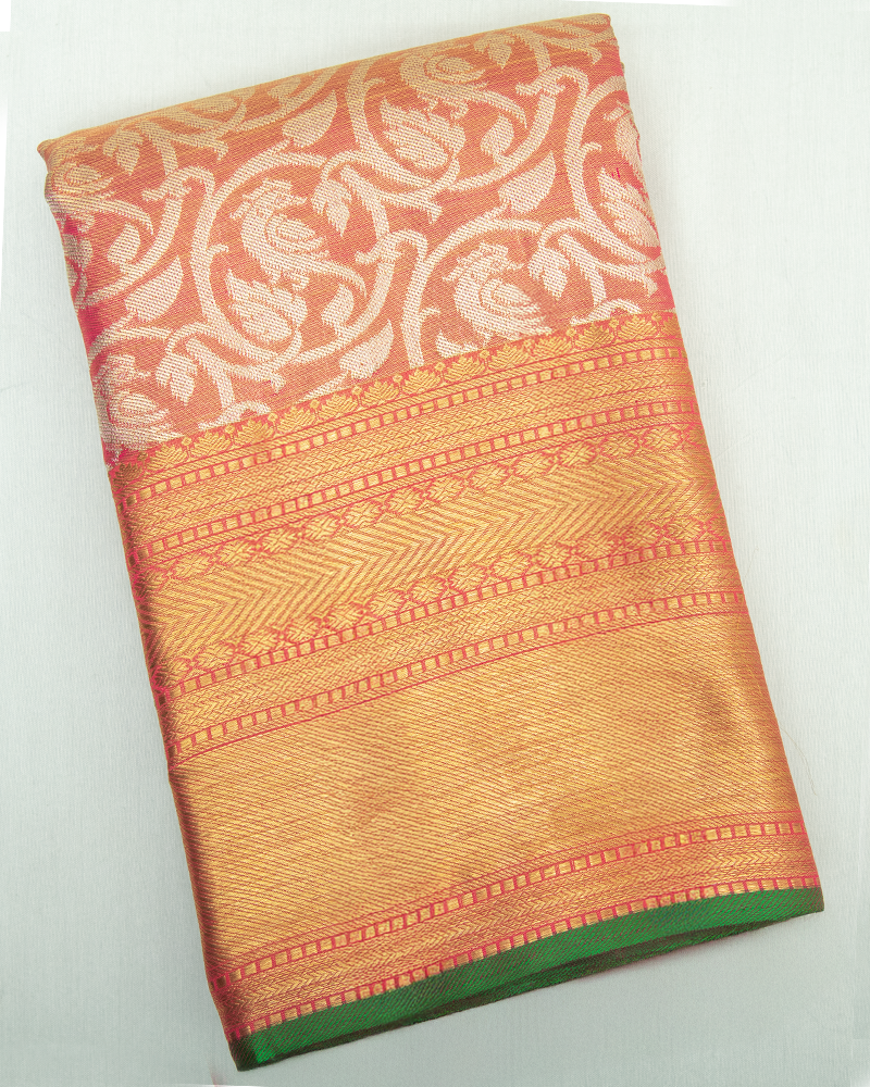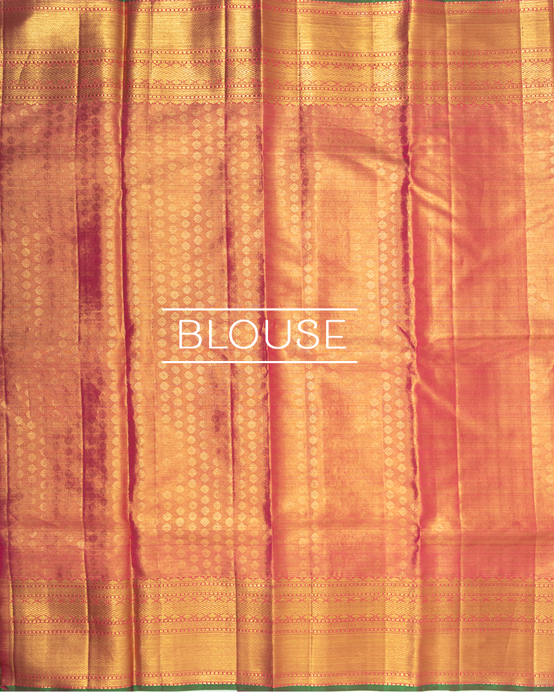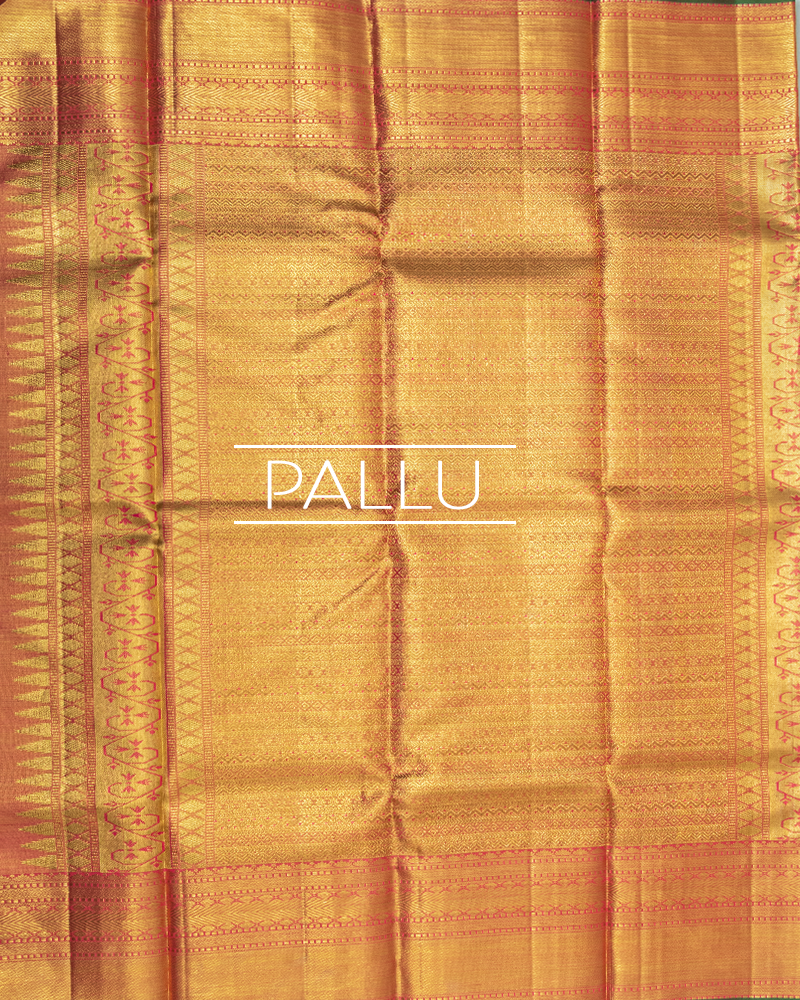 This rich and elegant Kanjivaram is a Gold Tissue masterpiece adorned with delicate Annapakshi motifs. It features a broad, majestic Gold Jari Vel Pettu border and a striking, contrasting Pachai Korvai selvedge, making it the perfect choice for a stunning wedding outfit.