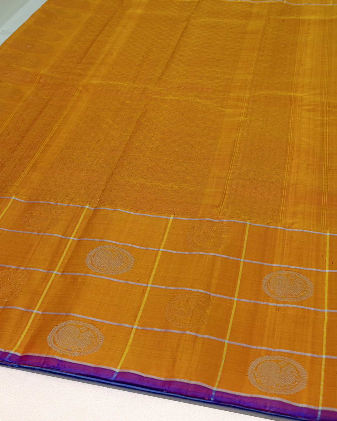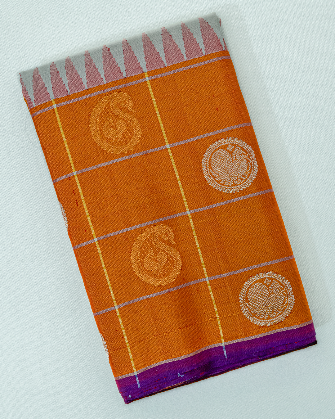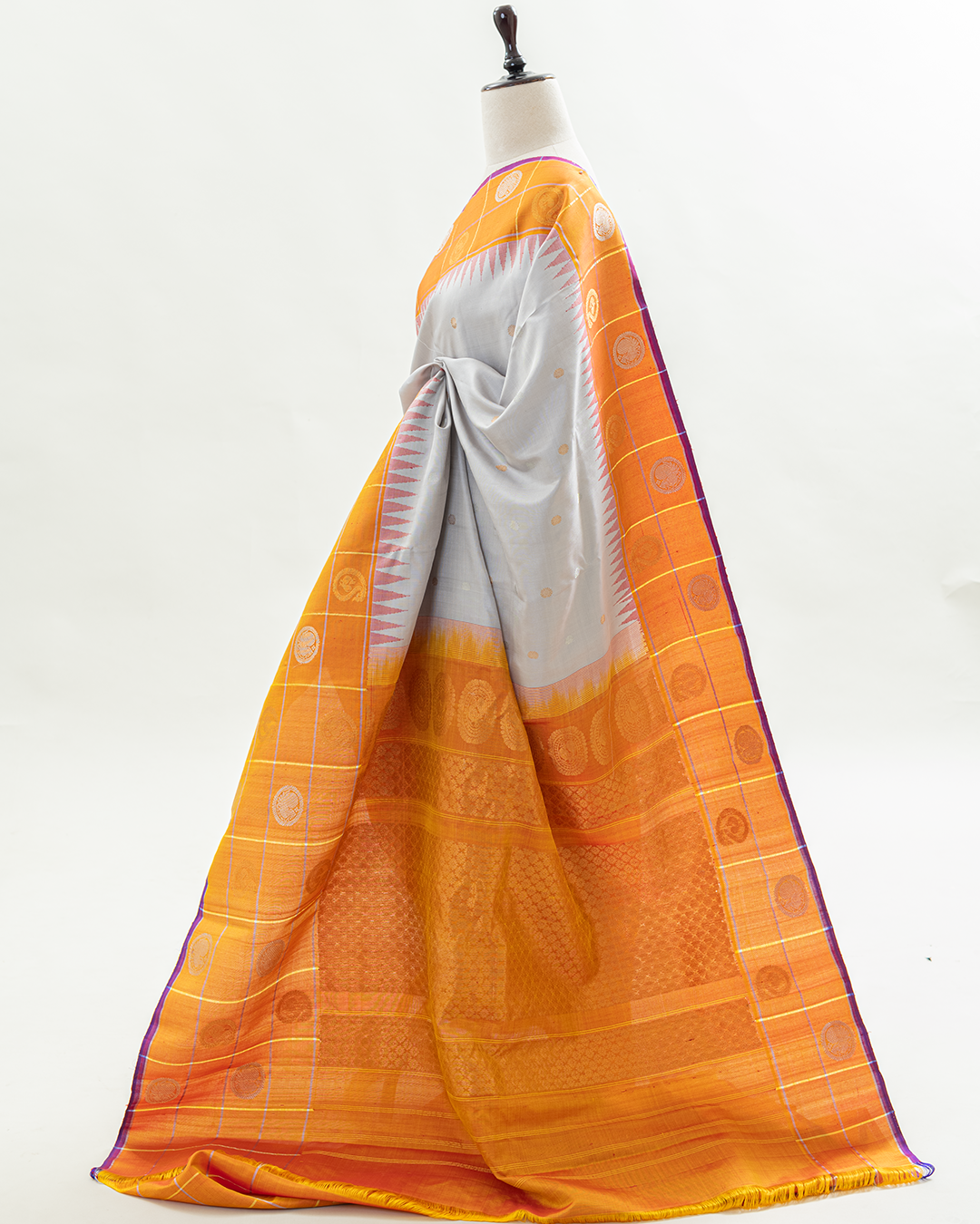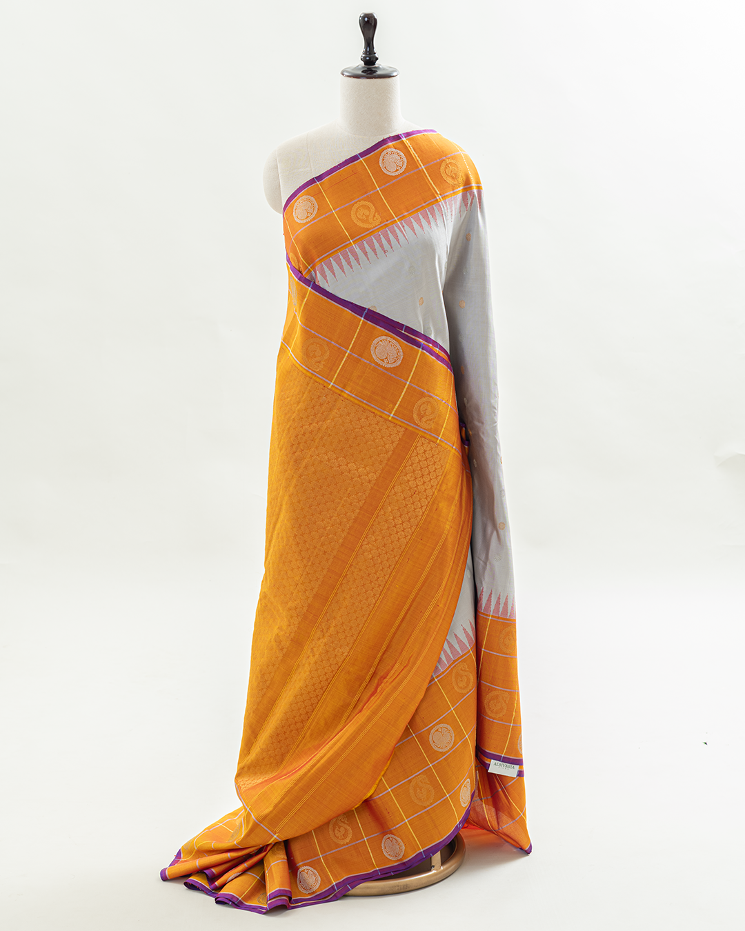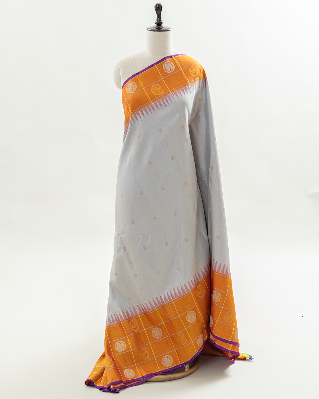 This sophisticated grey handloom Gadwal silk saree features small gold buttas, subtle checkered lines, a vibrant orange temple border, and ornate peacock zari motifs.
