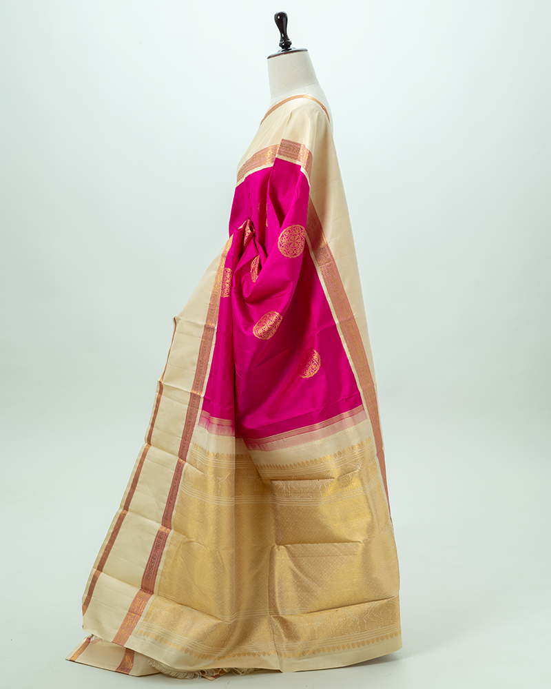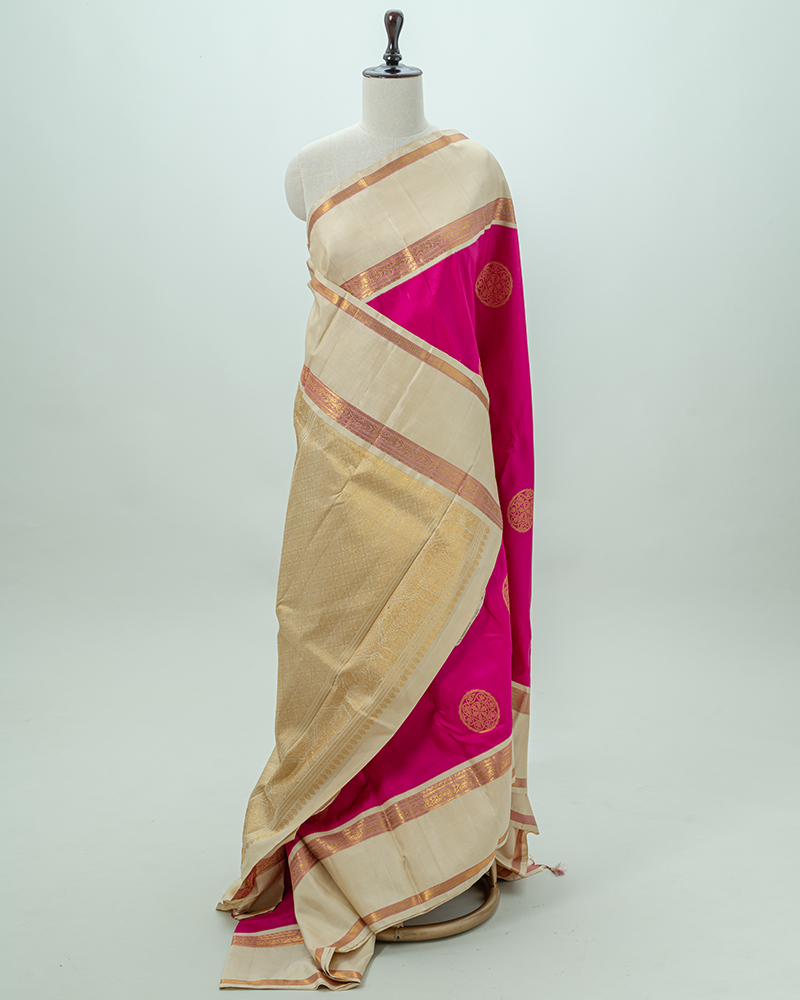 This stunning saree has a hot pink body with bold gold circular buttas, sharply contrasted by a creamy beige pallu featuring rich gold zari brocade.