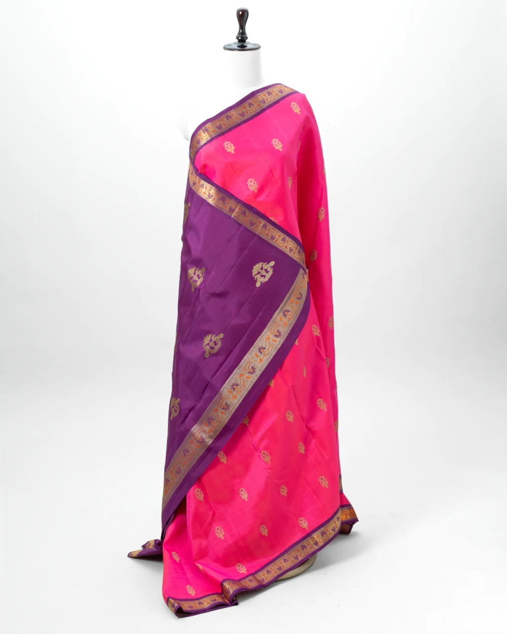 This stunning saree has a hot pink body with bold gold circular buttas, sharply contrasted by a creamy beige pallu featuring rich gold zari brocade.