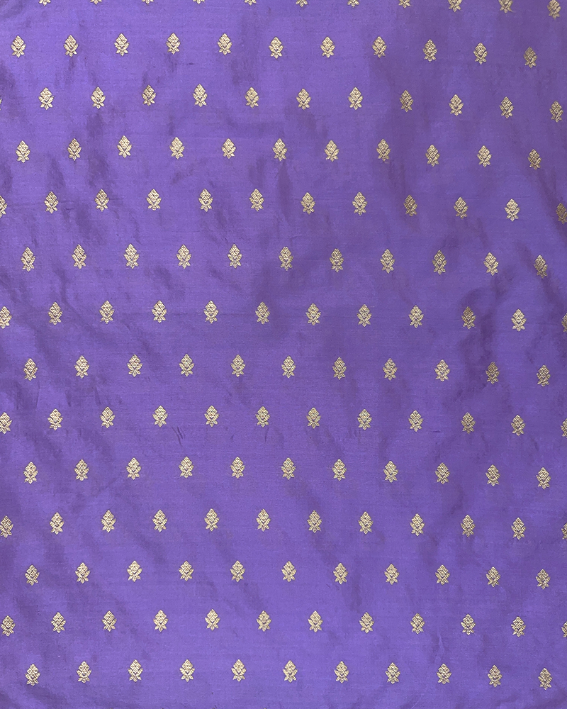 This vibrant lavender silk features a rich slub texture adorned with a repetitive, gold zari pinecone-motif “butta” weaving pattern.