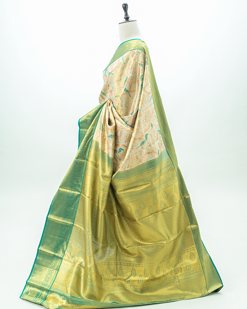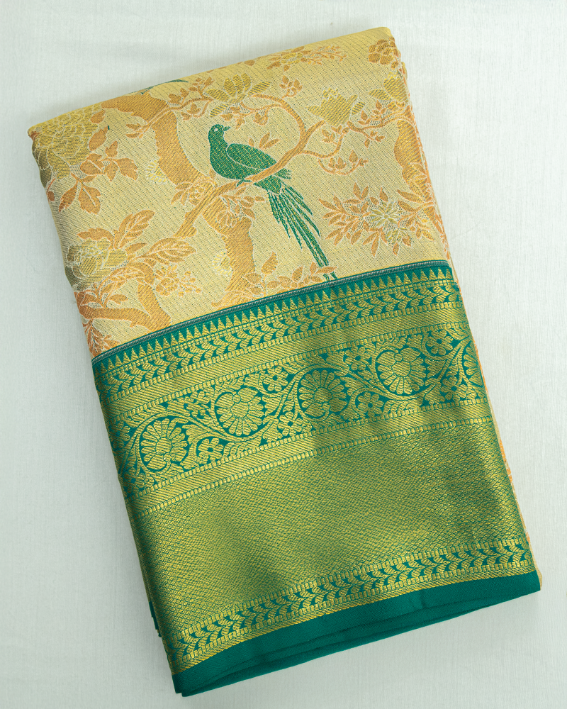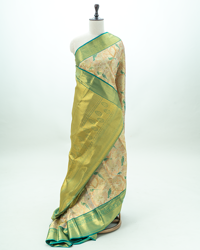 Light Biege & Green border Tissue Kanjivaram Saree