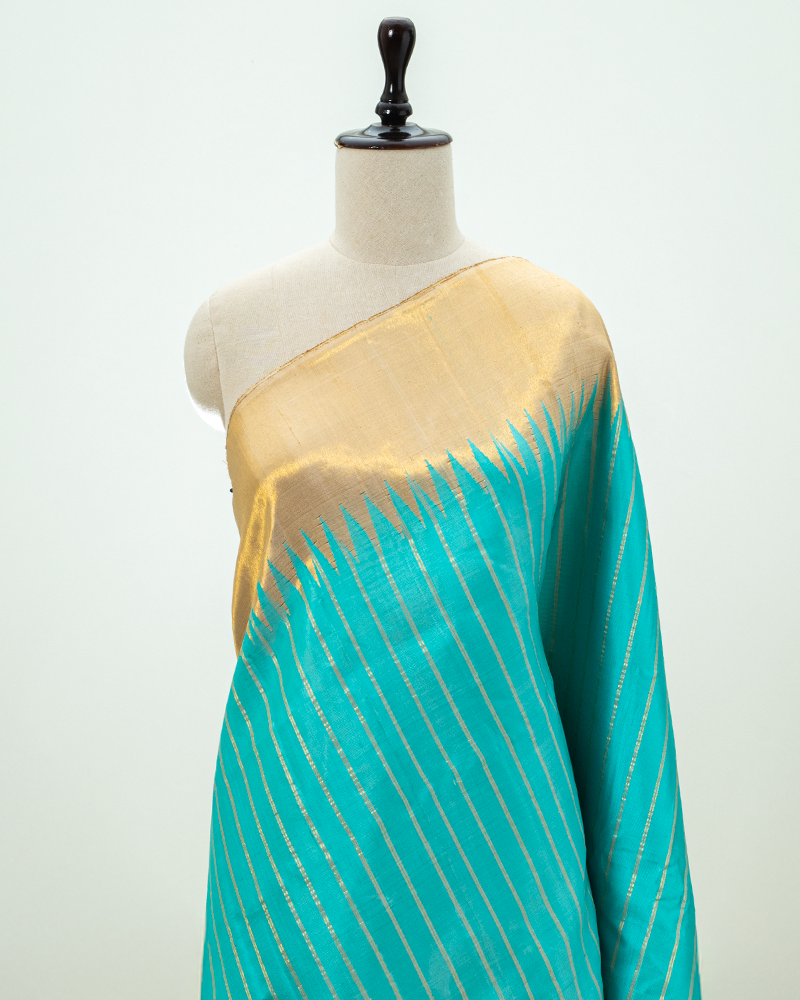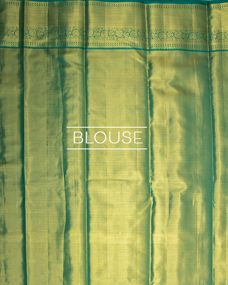 Light green zari-bordered Kanjivaram, featuring gold tissue Vana Singaram brocade on the body and a rich Gold Zari Pallu.