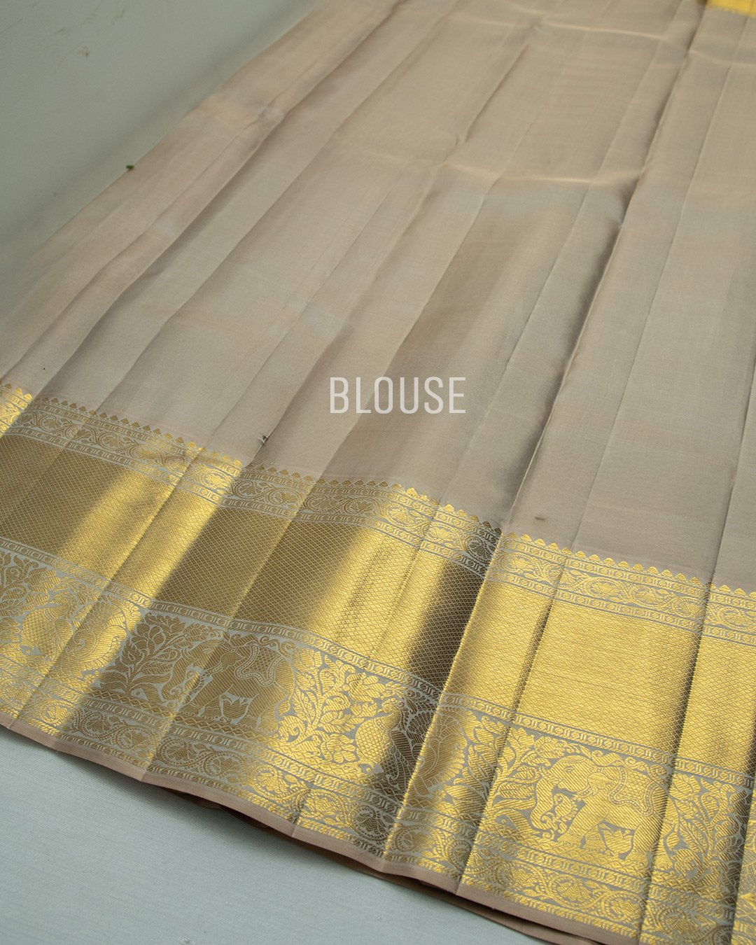 This soft Sandhanam silk features all-over Zari Kattam and a rich golden Pallu with detailed geometric patterns, perfect for subtle elegance