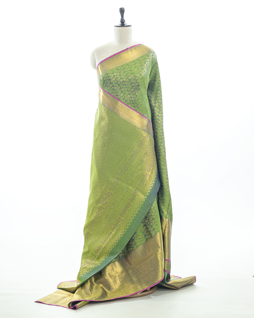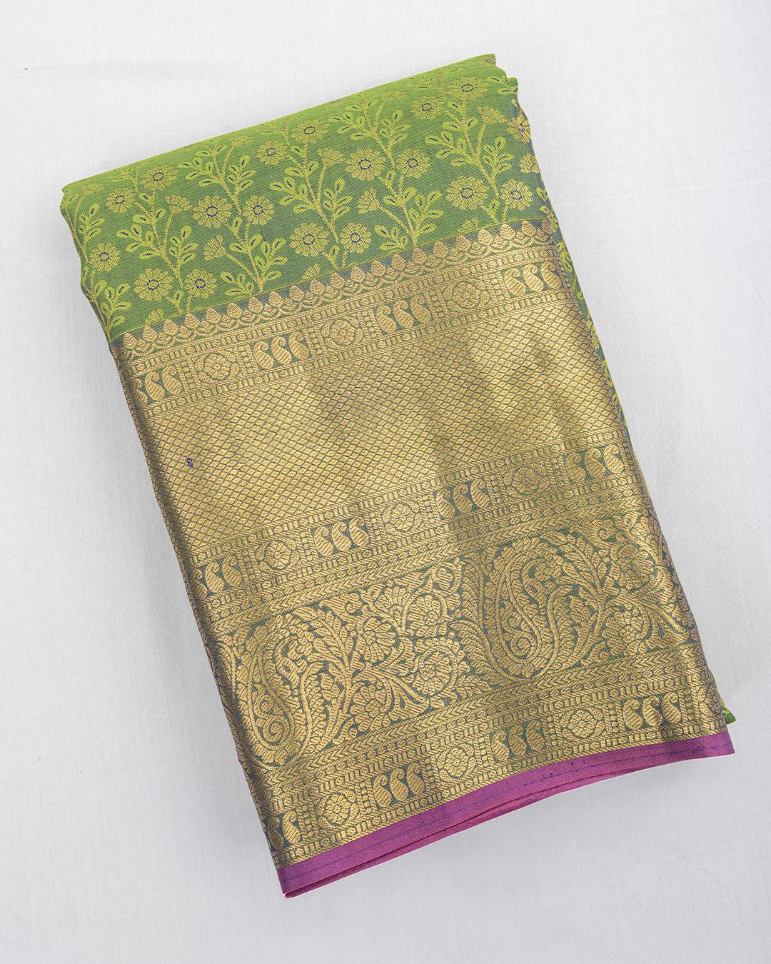 This lime-green Kanjivaram features an all-over floral Kodi Jall weave, complemented by a grand Kaddi border enriched with traditional Maanga and floral motifs.
