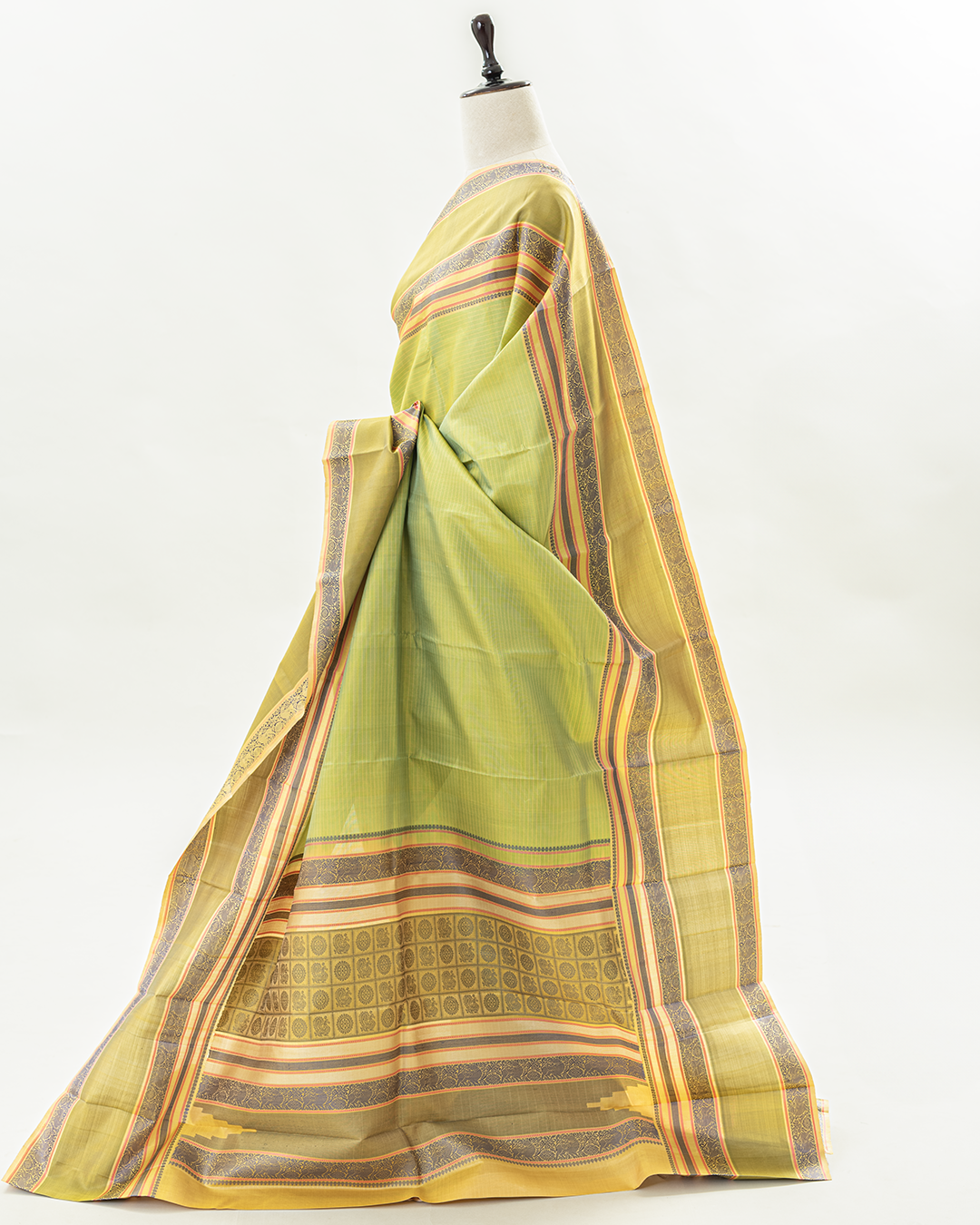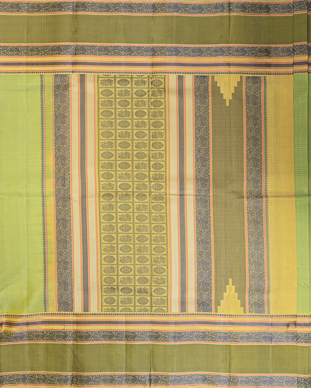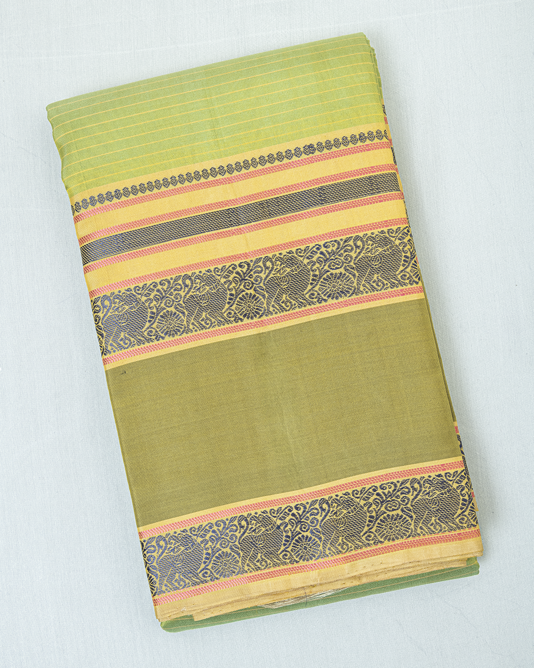 Lime-green body with fine vairoosi stripes, framed by a contrast navy border featuring a traditional Kodi Visiri floral vine and Mayil weave.