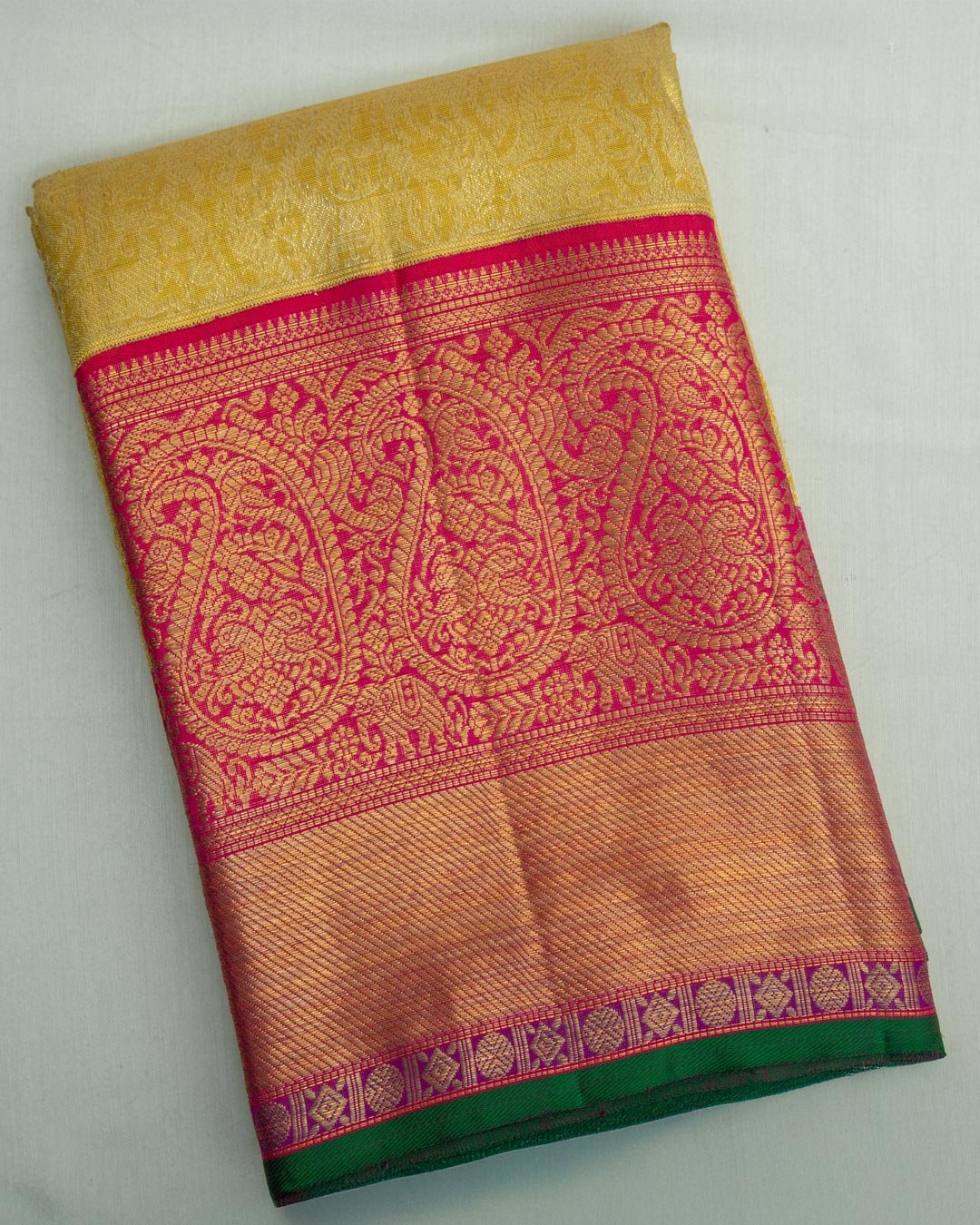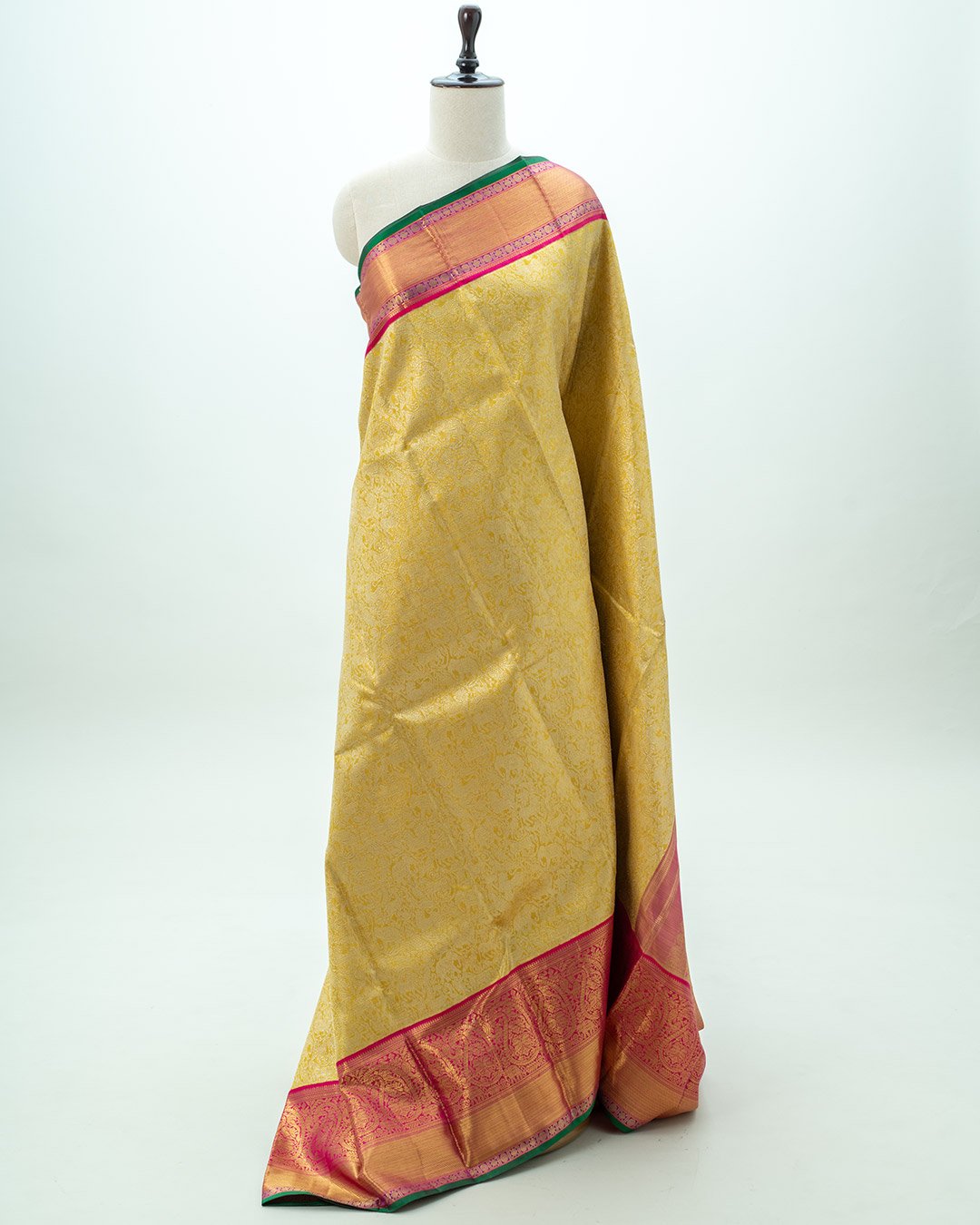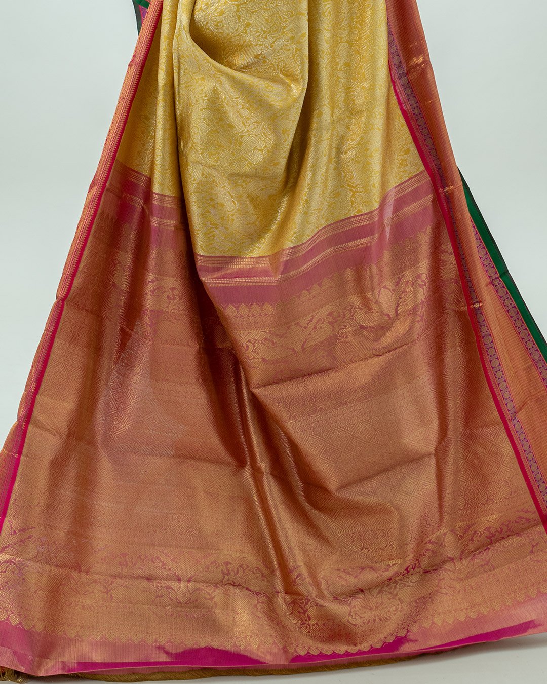 Lustrous golden tissue kanjivaram silk saree with a pink contrast border. Delicate zari booties cover the body, accented by heavy gold paisley patterns.