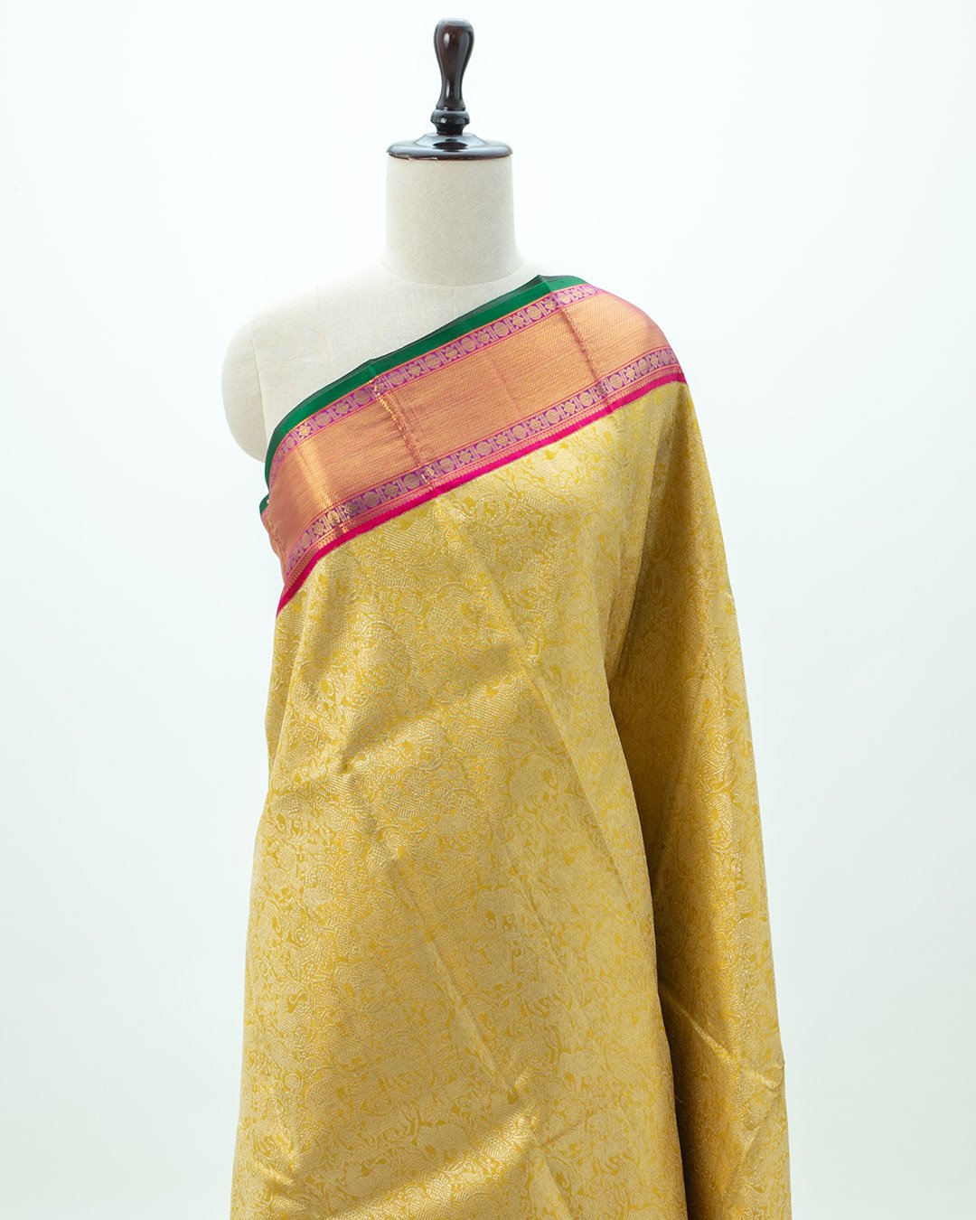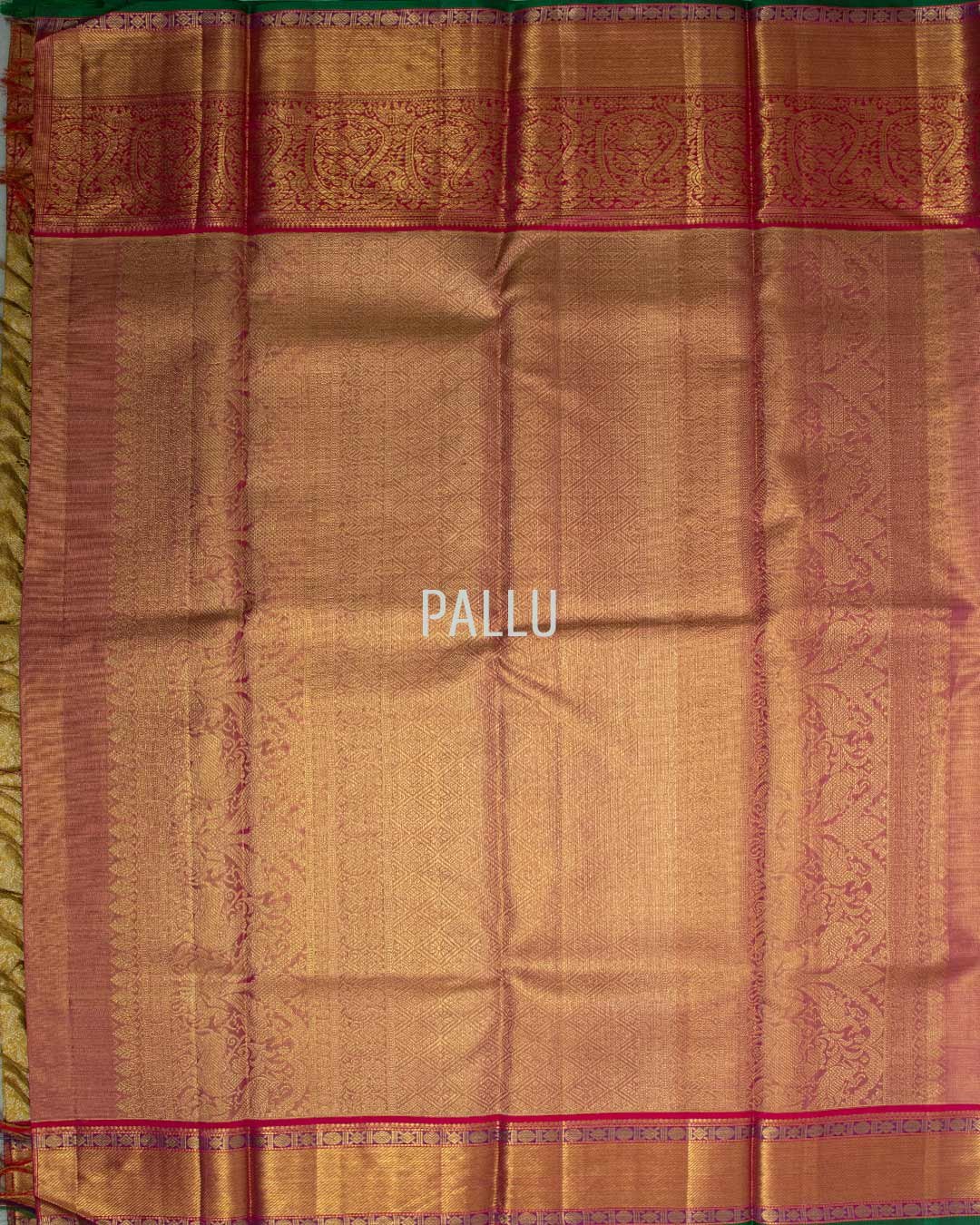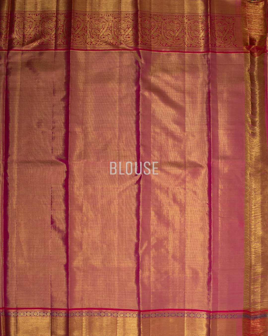Lustrous golden tissue kanjivaram silk saree with a pink contrast border. Delicate zari booties cover the body, accented by heavy gold paisley patterns.