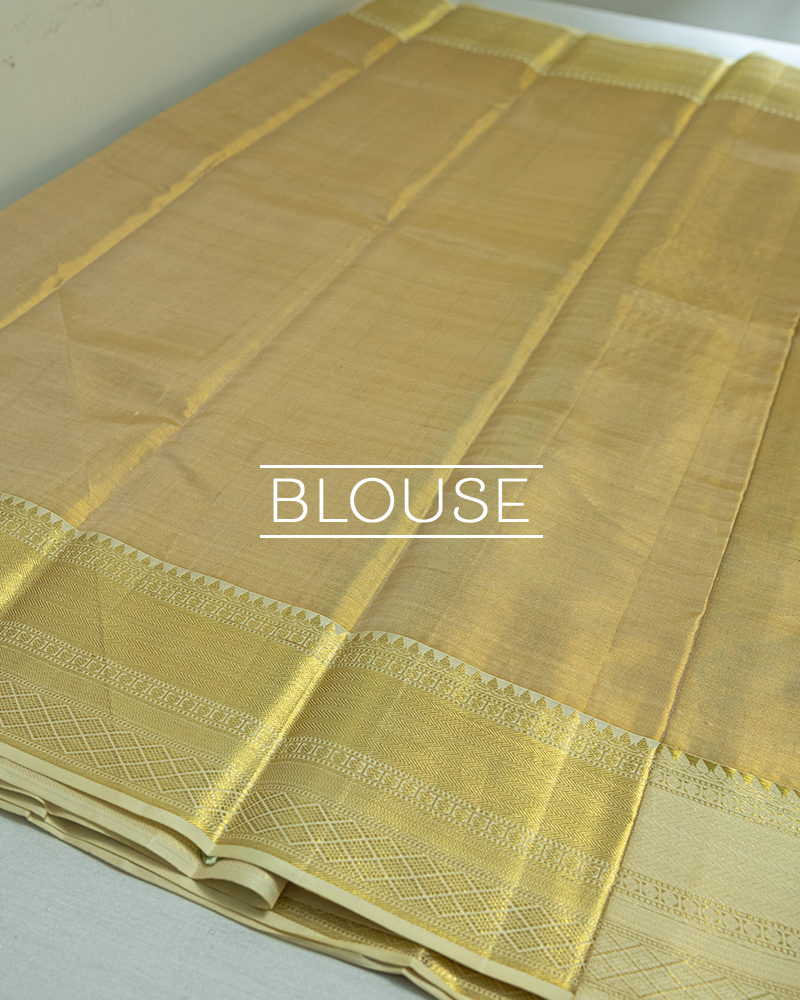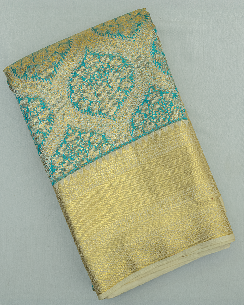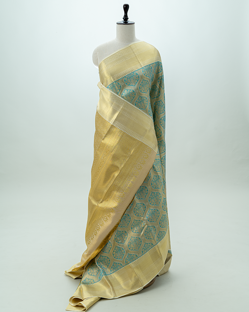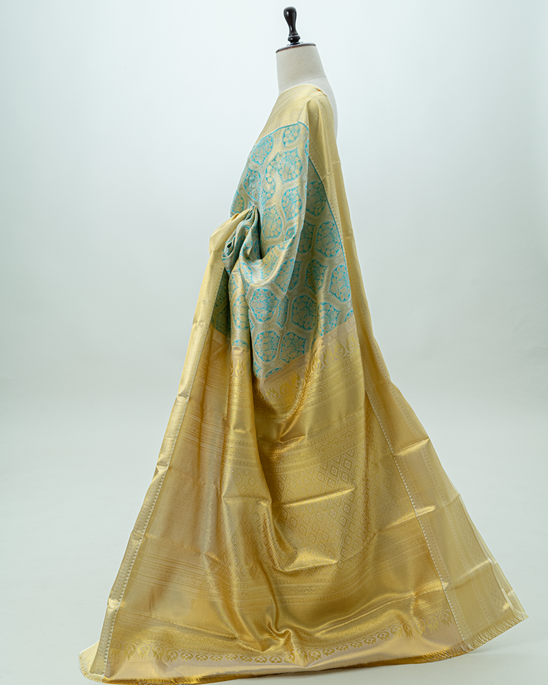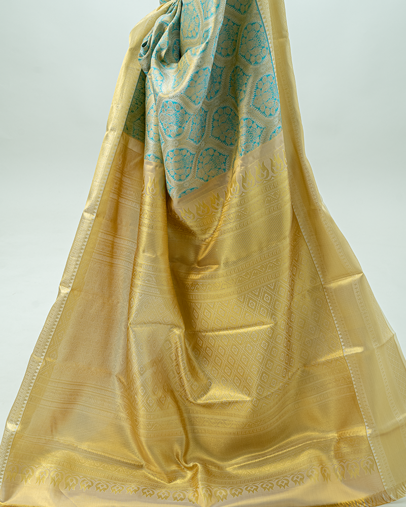 This saree is a lustrous Teal Tissue Kanjivaram with Gold zari creating continuous Kumbam/Chakra buttis and a rich, solid gold border and pallu.