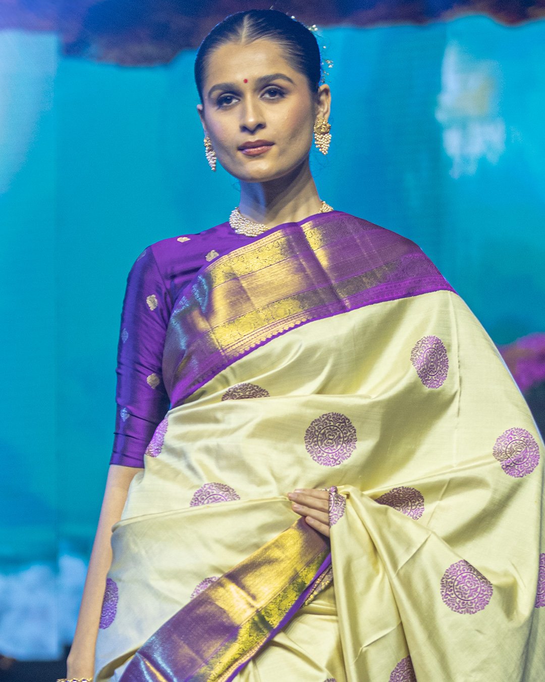 Cream silk with purple Chakra Butta motifs, featuring a dual-tone gold and Vadamalli (purple) Korvai border and pallu.