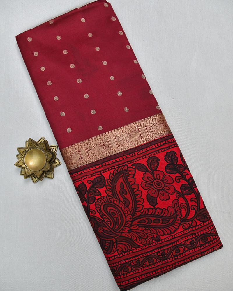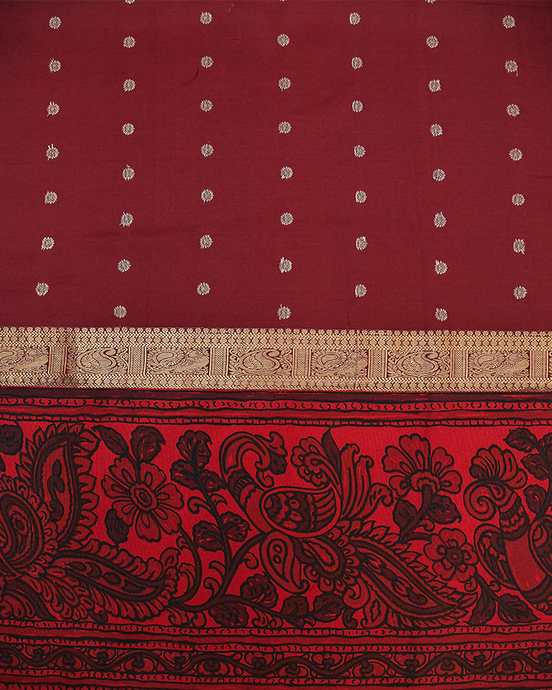 Rich Maroon body with Golden buttas, featuring a striking Red Kalamkari border. The hand-painted style showcases bold Mayil (peacock) and floral vines in rich organic tones.