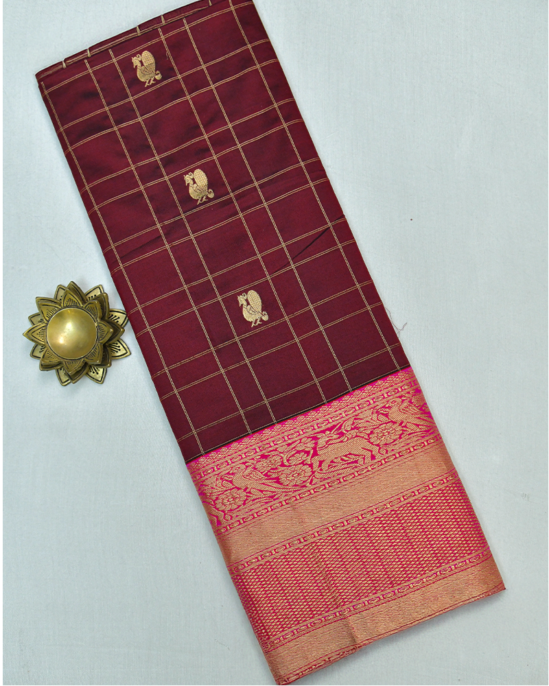 This Kanchipuram Silk features a Maroon Kattam body with Mayil Chakram (Peacock & Chakram) and floral buttas, framed by a pink Korvai border with Vanasingaram motifs.