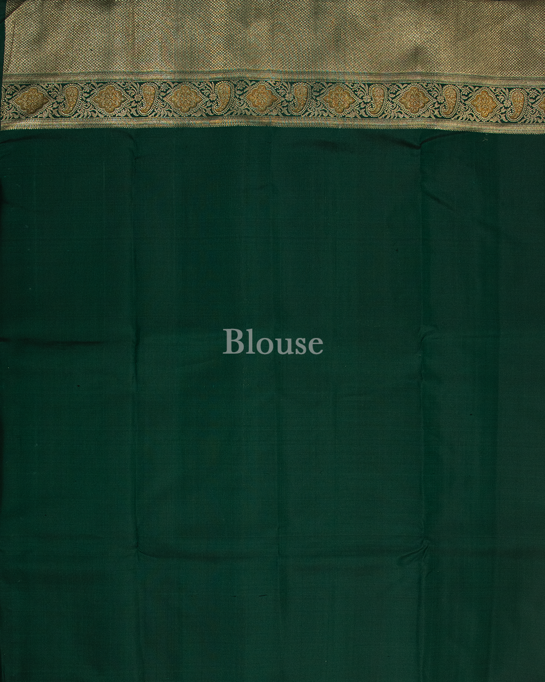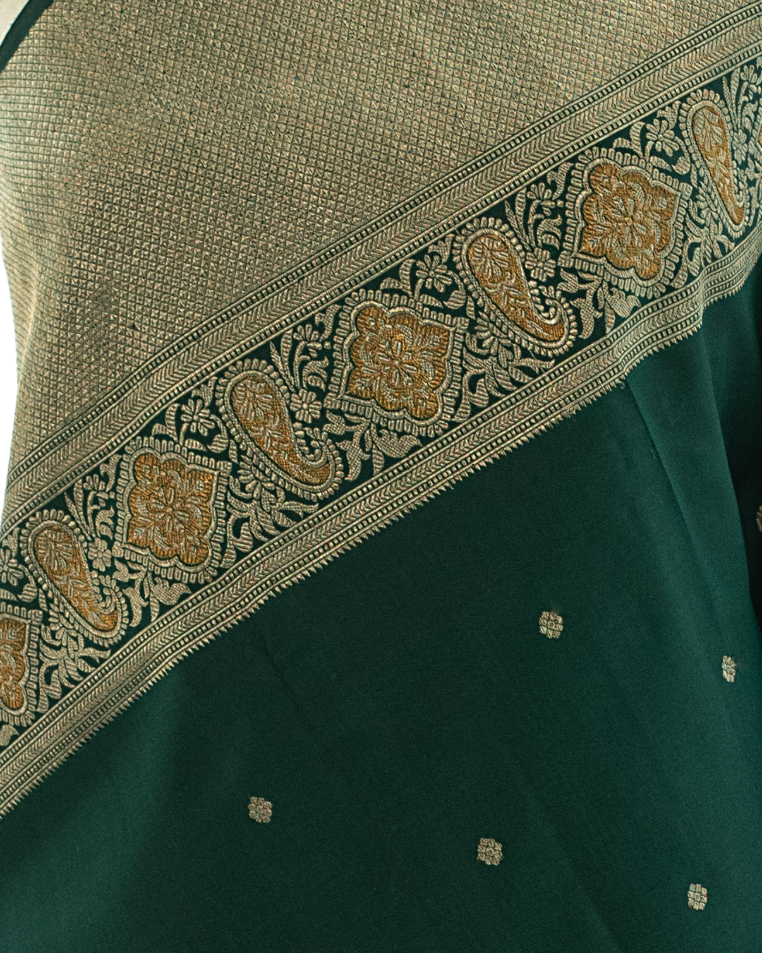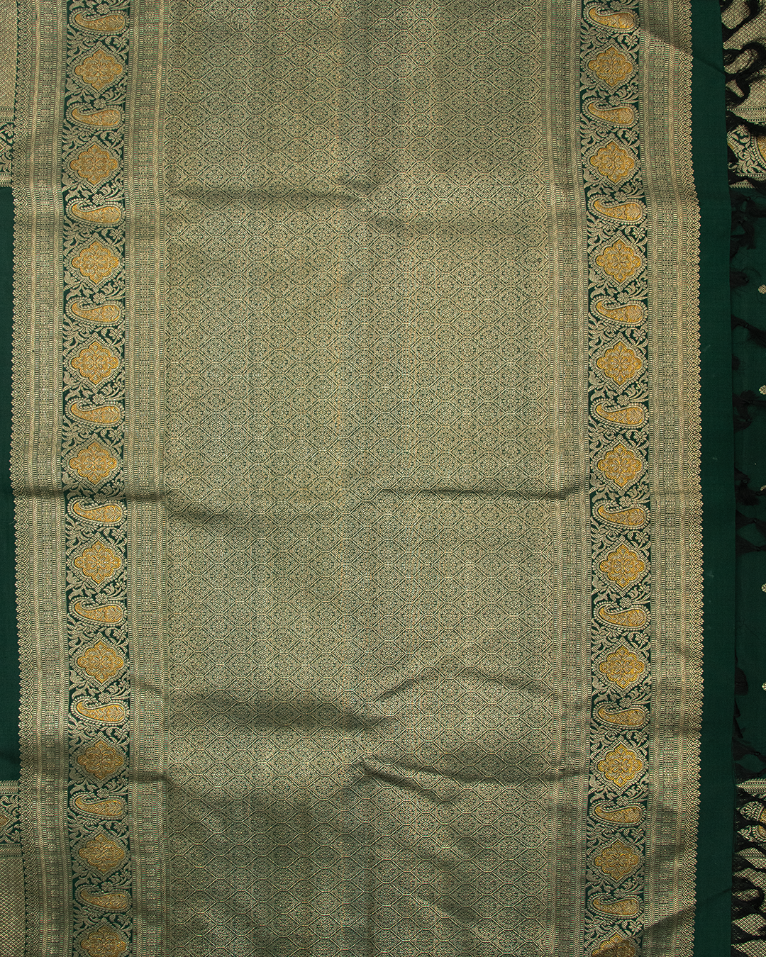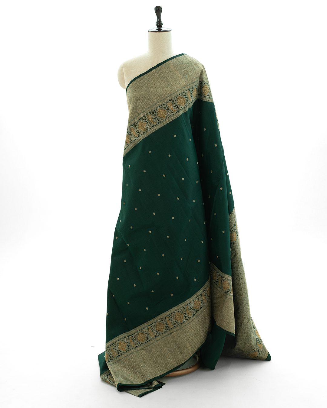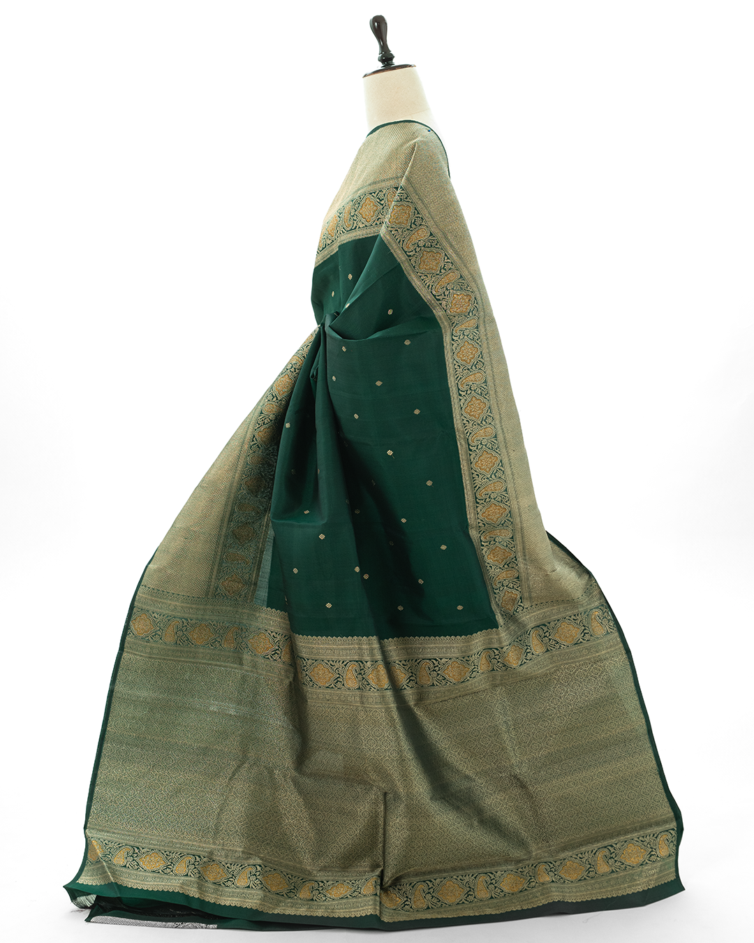 Matte Bottle Green Kanjivaram silk saree showcases delicate gold zari buttas and a majestic paisley border, complemented by a densely woven, shimmering pallu.