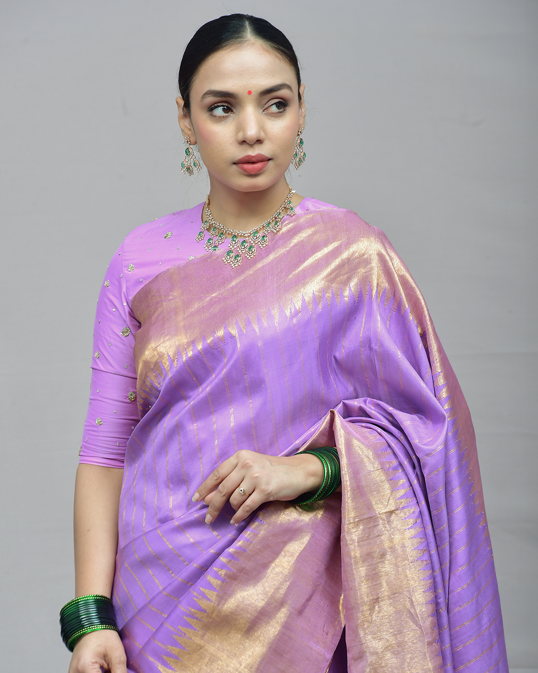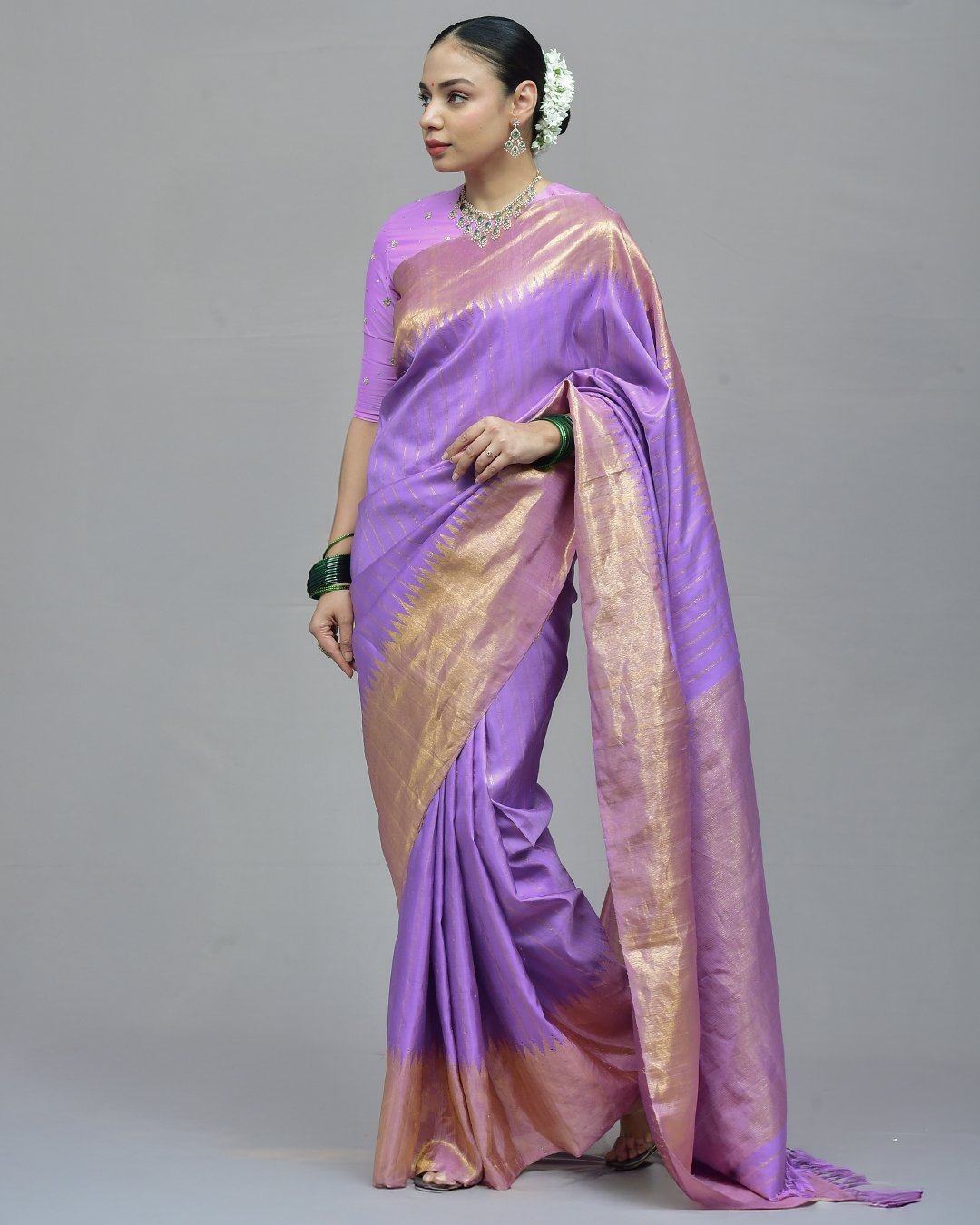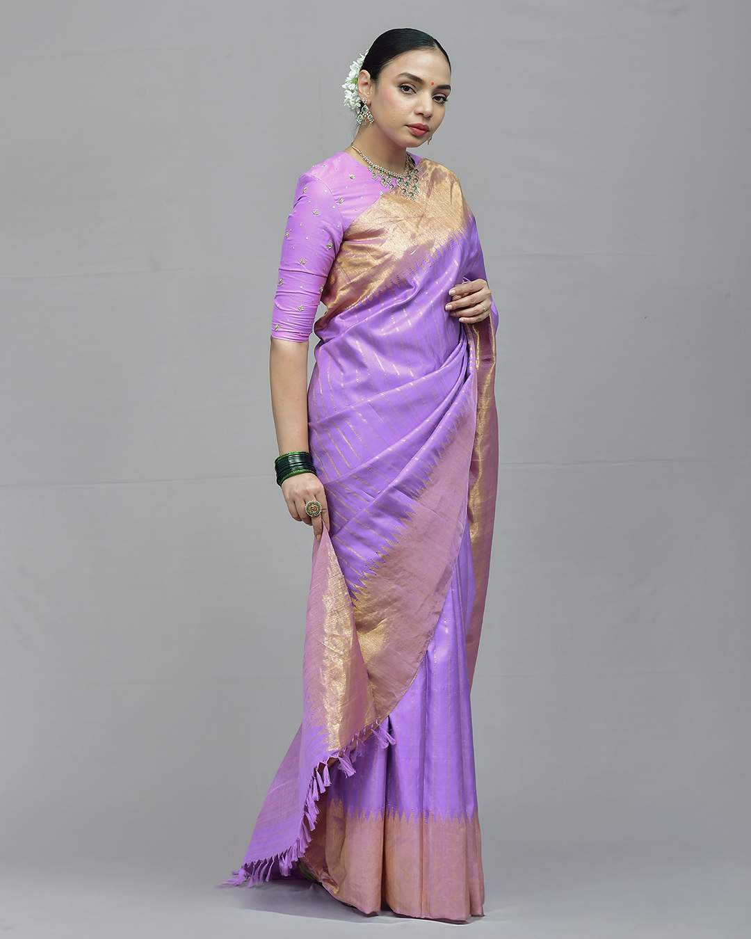 This pure Gadwal silk saree features a graceful lavender body adorned with sea green woven buttas, complemented by a striking aqua-green temple border.