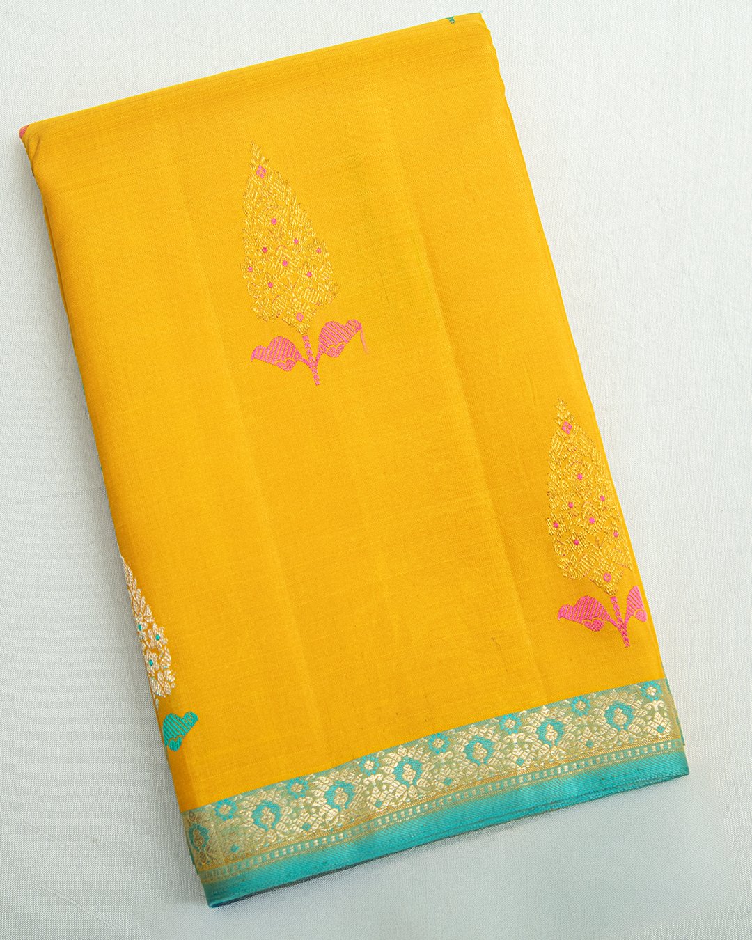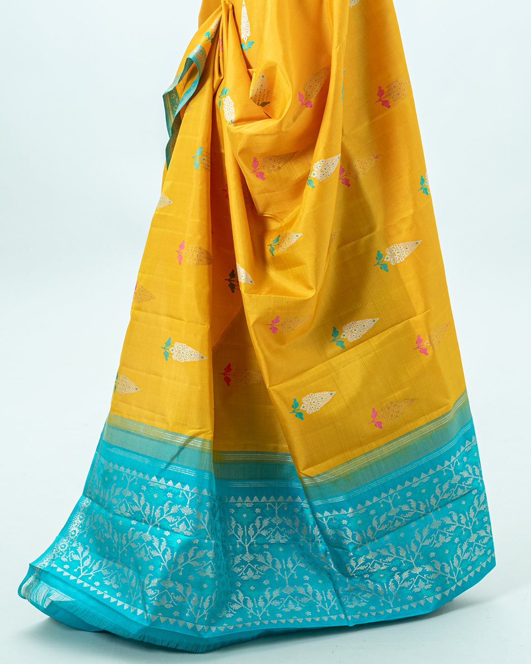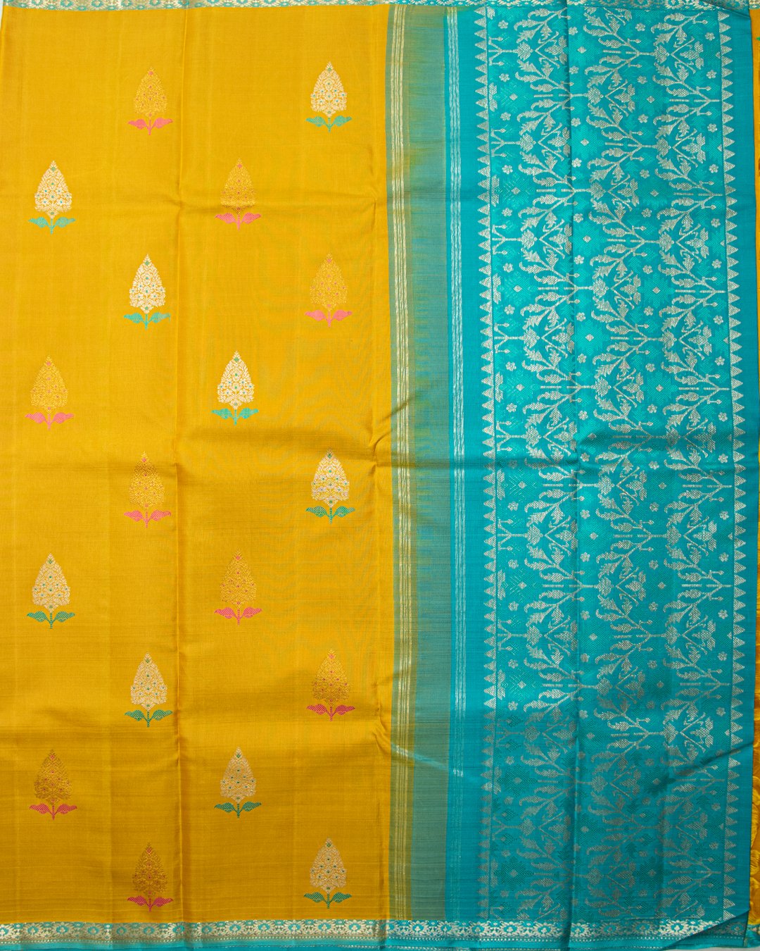 This Kanjivaram silk saree is a vibrant mustard yellow with contrasting turquoise-blue borders and features delicate paisley and floral zari buttis.