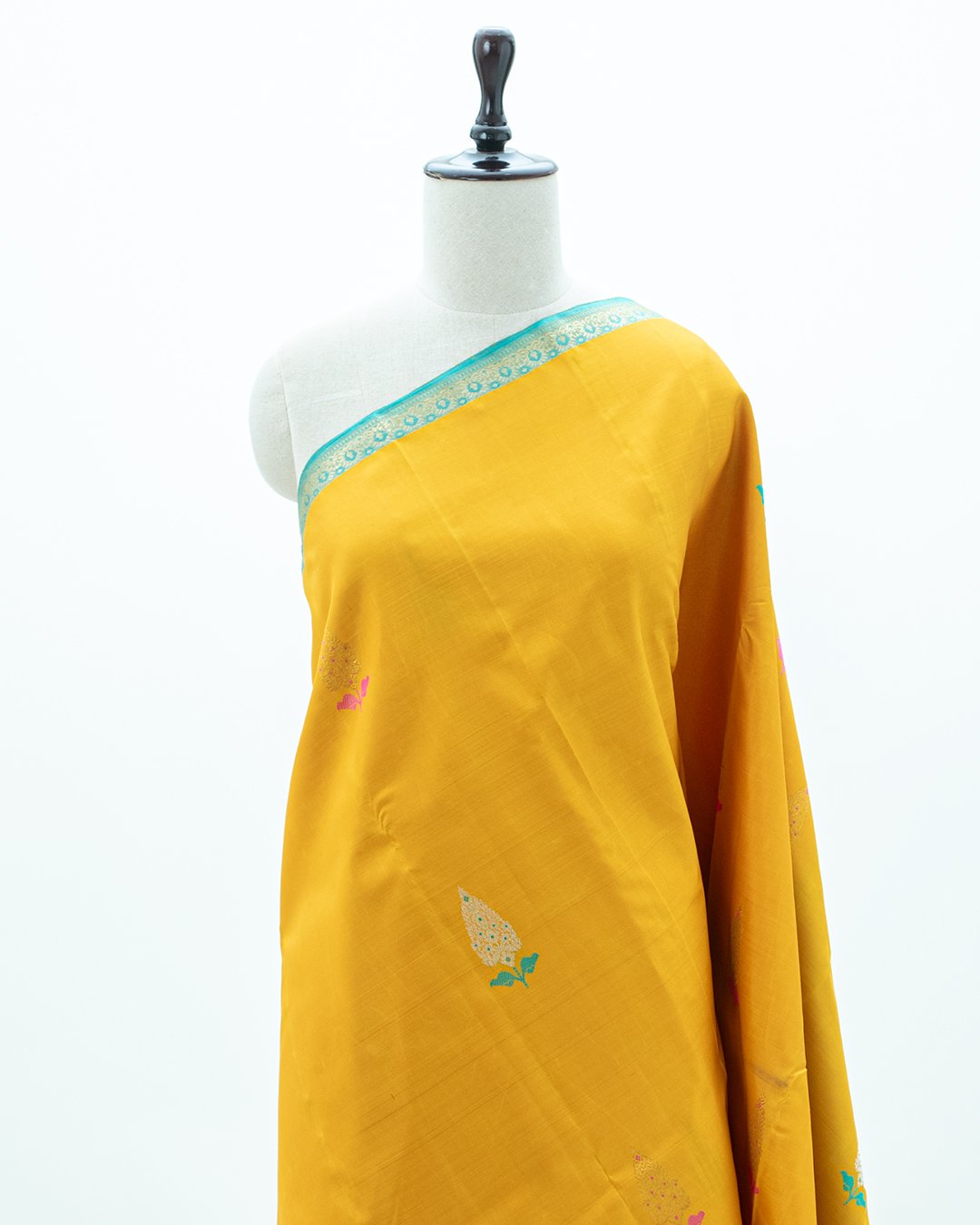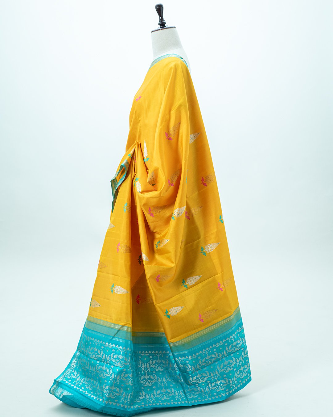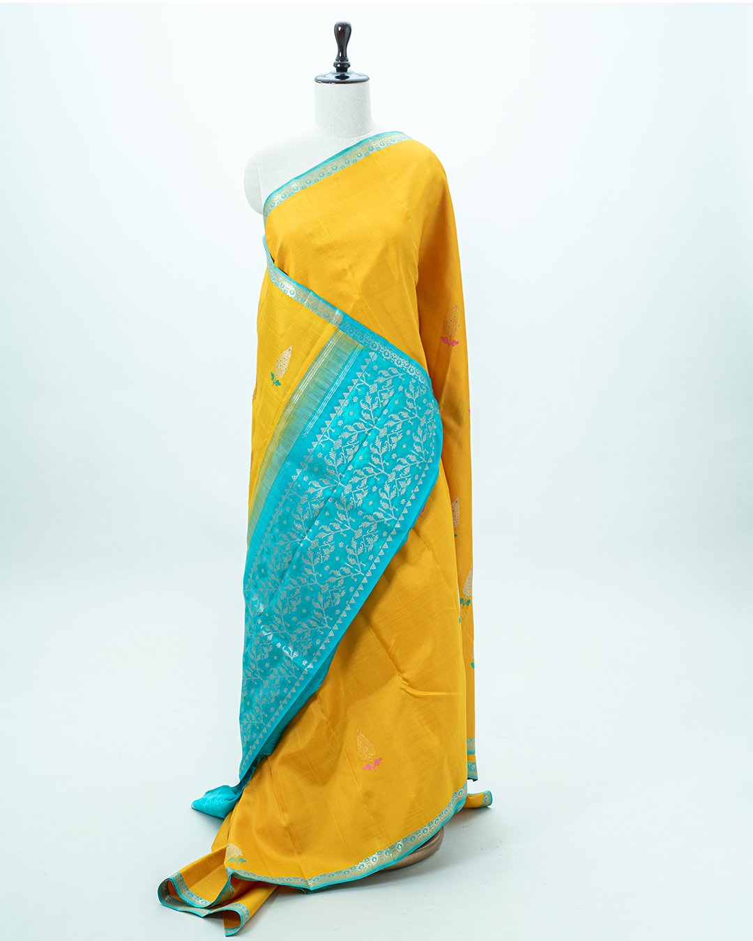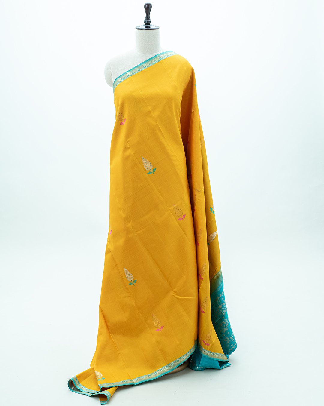 This Kanjivaram silk saree is a vibrant mustard yellow with contrasting turquoise-blue borders and features delicate paisley and floral zari buttis.