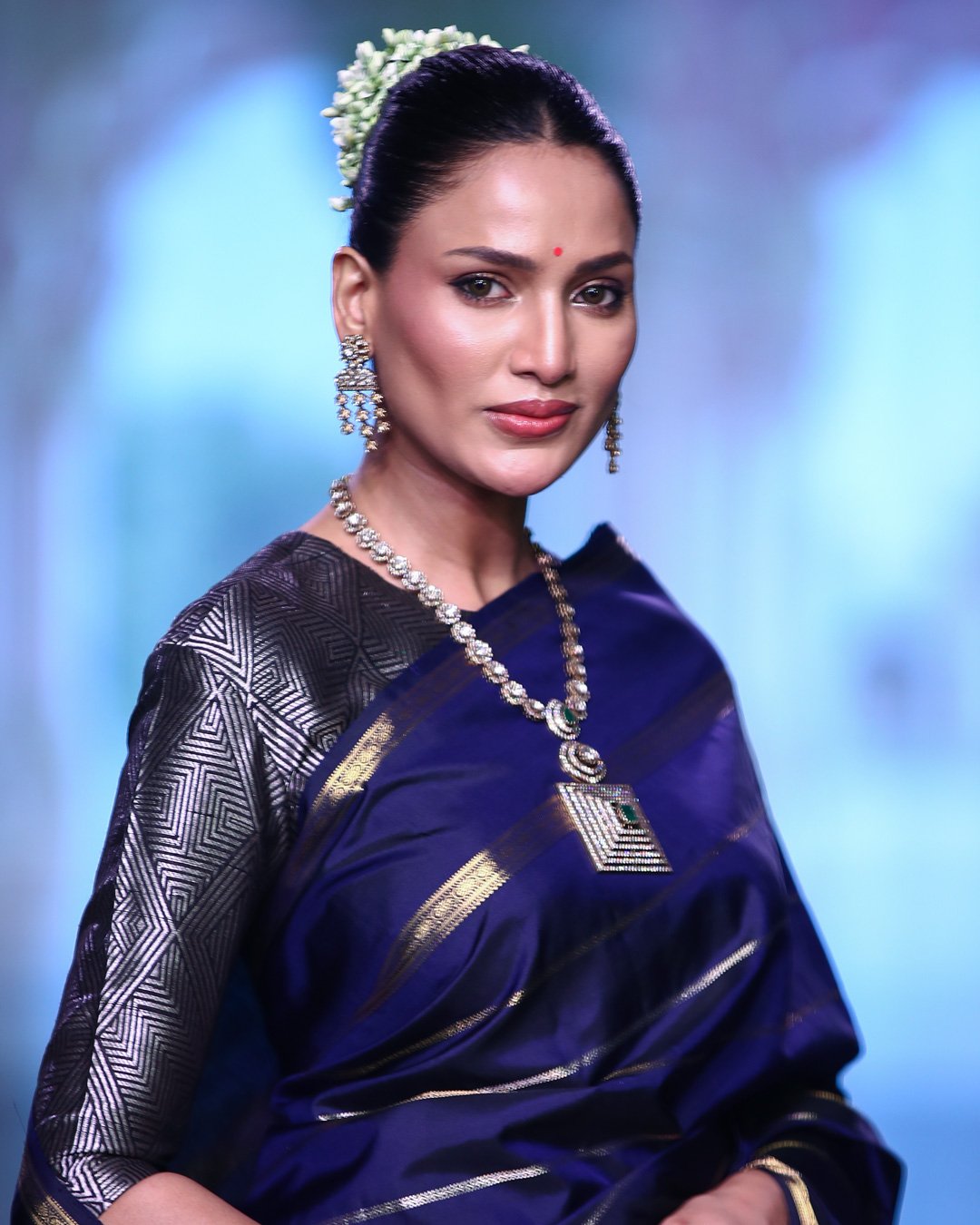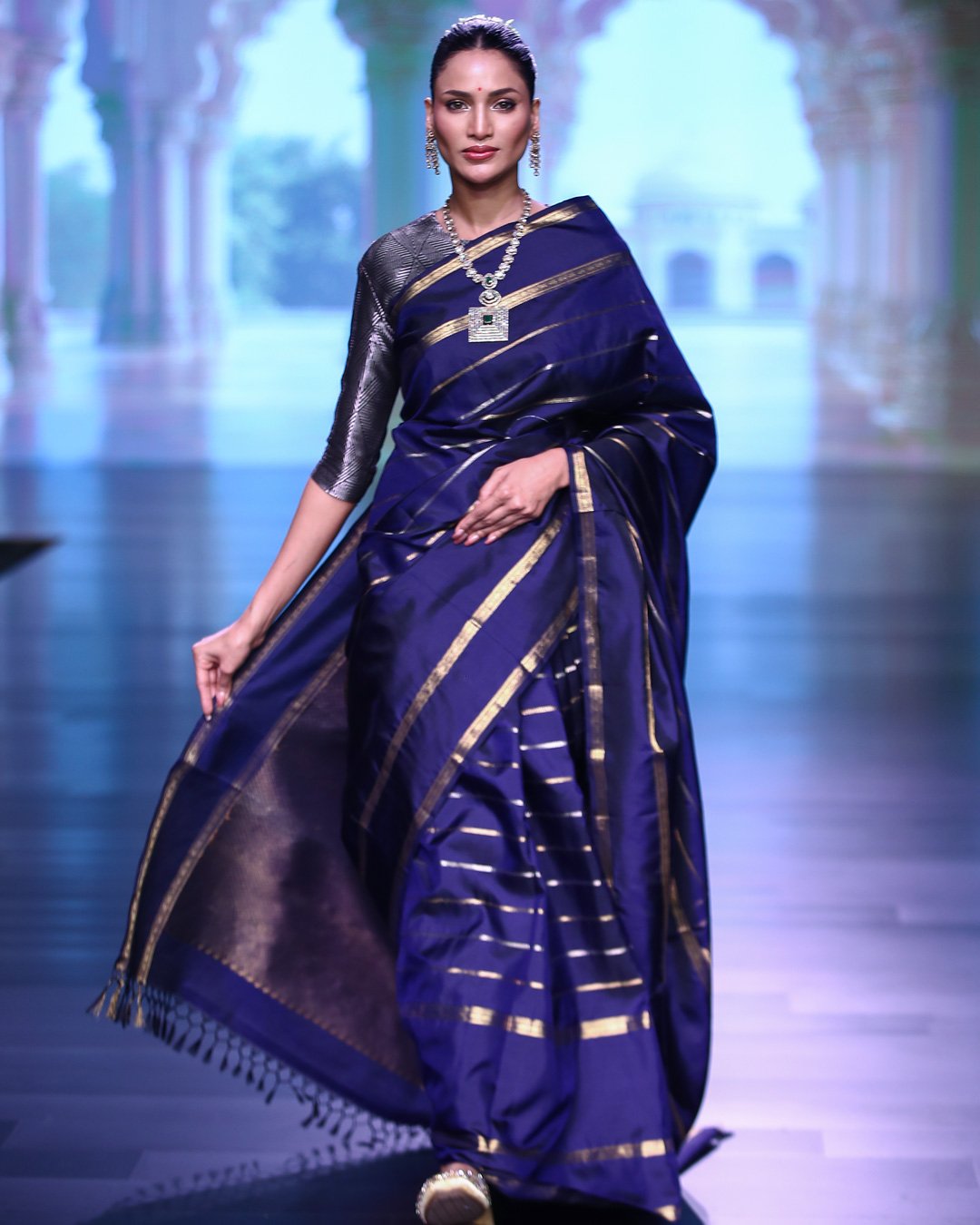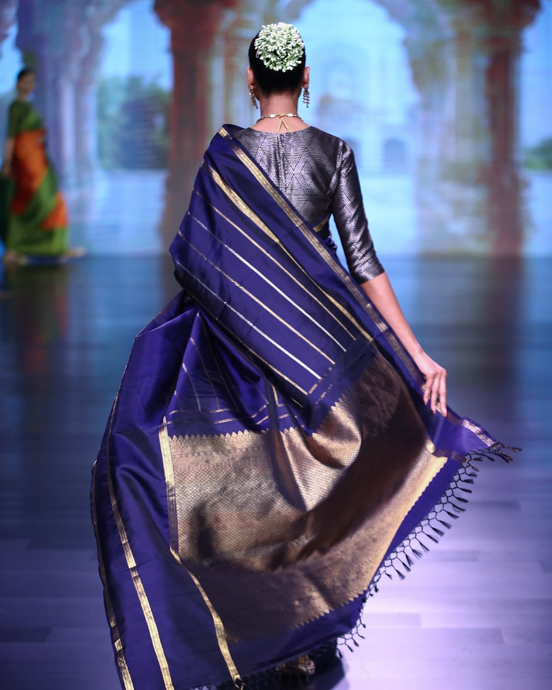Navy blue Kanchipattu saree with refined zari stripe detailing and classic borders for understated elegance.