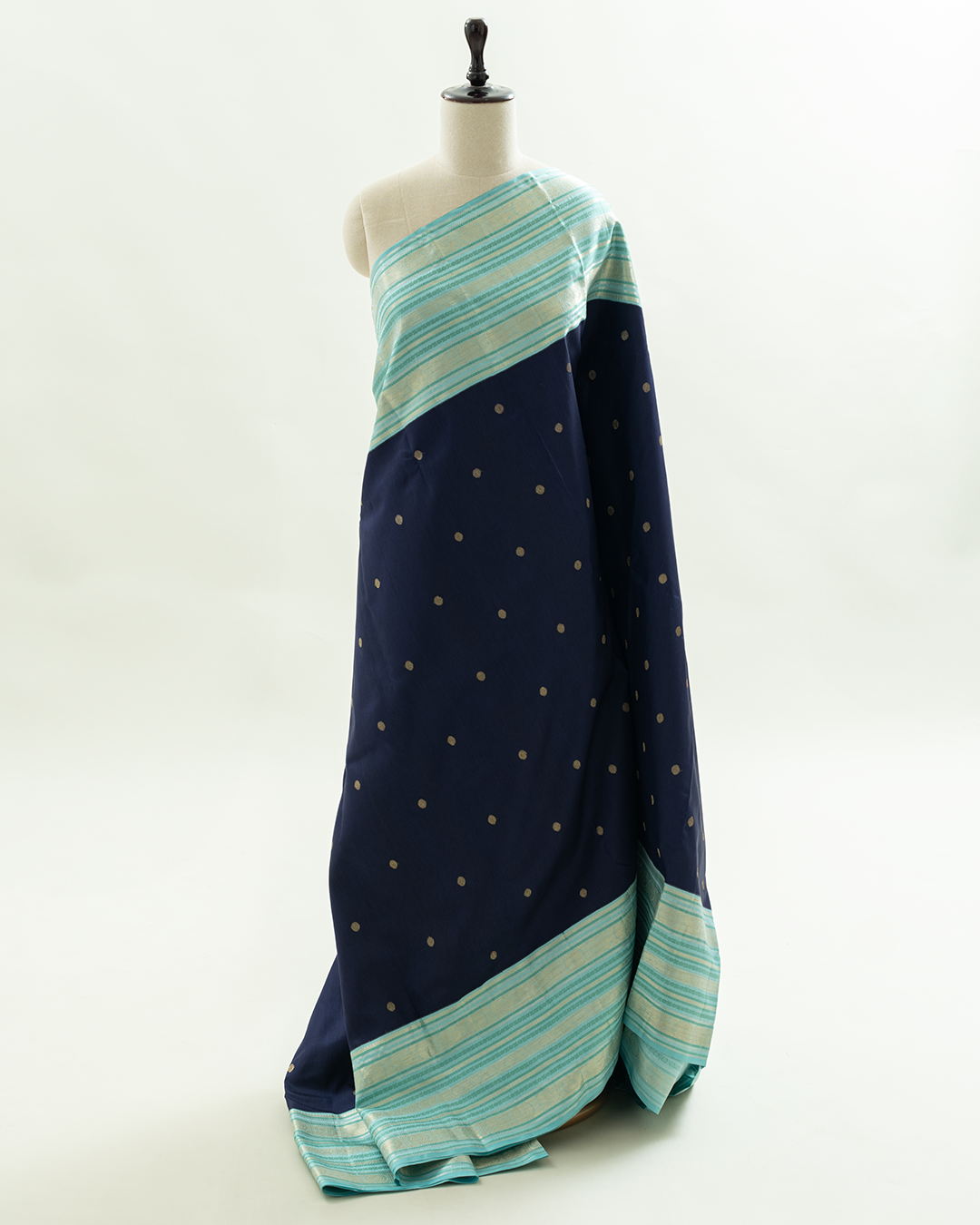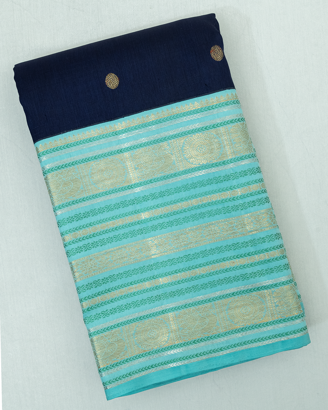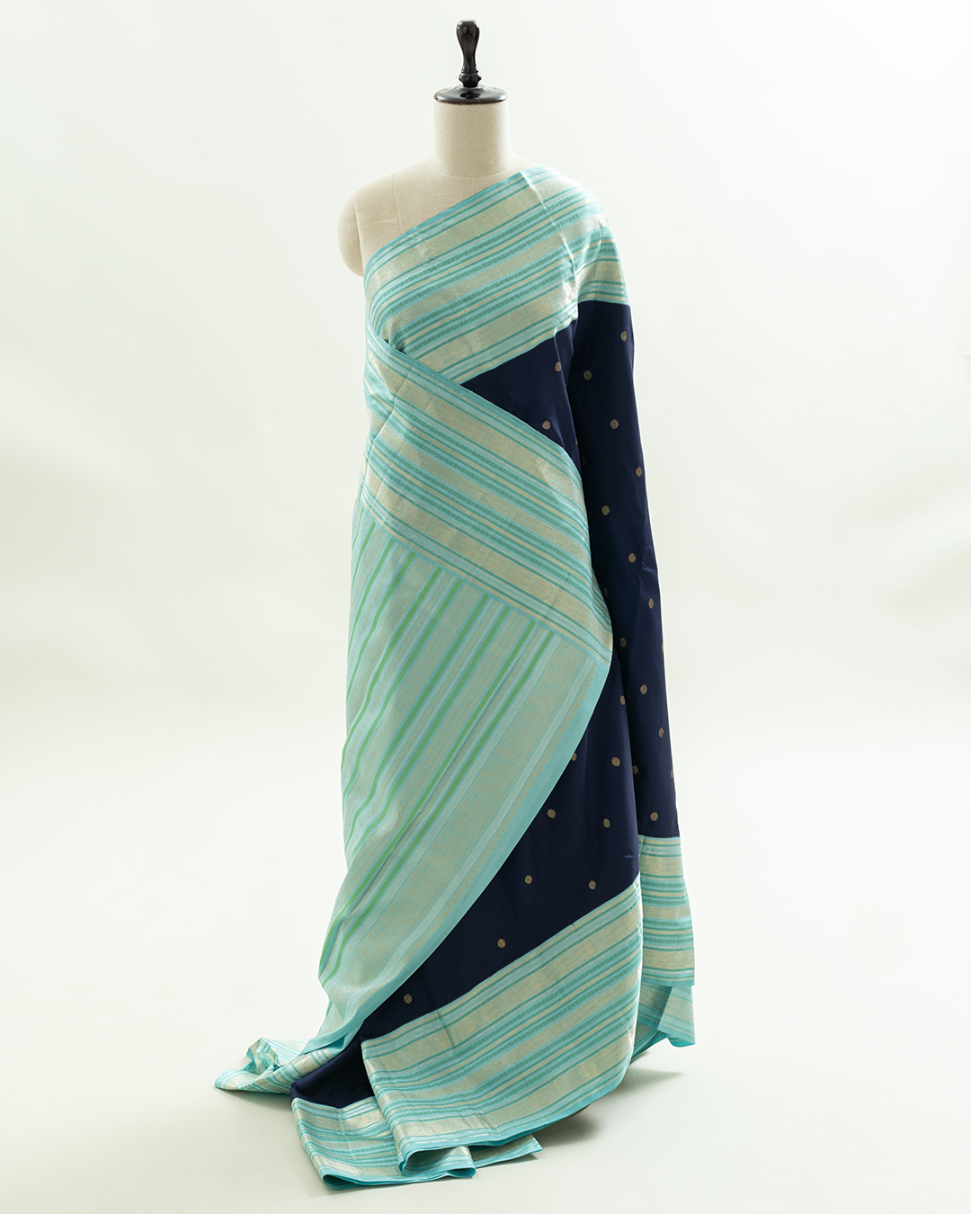 Navy blue handloom silk body featuring golden zari buttas, elegantly finished with a contrasting sky blue border and shimmering silver zari horizontal stripes.