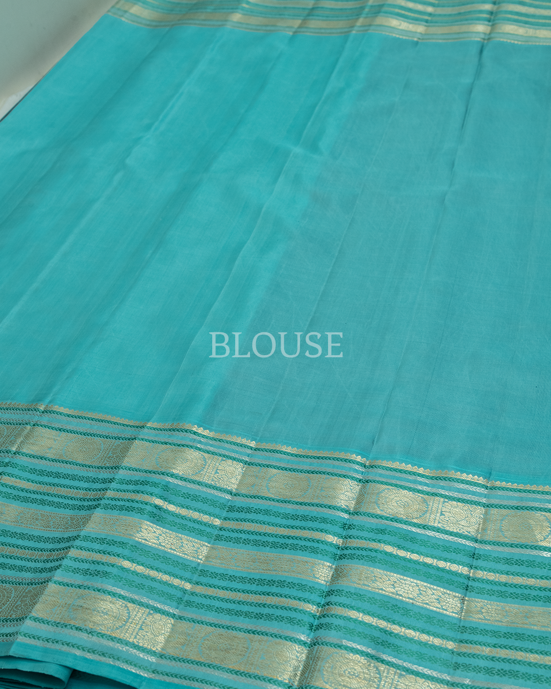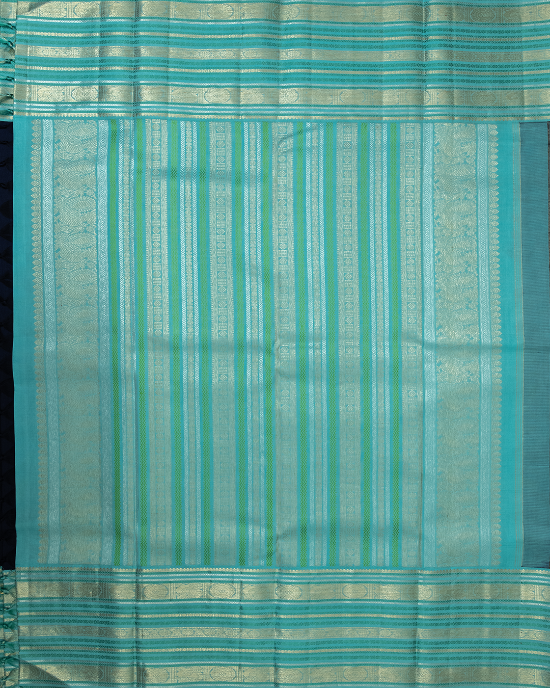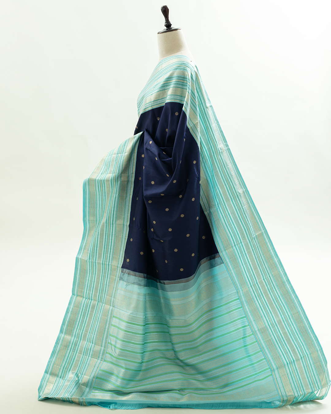 Navy blue handloom silk body featuring golden zari buttas, elegantly finished with a contrasting sky blue border and shimmering silver zari horizontal stripes.