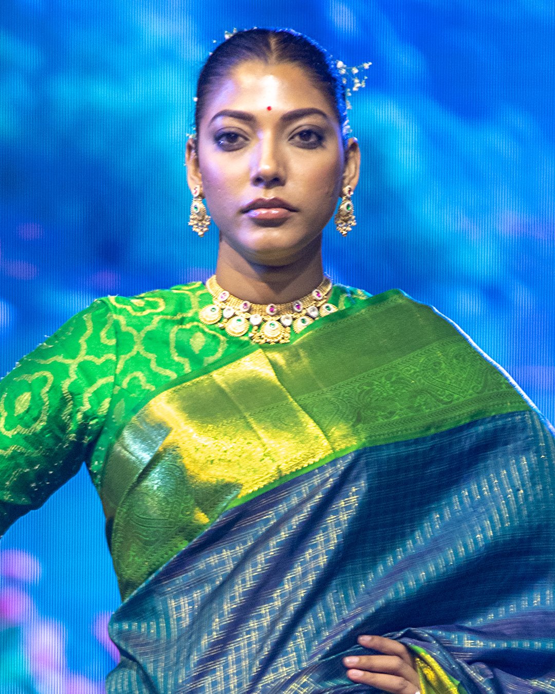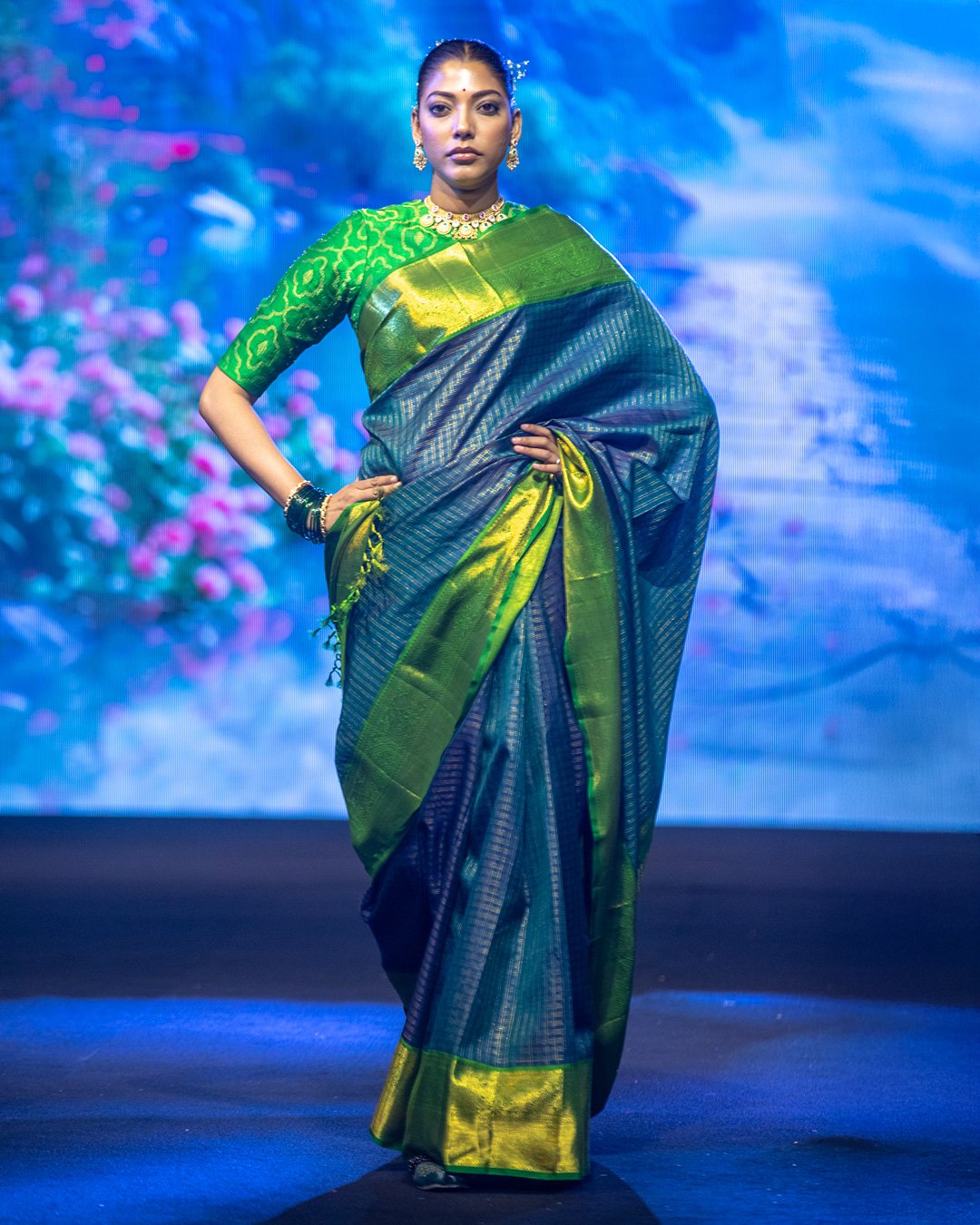 Blue-black Kanjivaram silk saree with an emerald green interlocked Korvai border and pallu, featuring subtle vertical stripe patterns on the body.